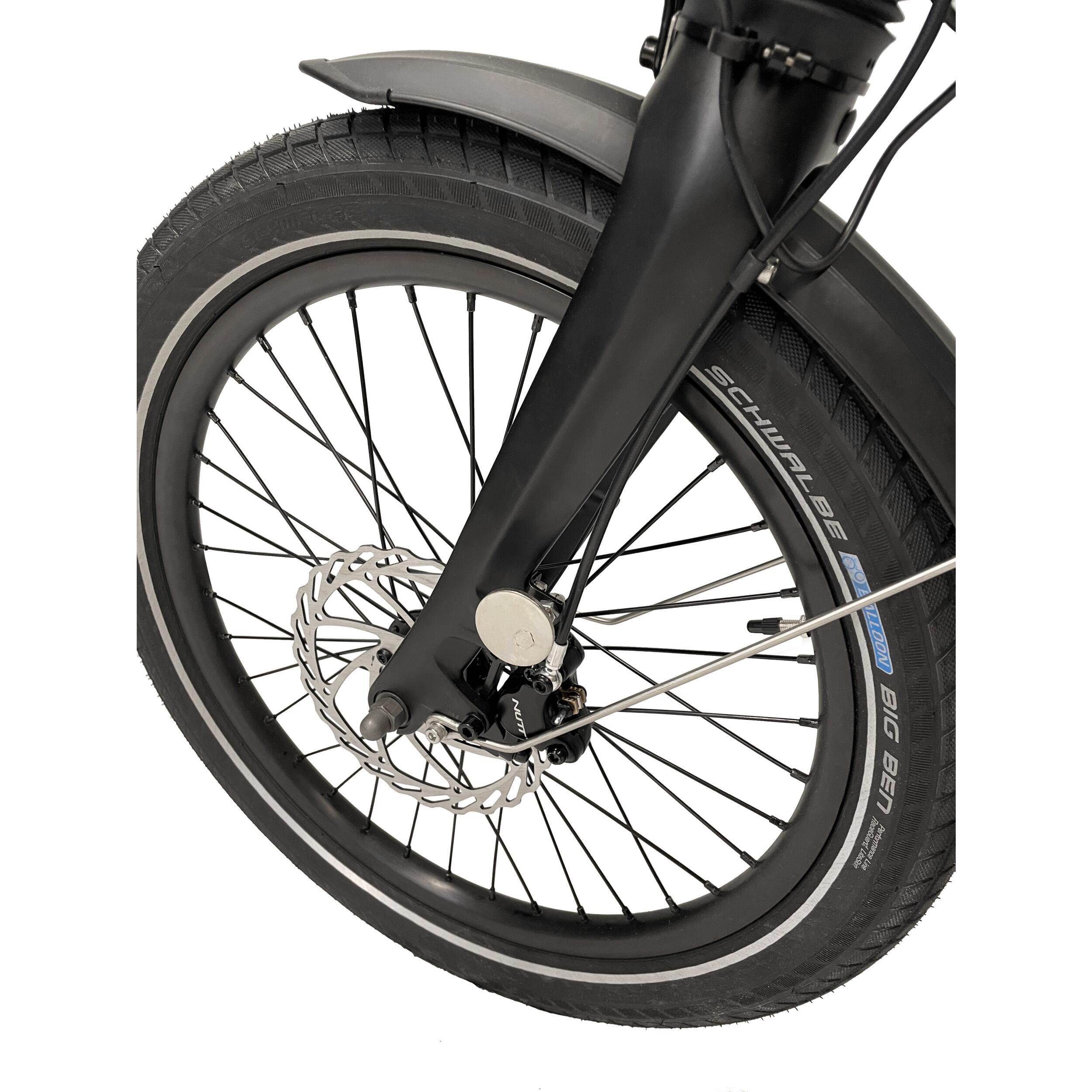Vélo électrique pliant puissant et confortable avec batterie intégrée, moteur arrière, freins hydrauliques et grande autonomie, idéal pour les voyageurs nomades et urbains.