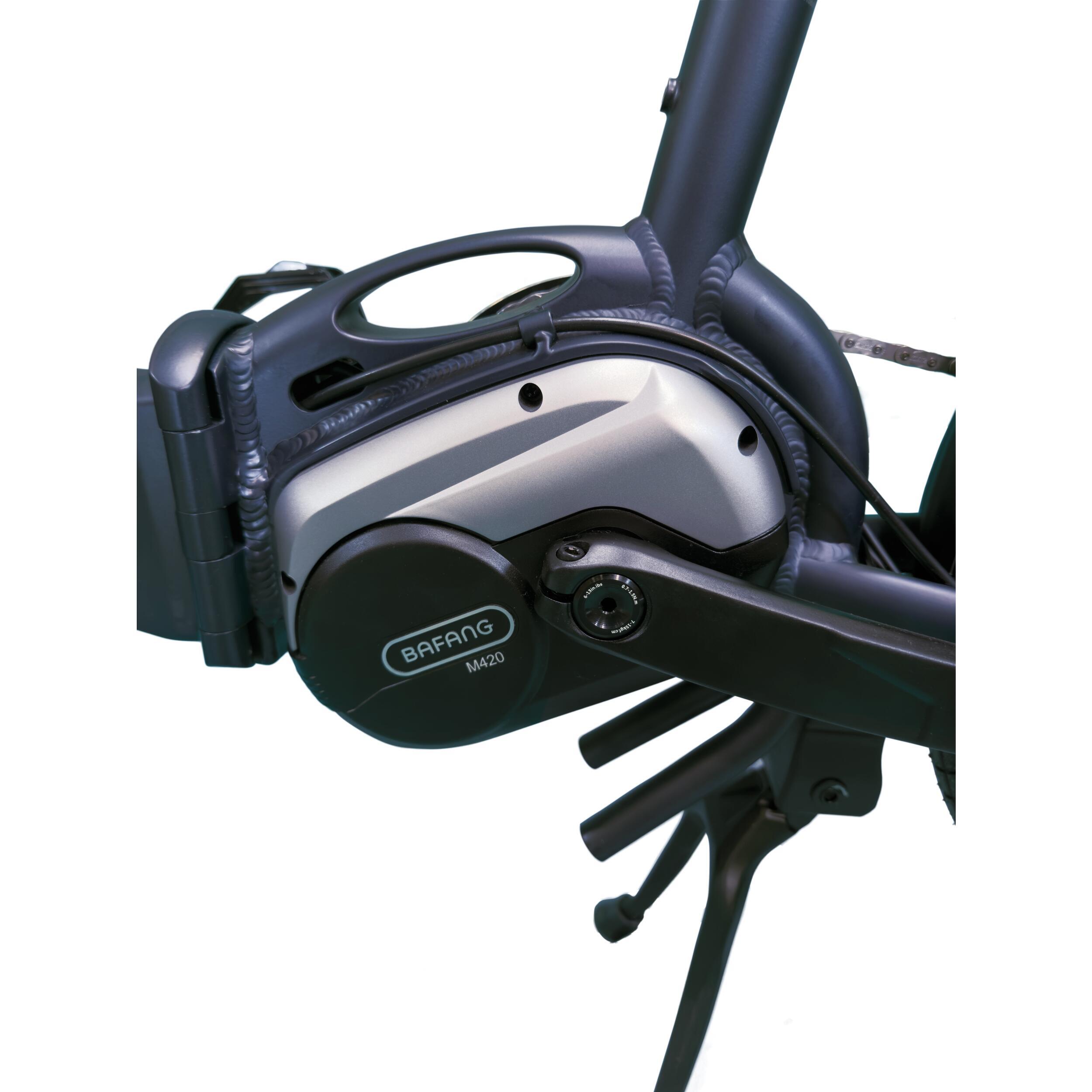 Le Muzy 20" est équipé d’un moteur central BAFANG M420 associé à un moyeu à vitesses intégré. Cette configuration permet une répartition des masses équilibrée et un centre de gravité bas, favorisant une conduite maniable et sécurisante.
