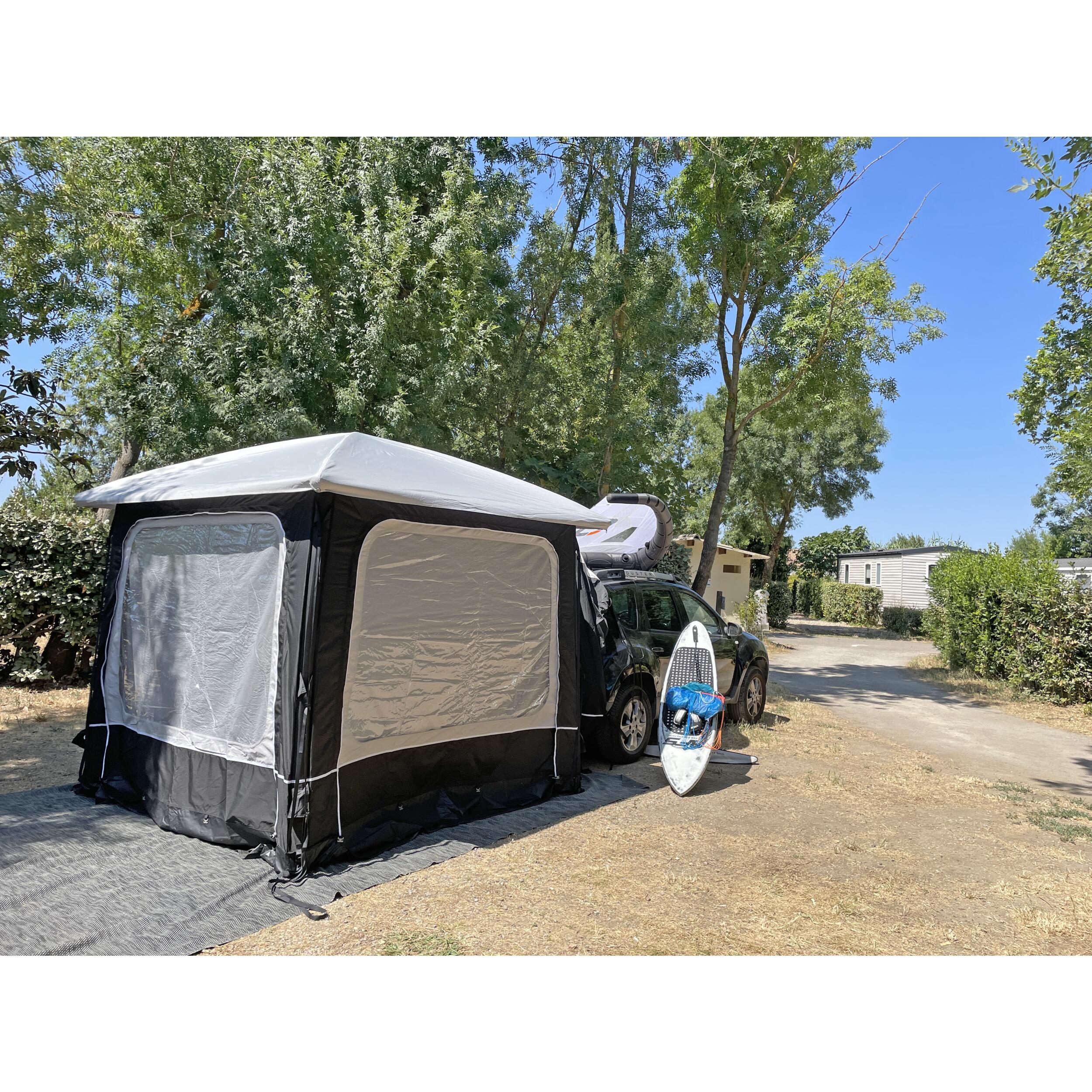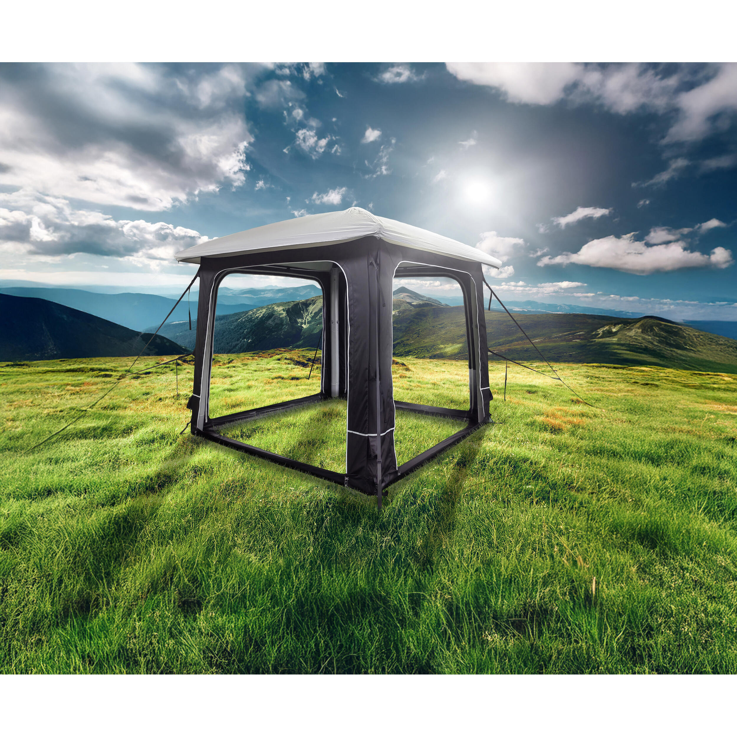 Fabriqué en polyester 300D, l'abri Lodge Air est conçu pour résister aux intempéries et offrir une durabilité exceptionnelle. Que ce soit sous la pluie, le vent ou le soleil, cet abri maintient sa robustesse et sa fonctionnalité. Le toit gris clair est spécialement conçu pour refléter le soleil, gardant ainsi l'intérieur de l'abri plus frais même lors des journées ensoleillées. De plus, chaque coin est équipé d'une sangle anti-vent pour assurer une stabilité maximale, même par temps venteux.