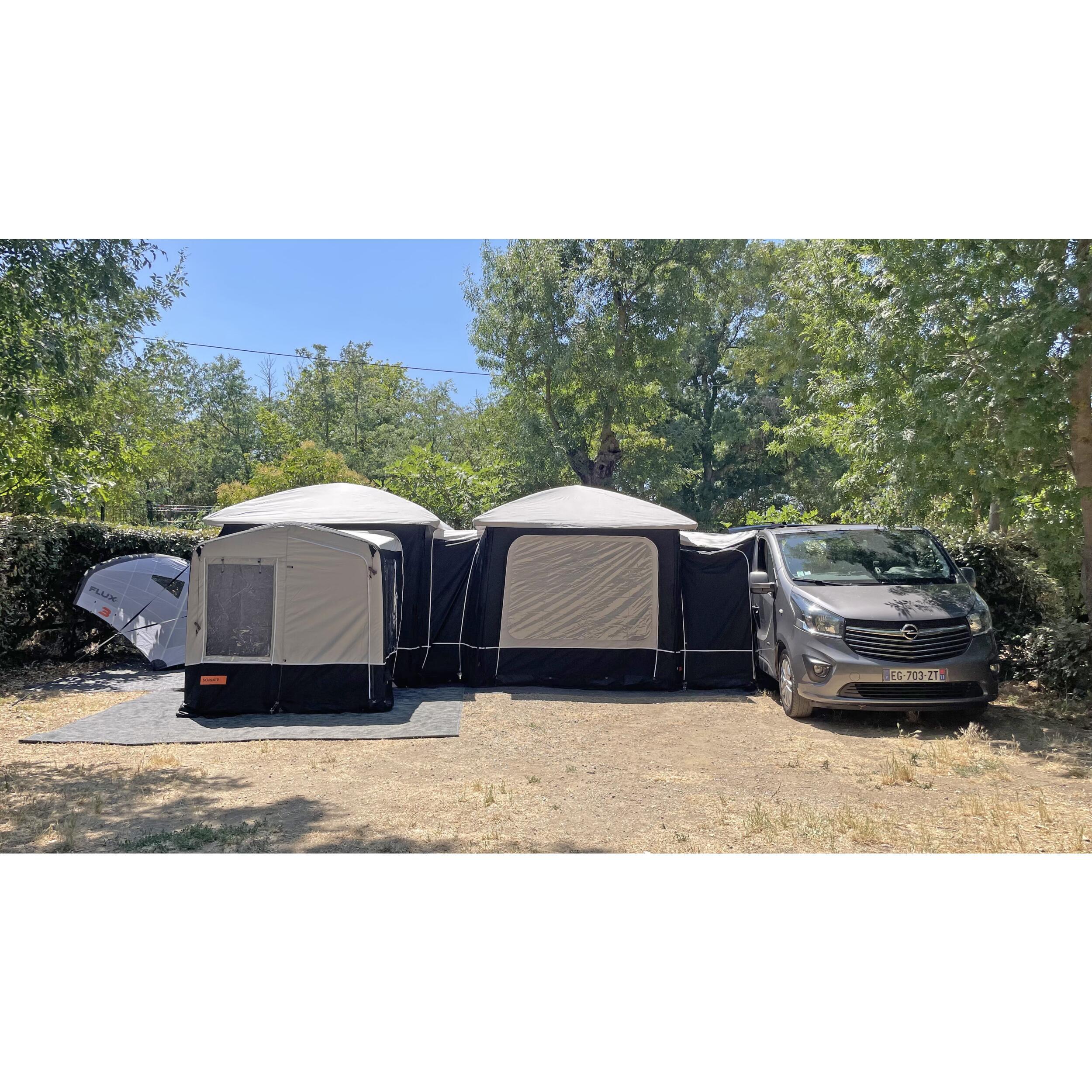 L'un des grands atouts de l'abri Lodge Air est sa modularité. Vous pouvez l'utiliser seul de manière indépendante pour un espace supplémentaire ouvert, ou vous pouvez le personnaliser en ajoutant de nombreux accessoires en option pour répondre à vos envies et besoins. Par exemple, pour ceux qui souhaitent encore plus d'espace, il est possible d'ajouter des pièces annexes telles qu'une chambre supplémentaire ou une cuisine, ou même de connecter deux abris ensemble à l'aide du connecteur en option. Des tunnels de raccordement ont également été créés pour relier l'abri directement à votre véhicule. Cette flexibilité vous permet de créer un espace sur mesure qui, grâce à la forme originale de son toit, ressemblera à une vraie petite maison !