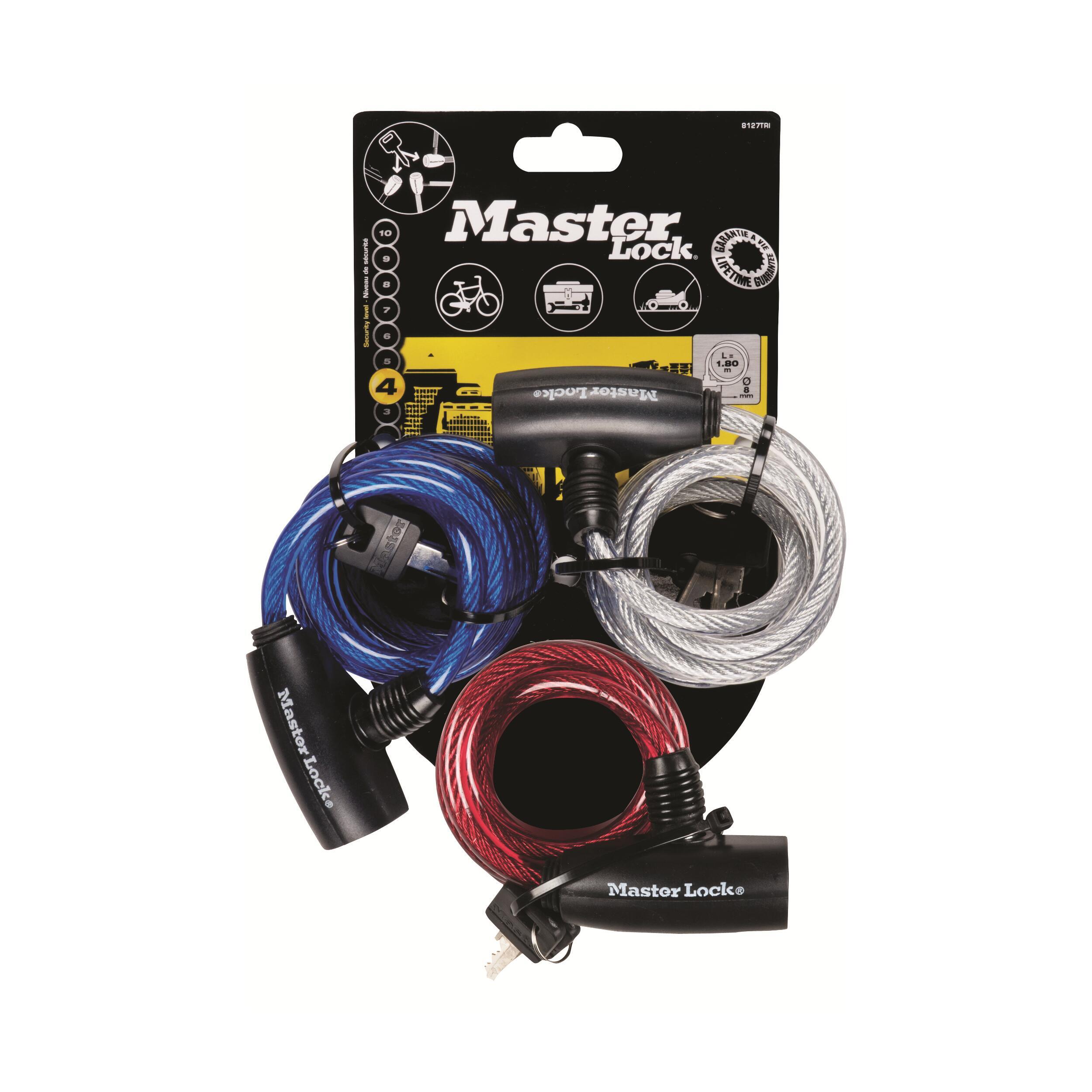 Lot de 3 câbles antivol à clé multi-usages de 1,8 m de long et 8 mm de diamètre.Cables en acier torsadé pour une résistance et une flexibilité maximales. Mécanisme de verrouillage à goupilles contre le crochetage. Protection vinyle anti éraflures. Les clés ouvrent les 3 serrures.