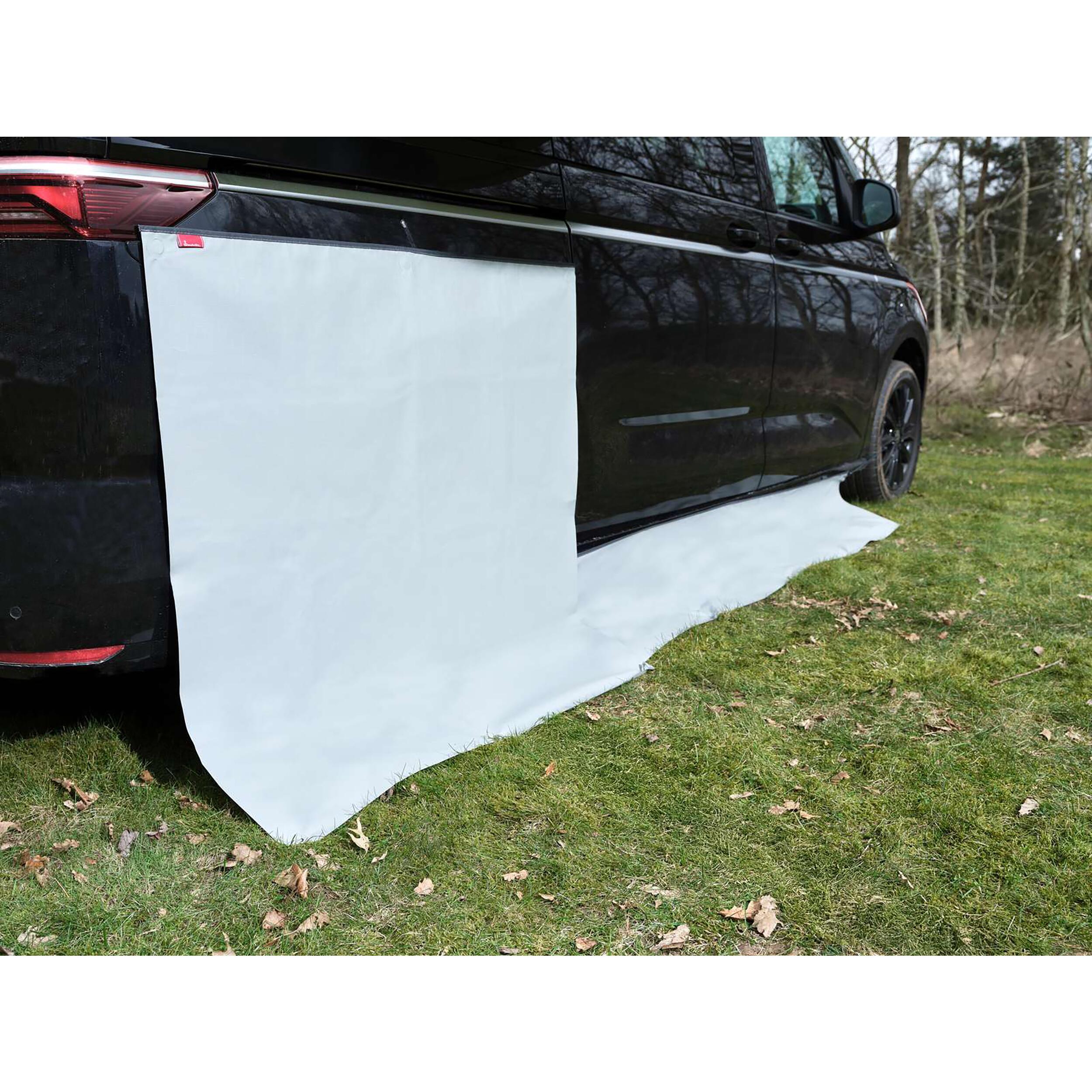 La mise en place est rapide, même en solo. Vous adaptez la jupe à la hauteur de votre véhicule, vous la positionnez entre les roues, vous fixez les ventouses… et le tour est joué ! Pratique en voyage, ce système permet également un démontage tout aussi rapide, pour une modularité parfaite en fonction de vos étapes ou de la météo.