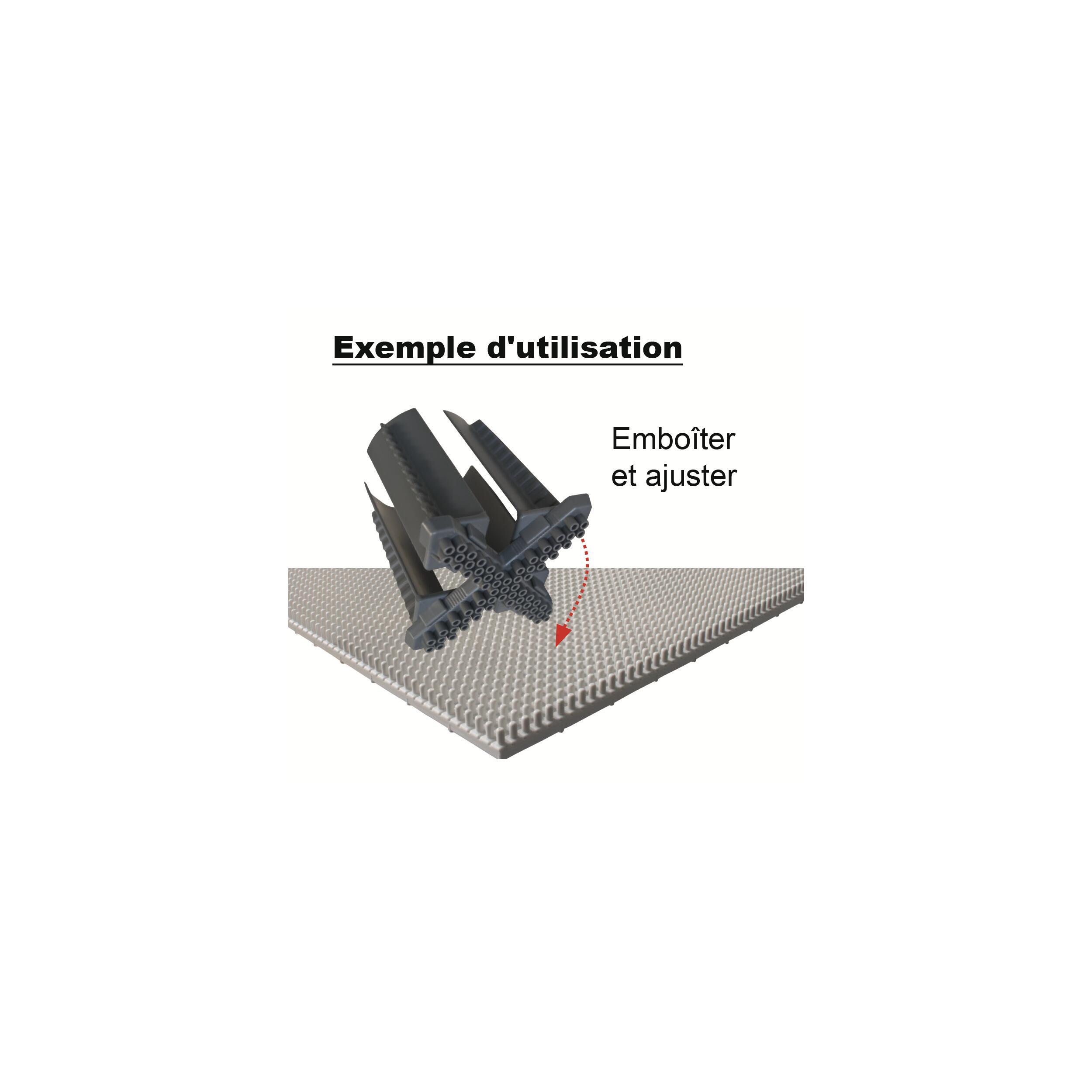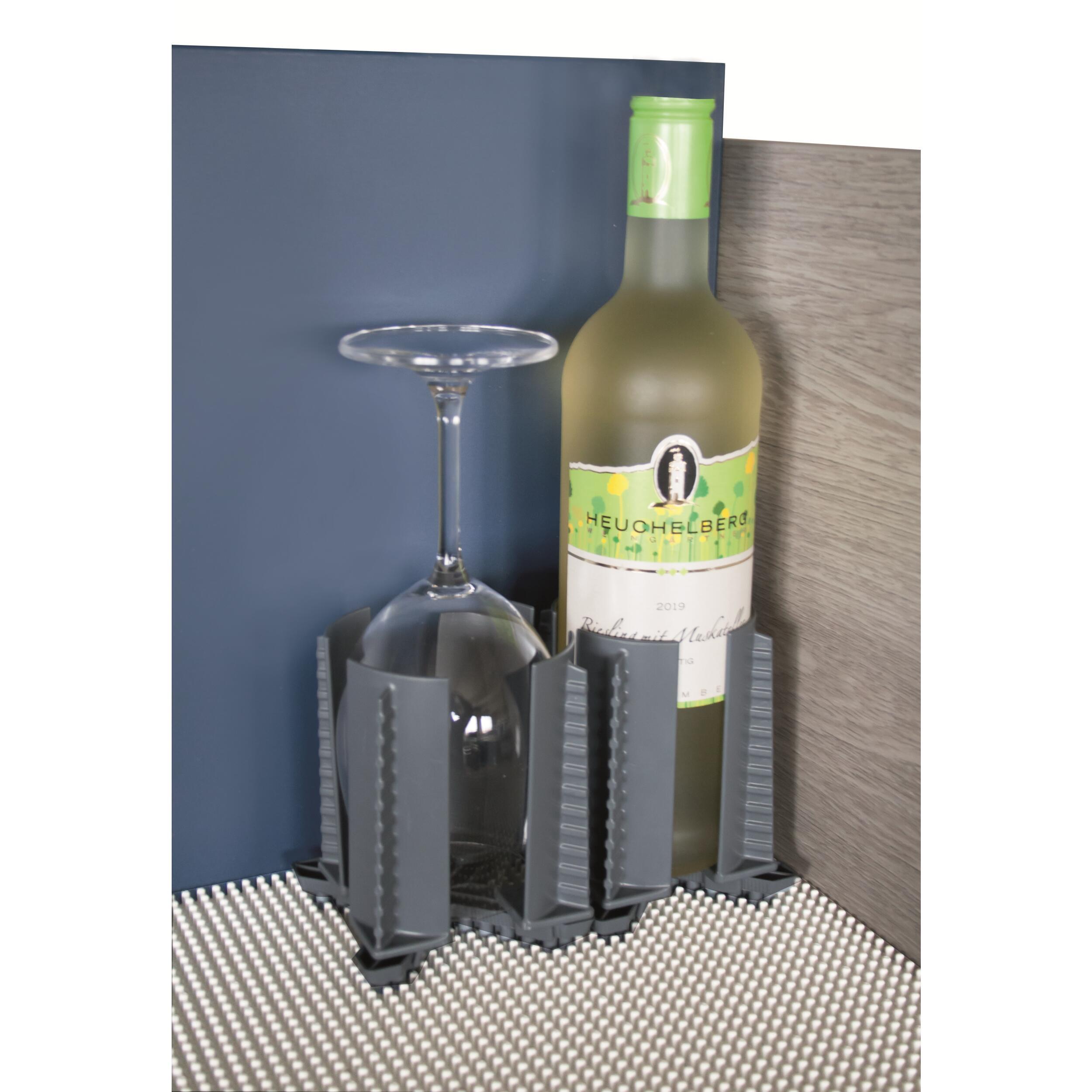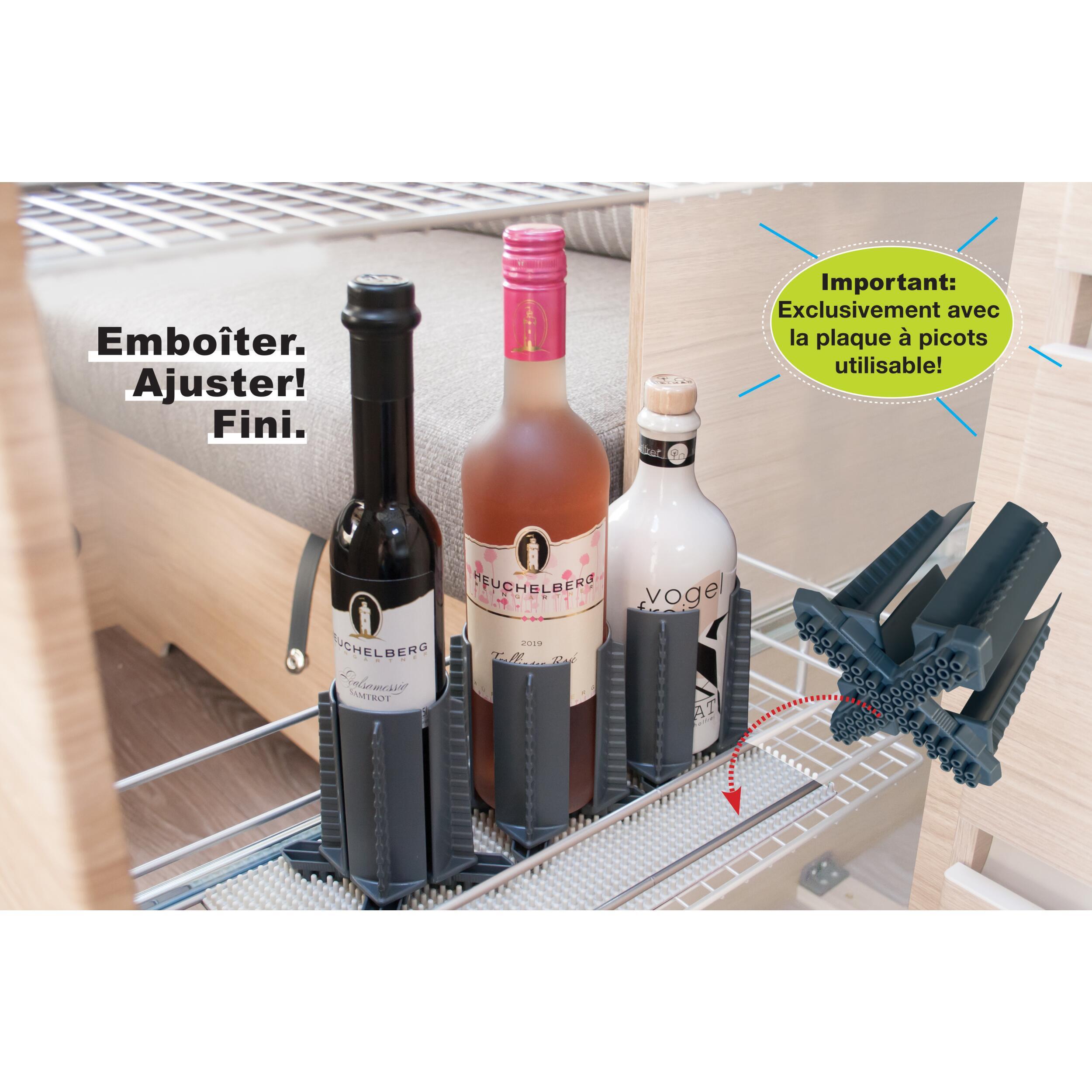 Le FLEXXI 100 se distingue par sa facilité d'utilisation. Une fois la taille de la bouteille ajustée, il suffit d'emboîter le porte-bouteilles sur la base choisie, comme le tapis à clous ON TOP ou le support de table CLIP CLAP. Cet accessoire est parfait pour une utilisation dans les tiroirs, compartiments de rangement, ou même dans une armoire à pharmacie, grâce à ses possibilités d'insertion flexibles et repositionnables.