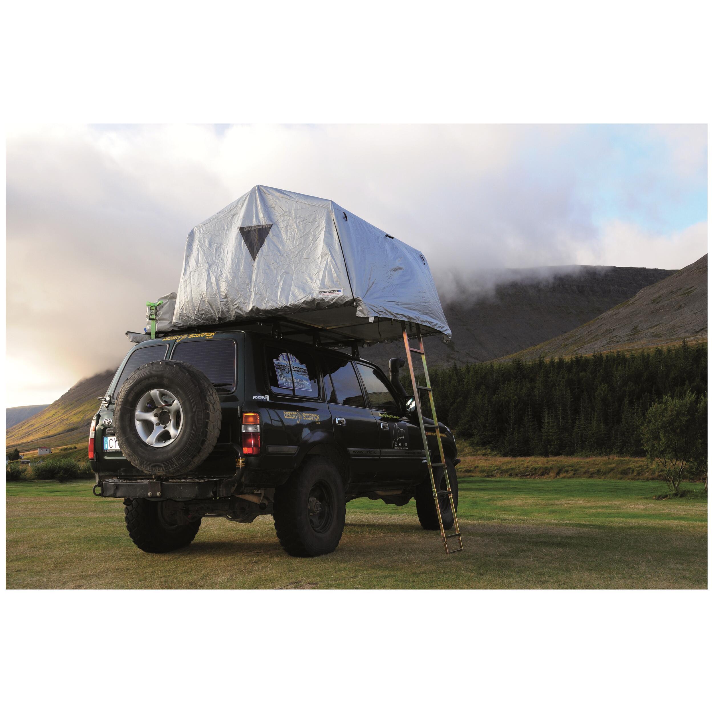 En nylon résiné et poudre d'aluminium, le capuchon « hiver » apporte une isolation thermique supplémentaire très efficace. Il comprend une fenêtre avec moustiquaire et une porte latérale. Peu encombrant et léger, il peut rester monté en permanence même lorsque la tente est fermée.