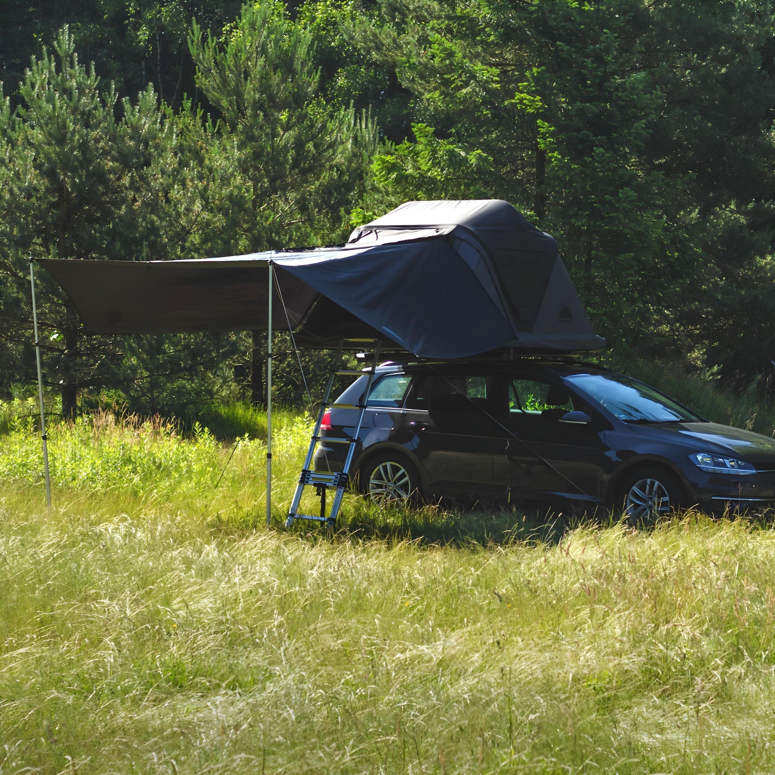 Grâce à ses tiges télescopiques réglables en hauteur, ce store s’ajuste facilement à votre configuration souhaitée. Vous pouvez moduler la hauteur selon vos besoins, que ce soit pour suivre la course du soleil ou optimiser l’espace selon les conditions du terrain. L’installation est tout aussi simple que son ajustement : une fixation rapide et efficace directement sur la tente de toit vous permettra de profiter instantanément de votre abri.