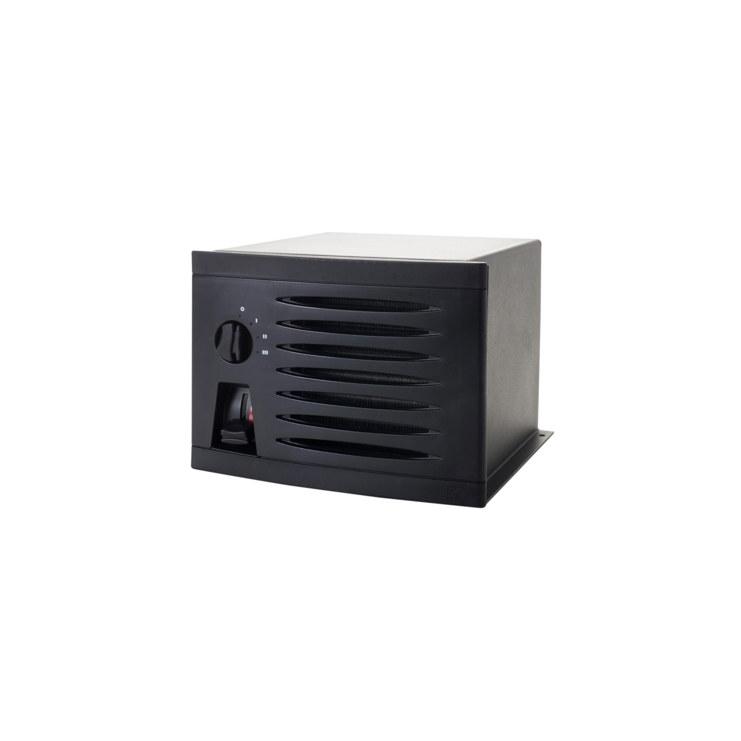 Aérotherme compact, à fixer sur une paroi, avec ventilation à 3 vitesses. Le commutateur de ventilation et la commande de vanne de chauffage sont intégrés dans la façade. Il suffit de raccorder les tuyaux d'alimentation et de départ sur le côté de l'appareil.