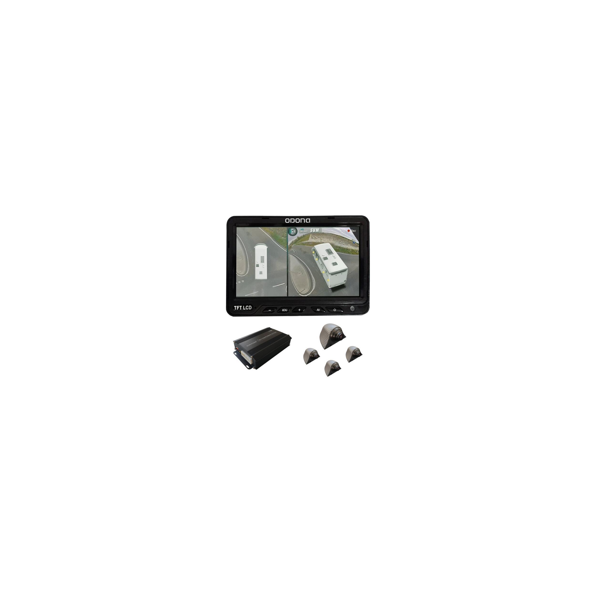 Caméra 360° Drone View Odona pour camping-car : vision panoramique sans angle mort, fonctionnement automatique avec clignotants et marche arrière, vue du dessus dynamique, enregistrement continu et vision nocturne.