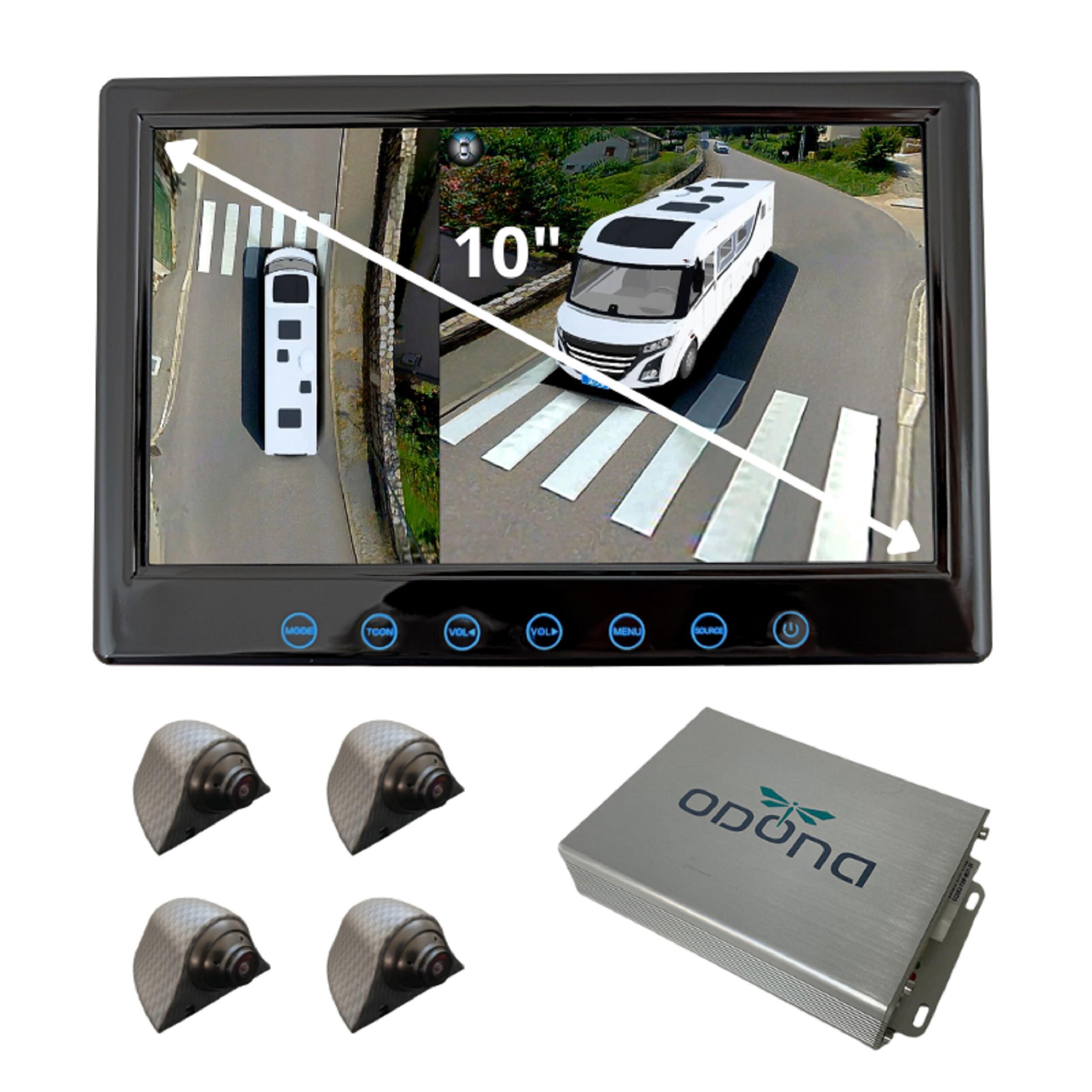 Caméra 360° Drone View Odona pour camping-car : vision panoramique sans angle mort, fonctionnement automatique avec clignotants et marche arrière, vue du dessus dynamique, enregistrement continu et vision nocturne.