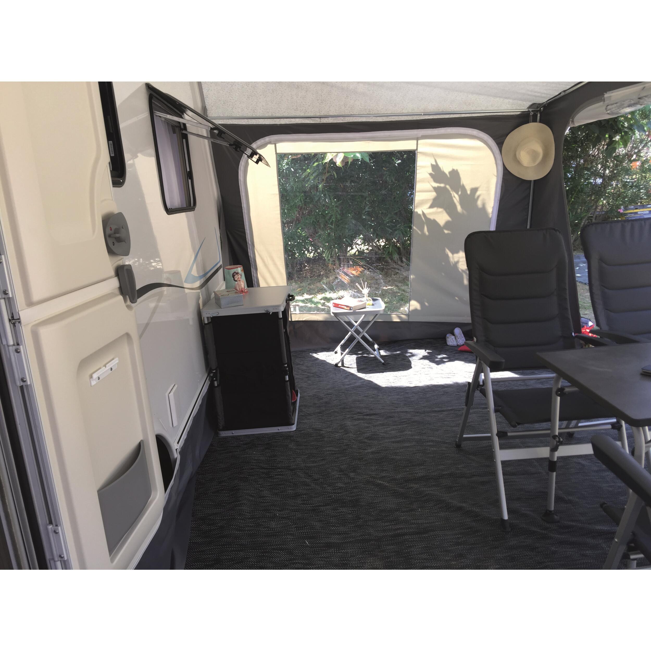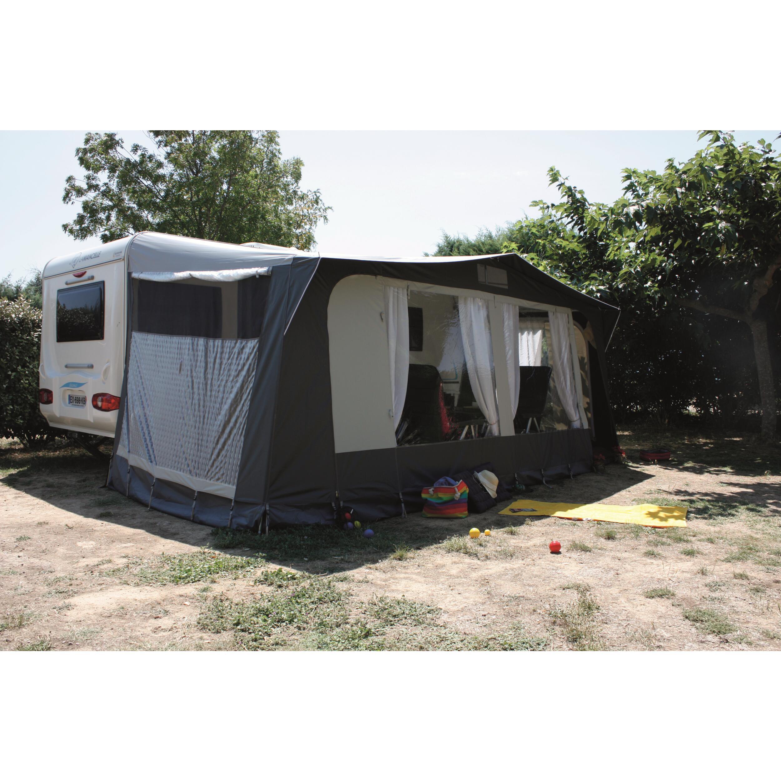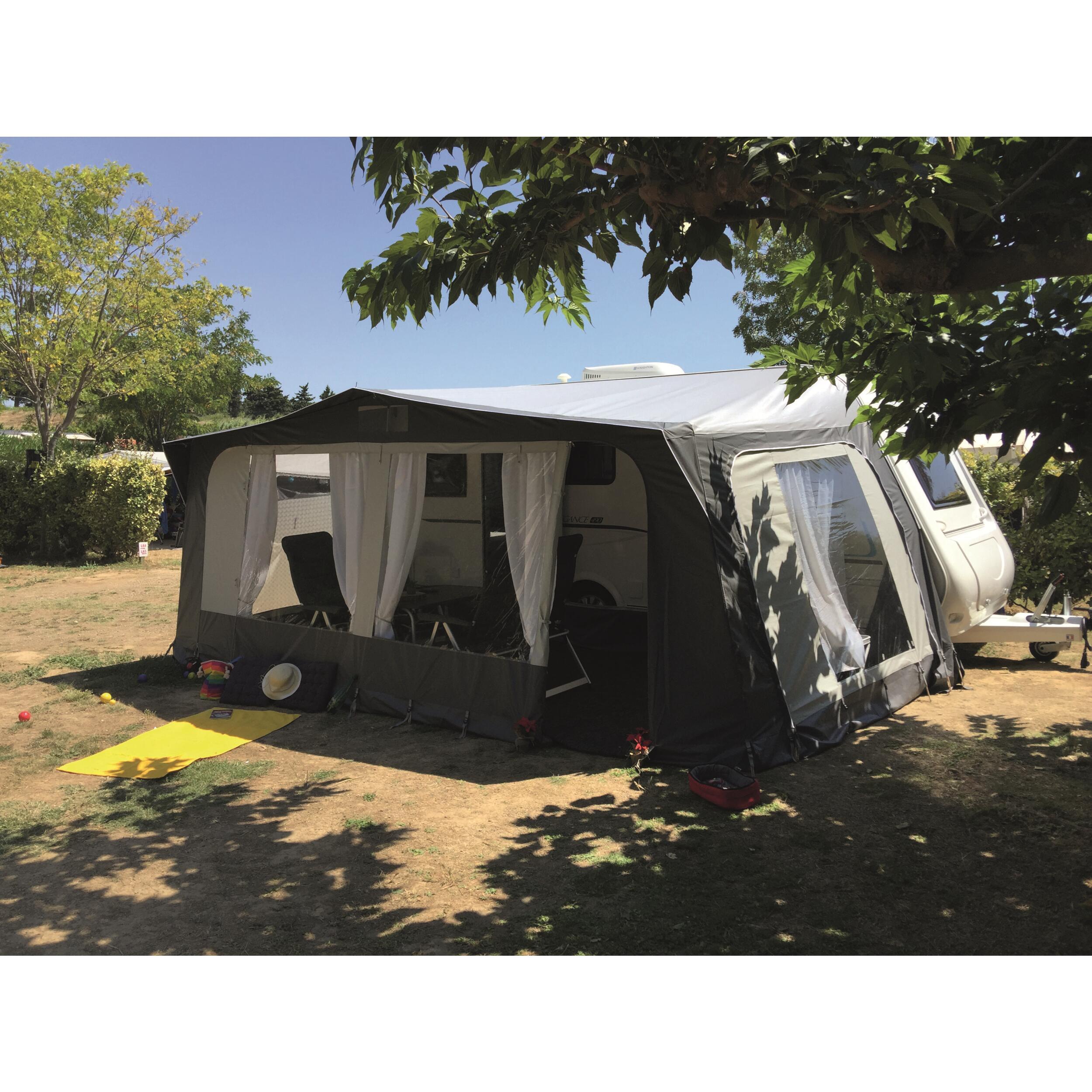 Profondeur 2,40 m plus casquette de 30 cm. Façade relevable. 2 portes en façade. Côté droit détachable avec la possibilité d'adjoindre une pièce annexe (Réf. 850423). Côté gauche muni d'une moustiquaire sur la partie haute équipée d'un volet cathédrale, partie basse en cristal cathédrale. Equipement de série : aération permanente en façade, rideaux, nécessaire de fixation au sol, sacs de rangement toile, armature et accessoires.