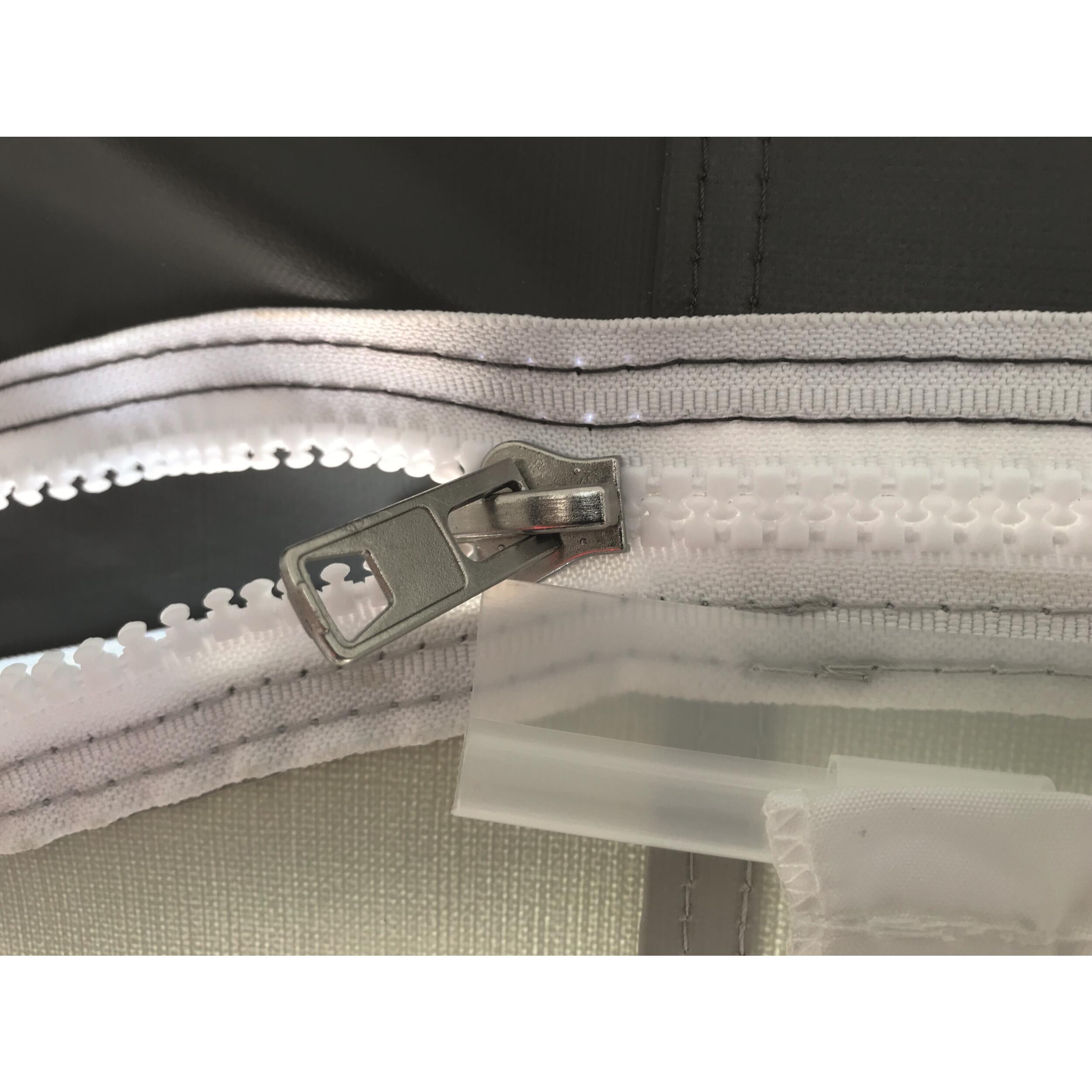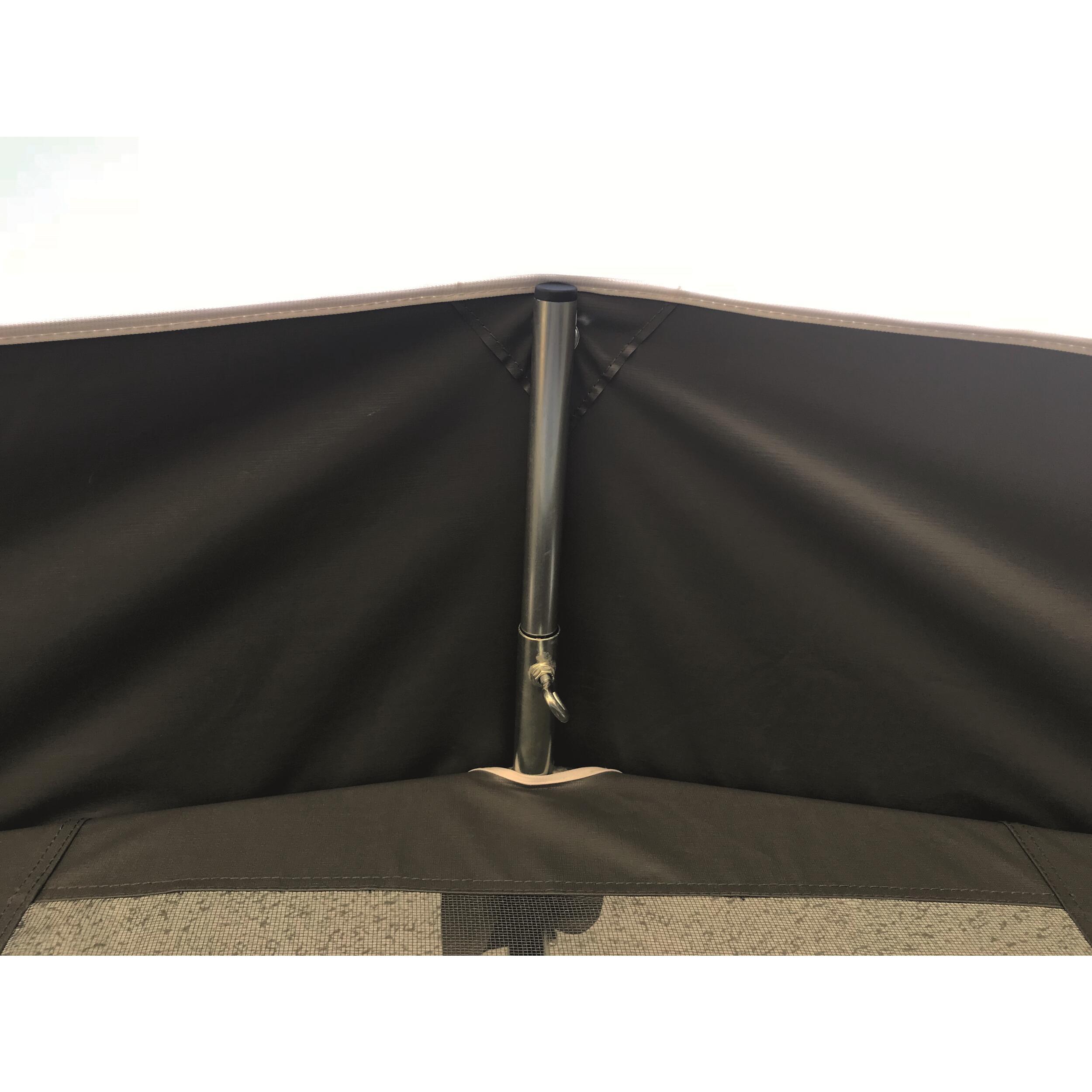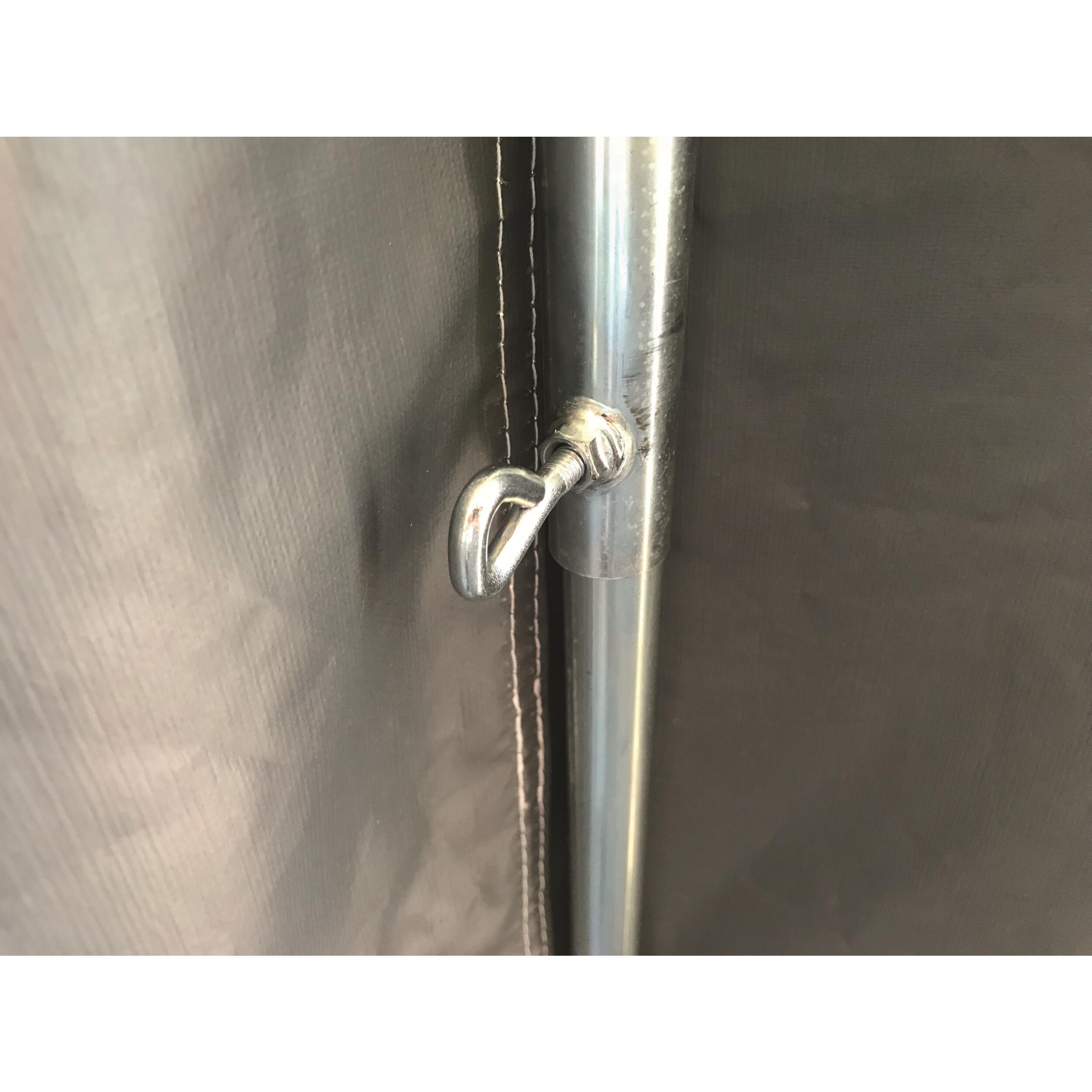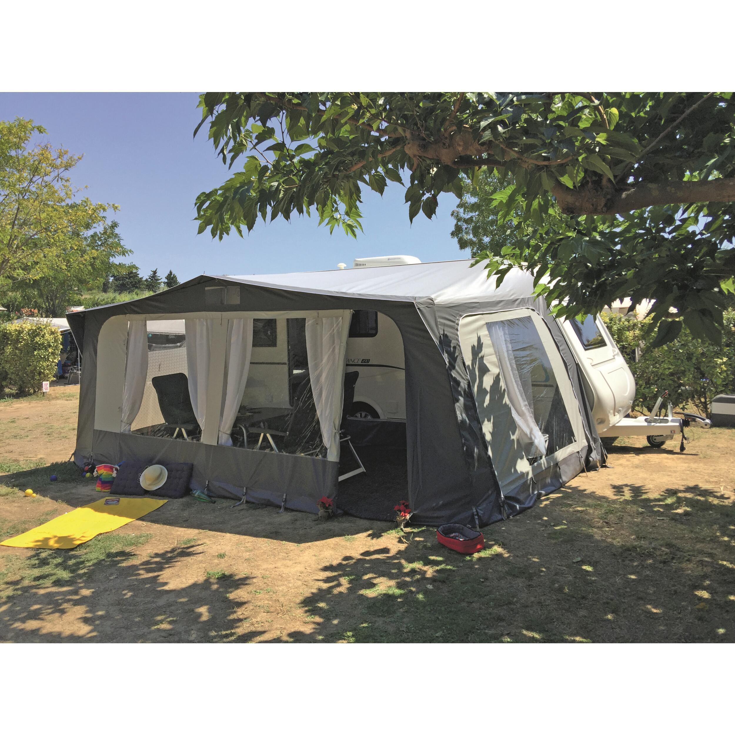 Profondeur 2,40 m plus casquette de 30 cm. Façade relevable. 2 portes en façade. Côté droit détachable avec la possibilité d'adjoindre une pièce annexe (Réf. 850423). Côté gauche muni d'une moustiquaire sur la partie haute équipée d'un volet cathédrale, partie basse en cristal cathédrale. Equipement de série : aération permanente en façade, rideaux, nécessaire de fixation au sol, sacs de rangement toile, armature et accessoires.