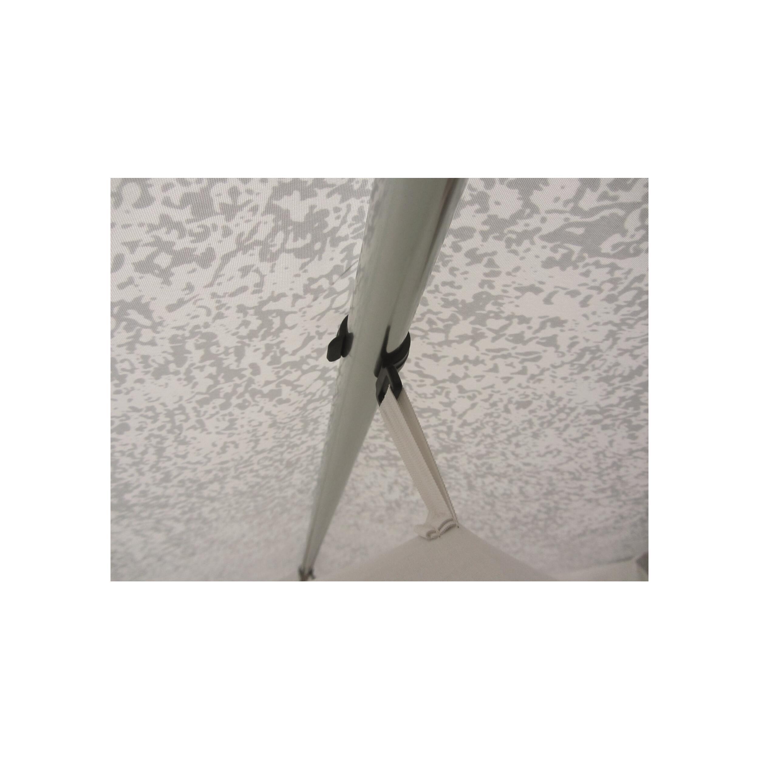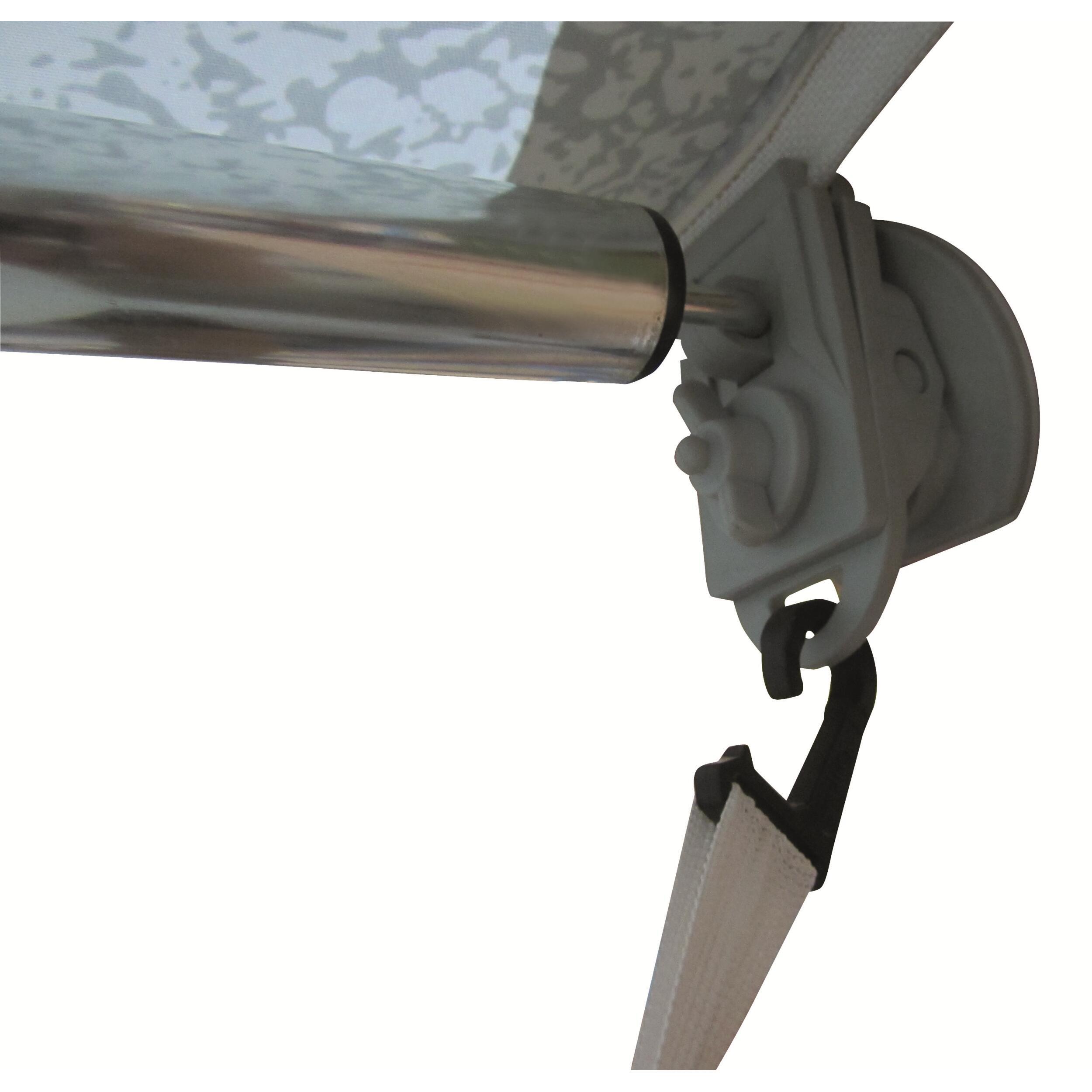 En coton couleur crème. La fixation se fait tout le long des faîtières grâce à des crochets venant se clipser sur les tubes. Côté caravane, le vélum s'attache directement sur les crochets-tampons. Des élastiques à chaque crochet aident à la mise en place et à l'ajustement du vélum.