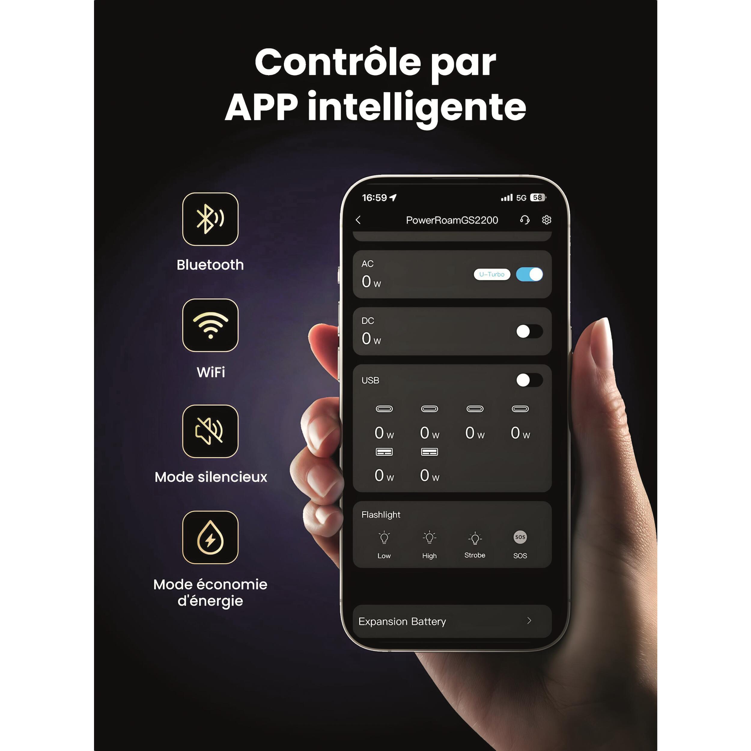 Avec ses dimensions de 45 x 25 x 24 cm et un poids de 19 kg, la batterie EB2200 est compacte et facile à transporter, malgré sa grande capacité énergétique. Livrée avec un câble d’extension pour une connexion immédiate à la GS2200, elle s’installe en toute simplicité et est prête à l’emploi en un rien de temps. Que vous la rechargiez via prise secteur, panneaux solaires ou allume-cigare, elle s'adapte à toutes vos situations de mobilité.
