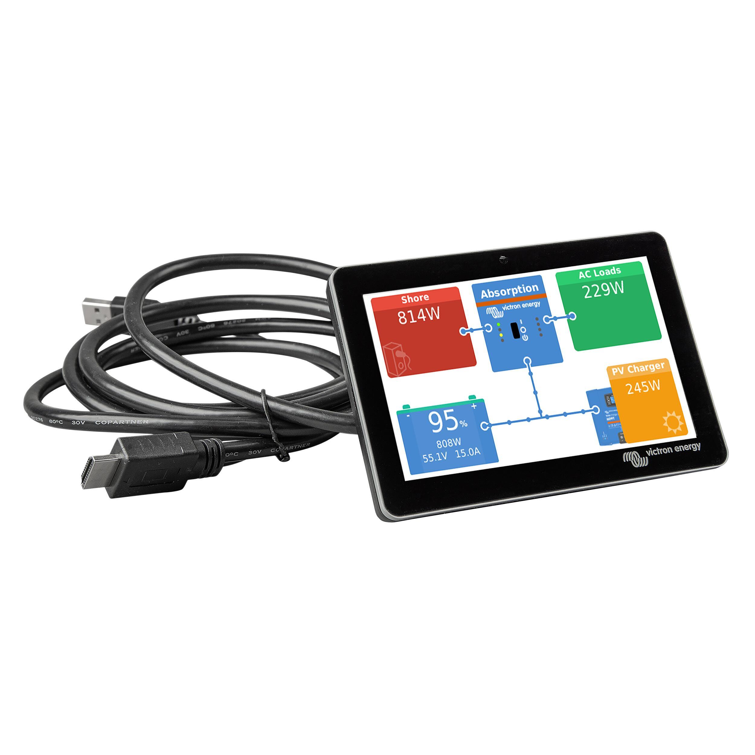 Ces écrans sont spécialement conçus pour une intégration simple et élégante. Connectés au Cerbo GX via un seul câble, les GX Touch éliminent le besoin de configurations complexes et de câblage encombrant. Leur conception ultra fine et étanche, ainsi que leur possibilité d’être montés sur le dessus, rendent l'installation à la fois flexible et esthétiquement agréable, idéale pour maintenir un tableau de bord net et organisé.