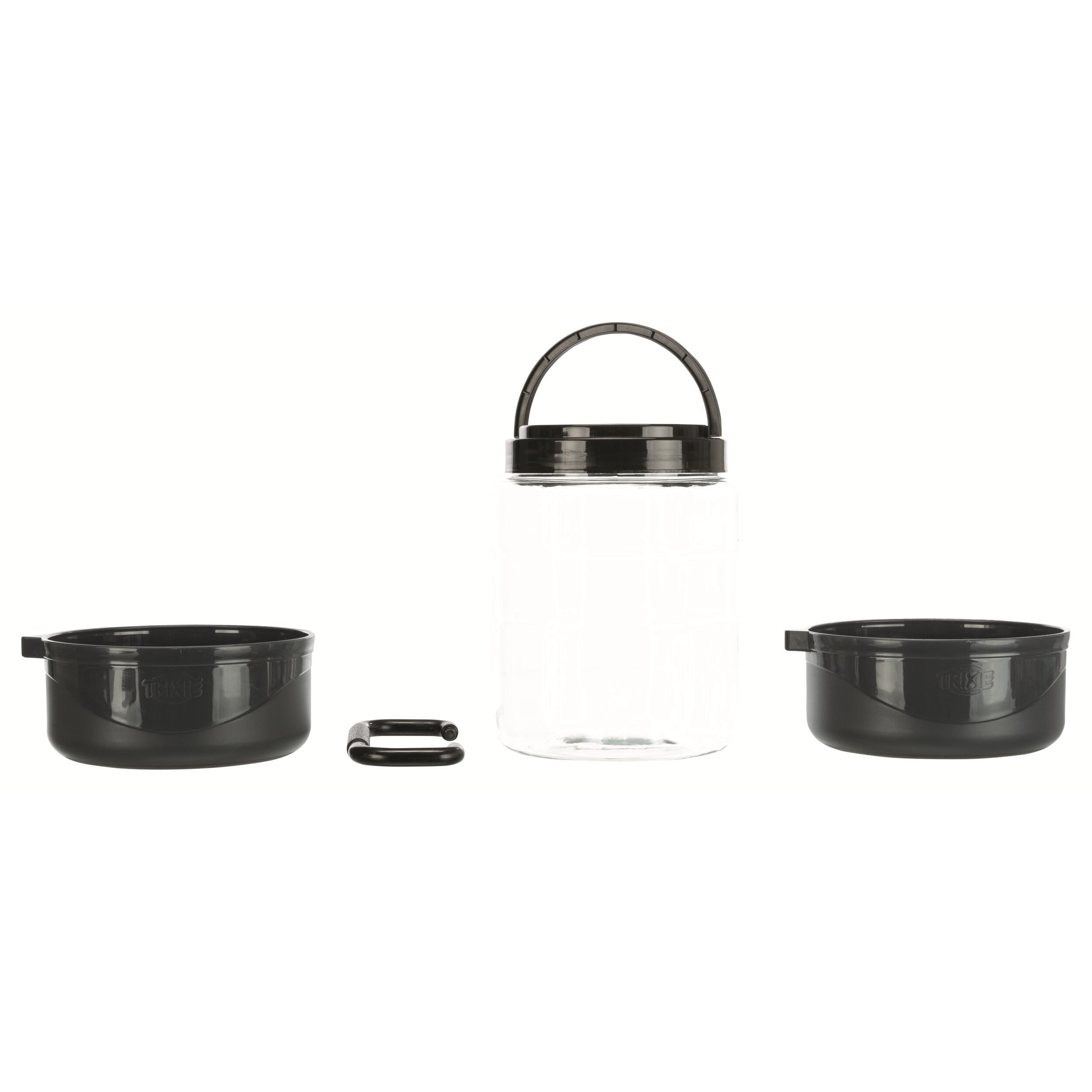 2 gamelles de 0,75 litres avec une base en caoutchouc antidérapante qui s’empilent sur un bocal en plastique de 2 L pour transporter les aliments. Ce dernier se ferme de façon hermétique pour préserver la nourriture.