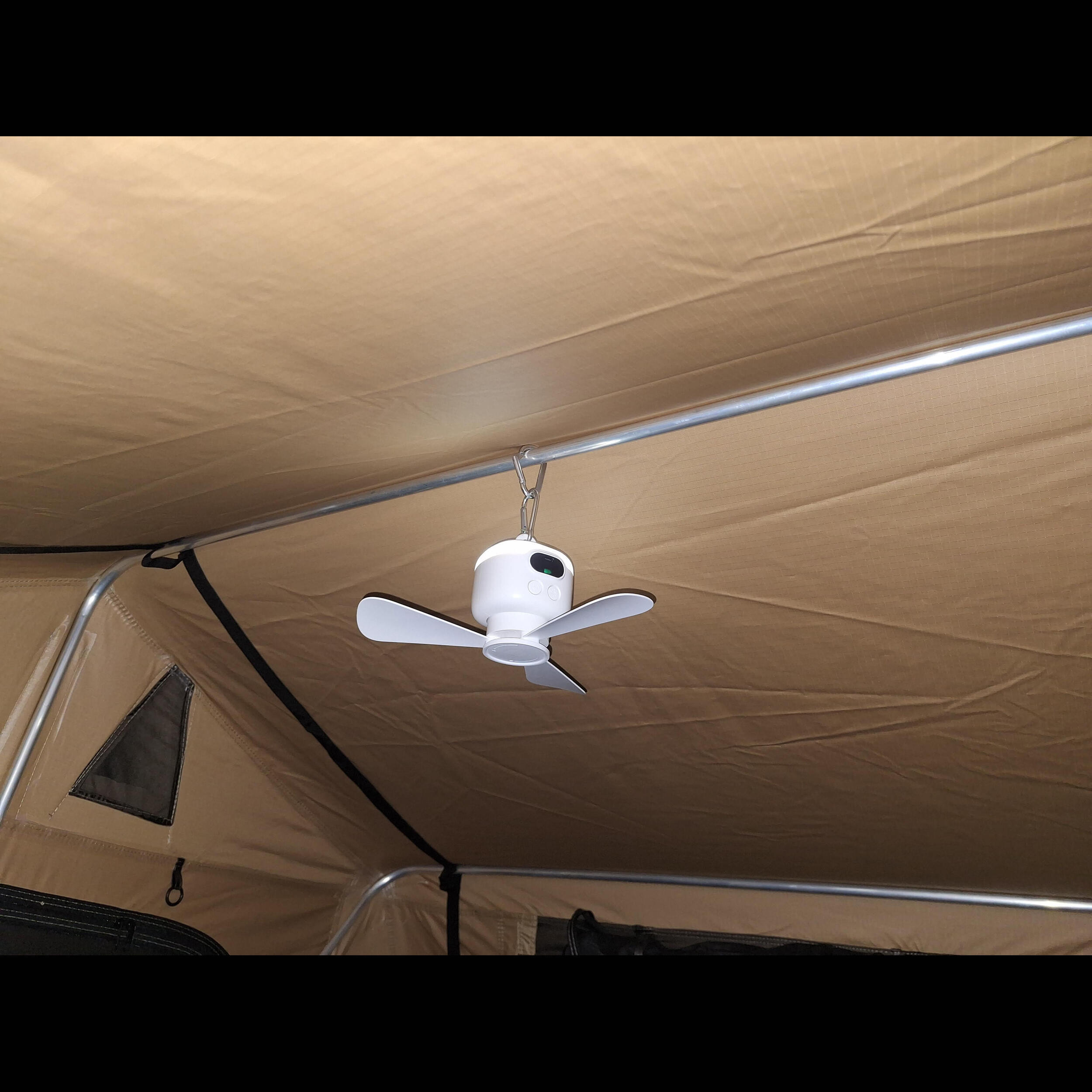 Le ventilateur BayaSun a été conçu pour répondre aux besoins spécifiques des voyageurs itinérants : sa fixation par mousqueton permet une accroche simple et rapide sur la majorité des armatures ou barres de toit. Pour plus de flexibilité, une cordelette courte peut être ajoutée pour l’adapter à tous les diamètres de tube. En quelques secondes, il est opérationnel au-dessus de votre dînette, dans une capucine ou au centre de la tente.