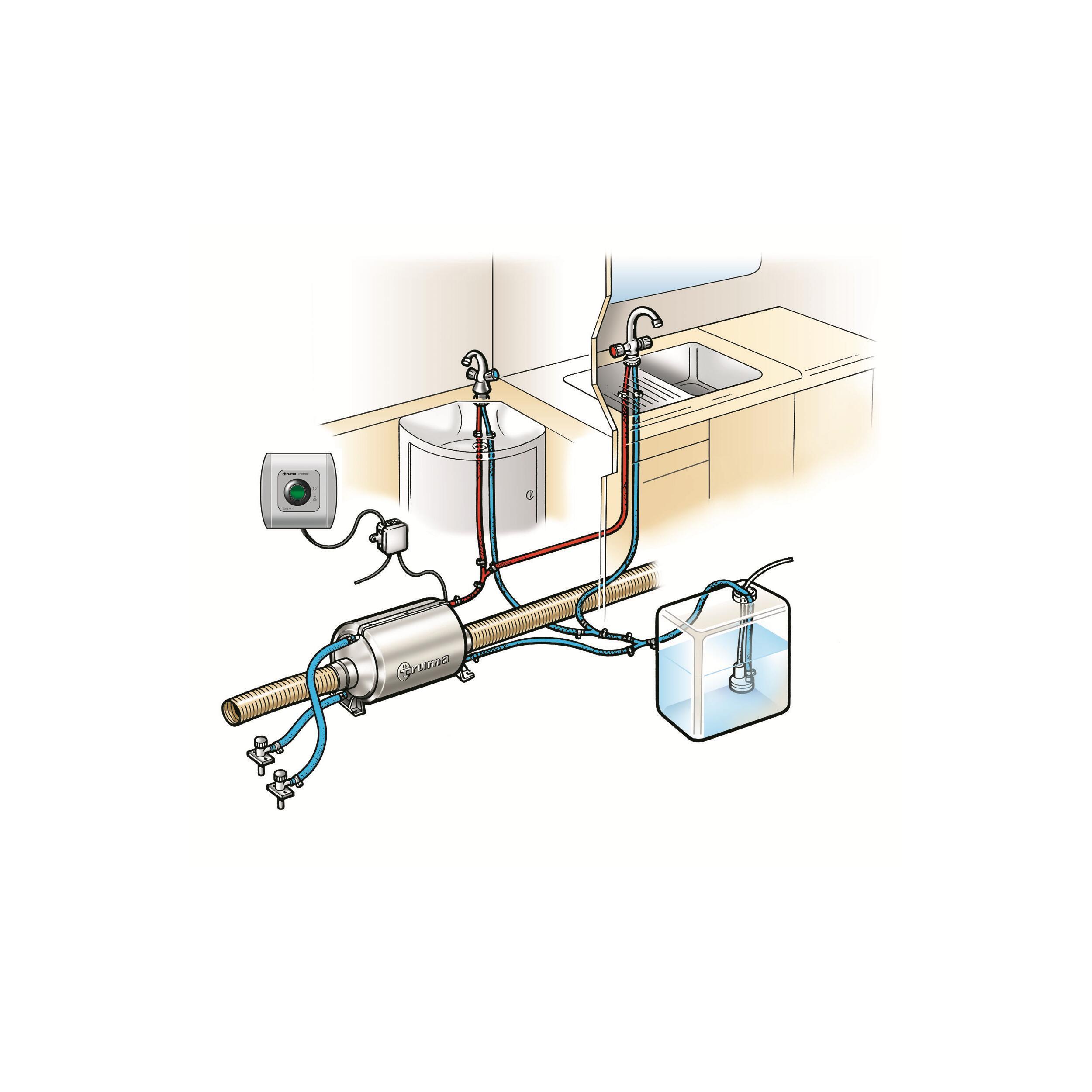 Le Truma-Therme utilise l'air chaud du chauffage pour réchauffer une réserve d'eau de 5 litres. Pour les périodes où le chauffage et le circuit d'air chaud ne sont pas en service un élément chauffant électrique est incorporé.