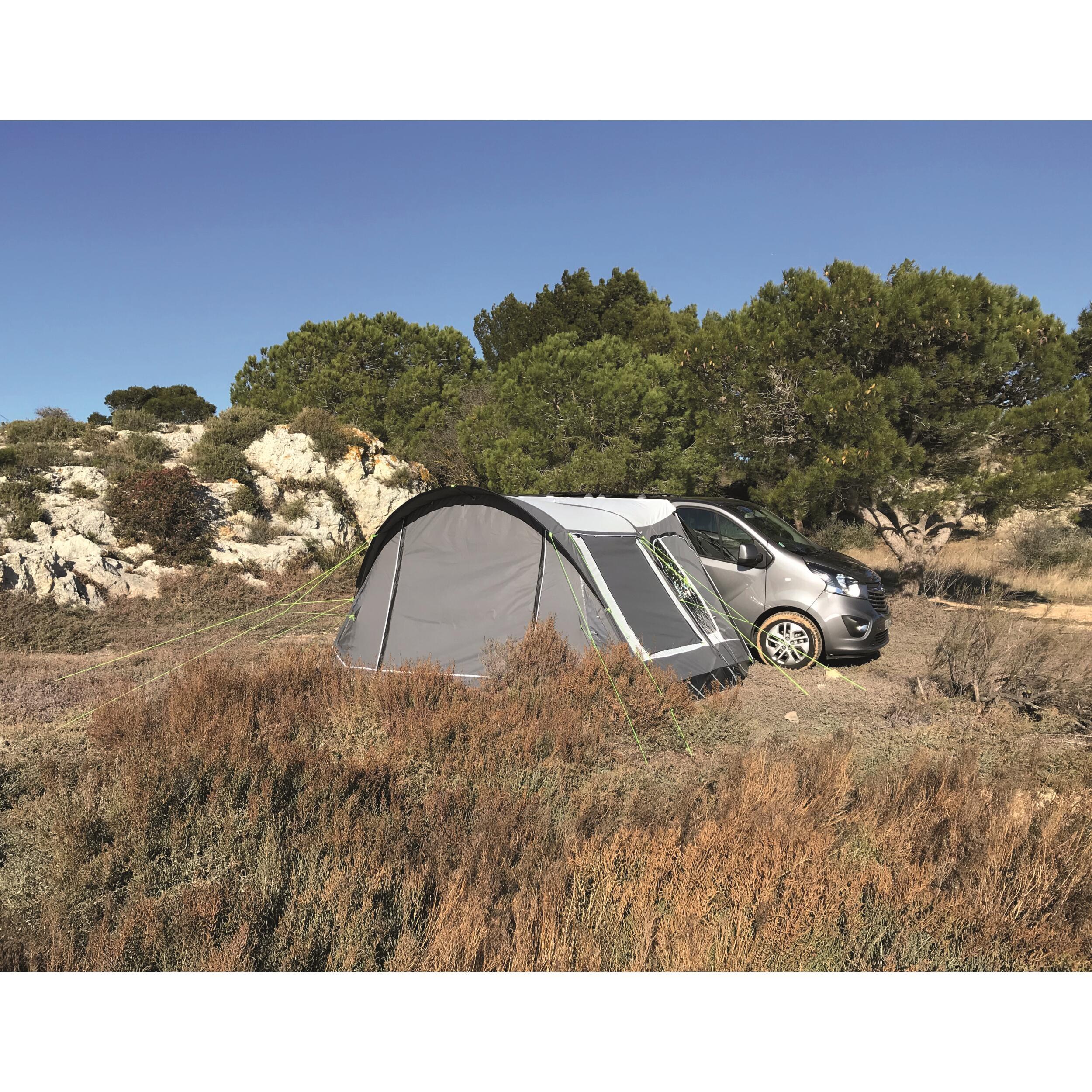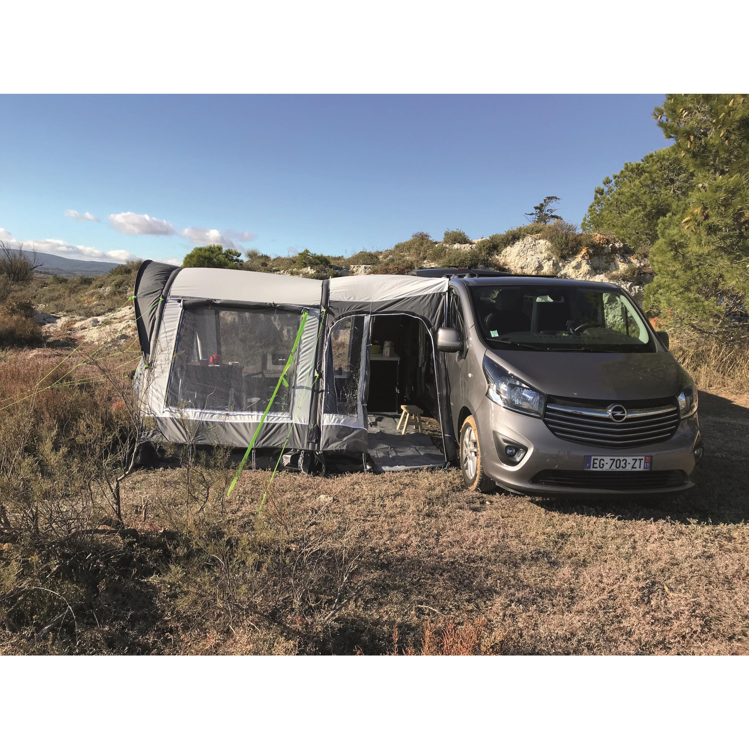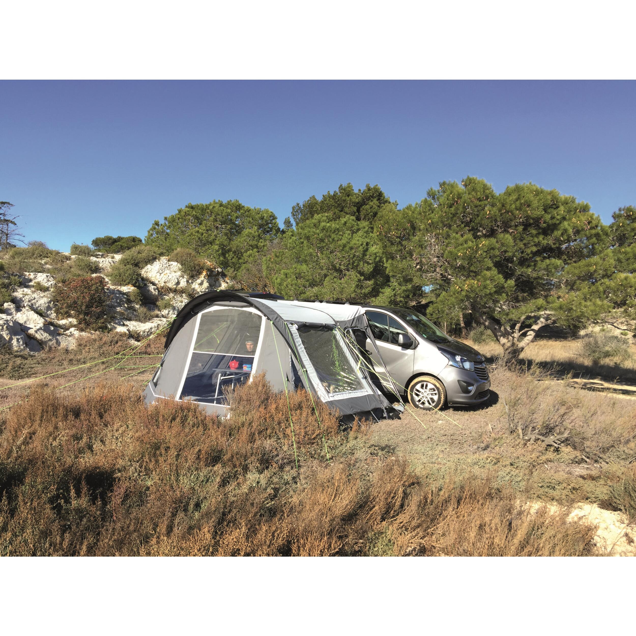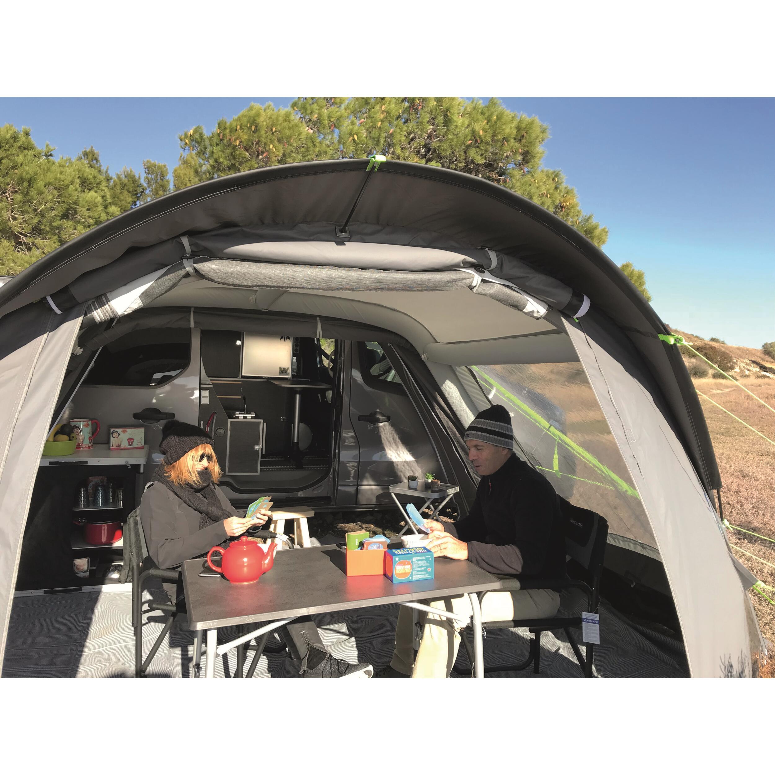 Auvent gonflable multipoints avec toile haut de gamme et volets extérieurs sur toutes les fenêtres.
