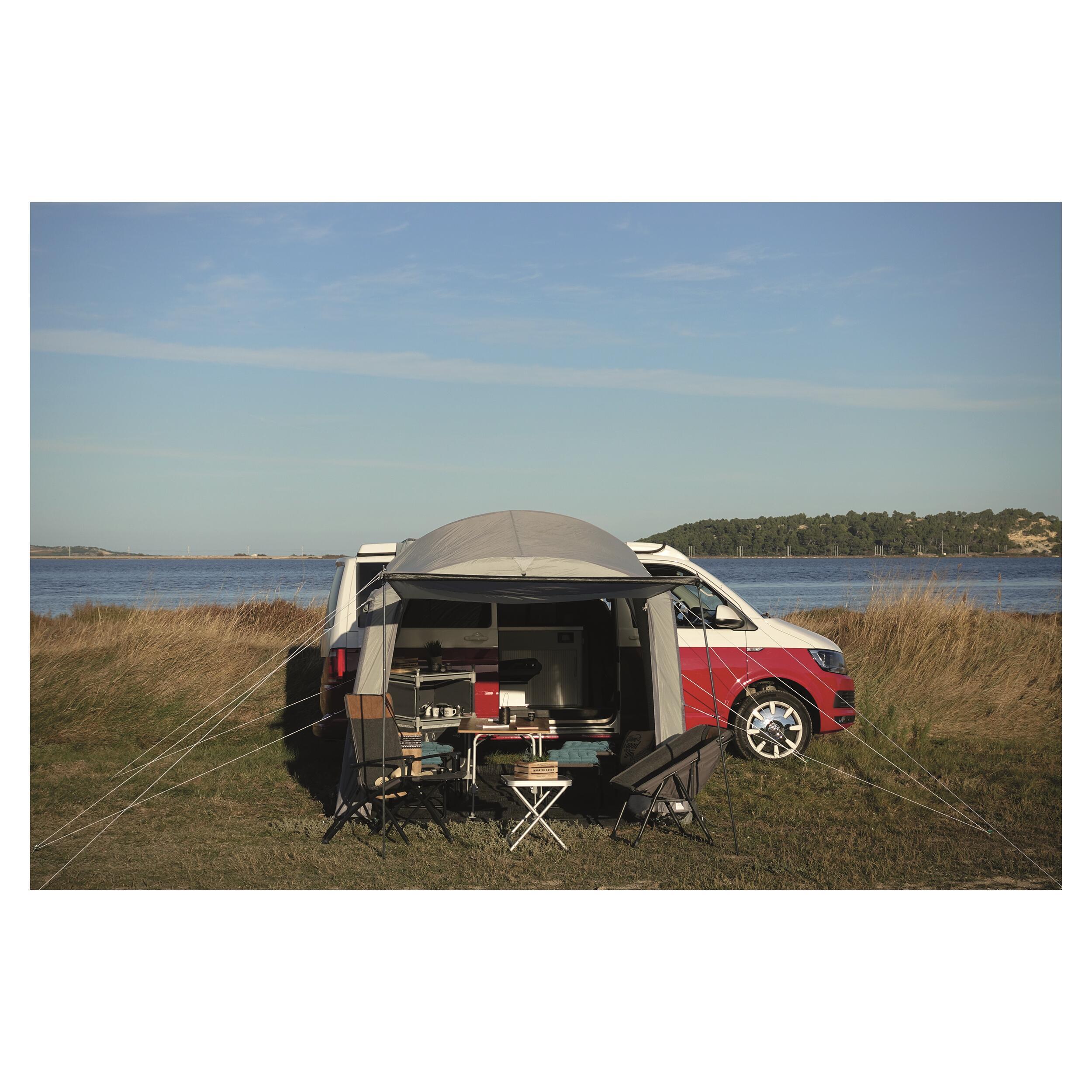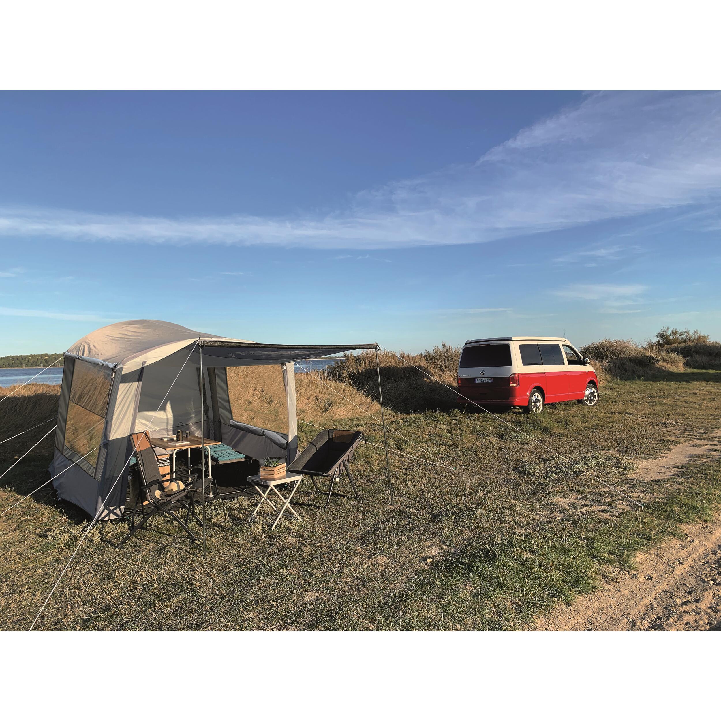 L’abri peut être utilisé de manière indépendante ou installé comme auvent. Dans ce cas, le mur arrière se projette au-dessus du véhicule puis s’amarre au sol à l’aide de cordons d’encrage. Le système de fixation par soufflet permet une connexion directe avec le mini van. Ce format est adapté aux courts séjours, notamment en période estivale.