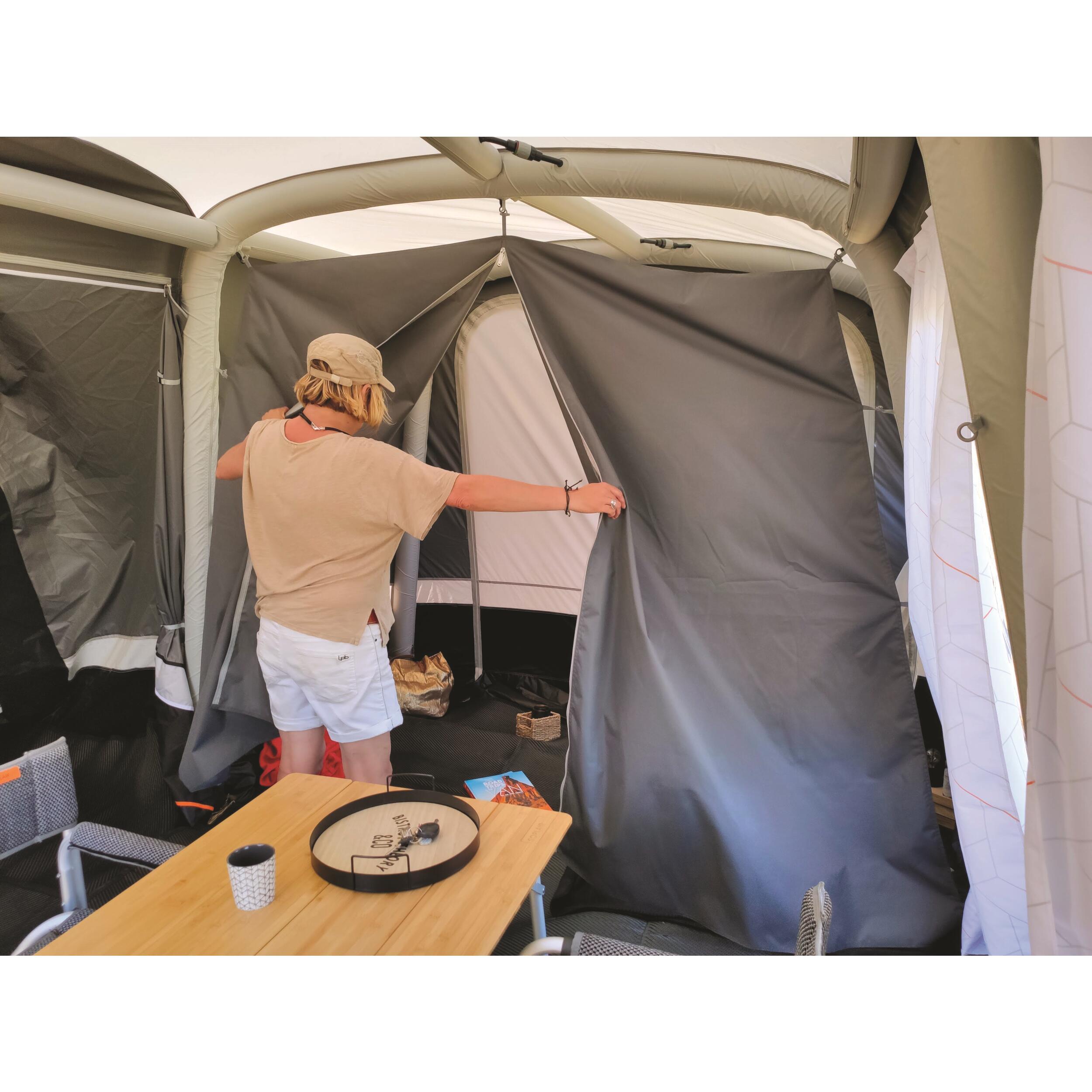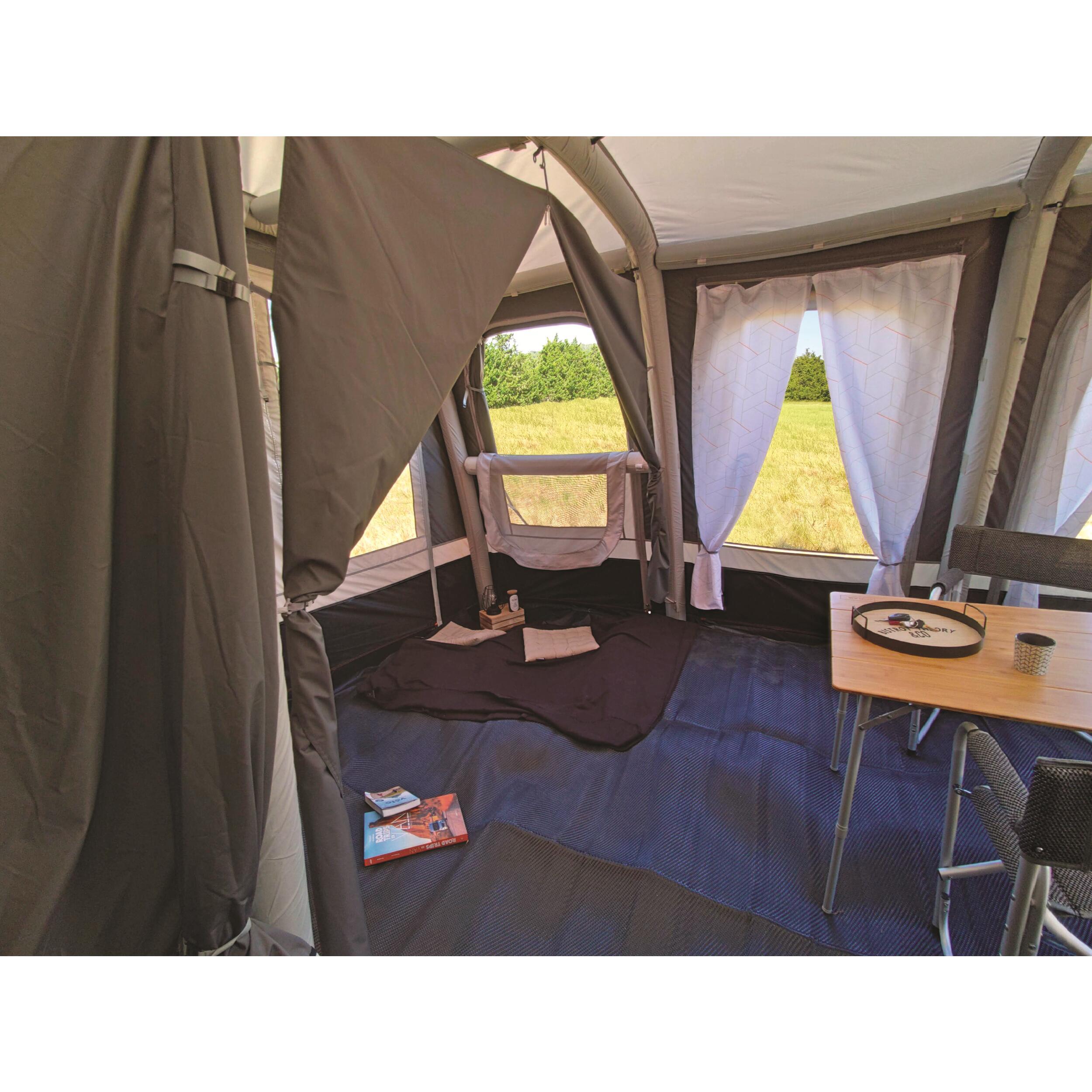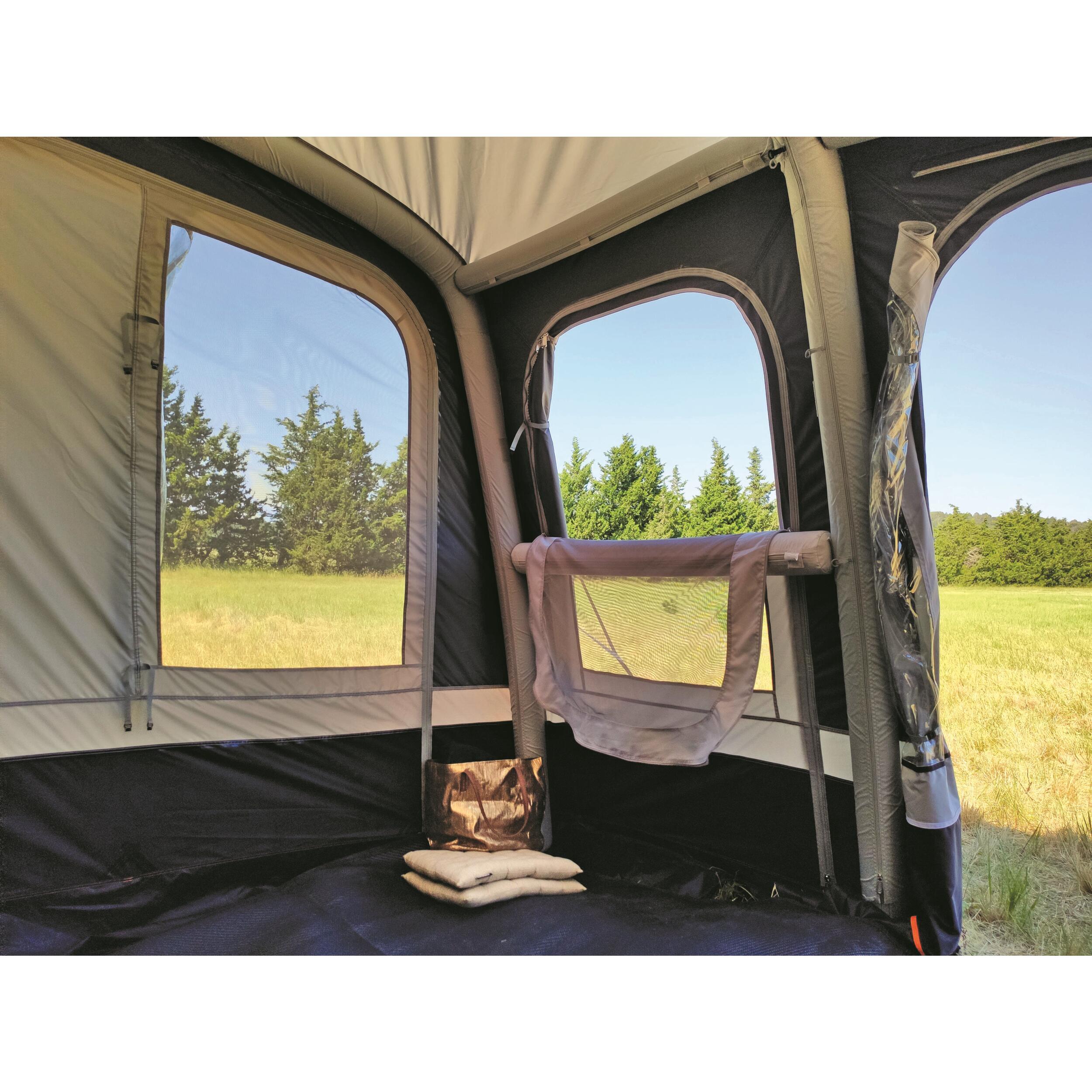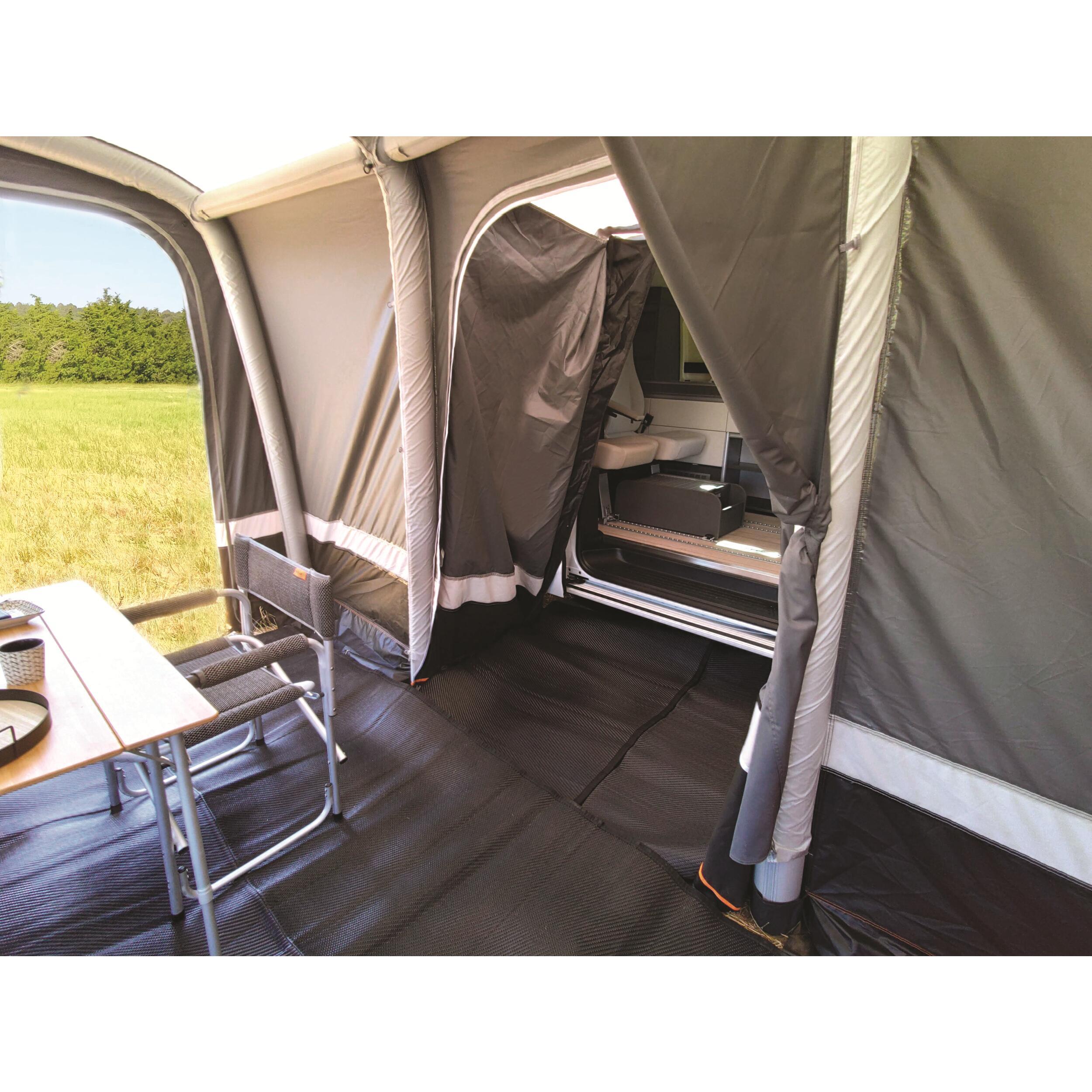 Avec une profondeur de 270 cm, complétée par un tunnel de 90 cm reliant l’auvent au véhicule, le Lantana Air offre un volume intérieur généreux. Cet espace peut être aménagé en salon, en coin repas ou en chambre supplémentaire. Le mur de séparation intégré permet de créer un véritable coin nuit, tandis que le volet occultant assure une obscurité adaptée au repos.