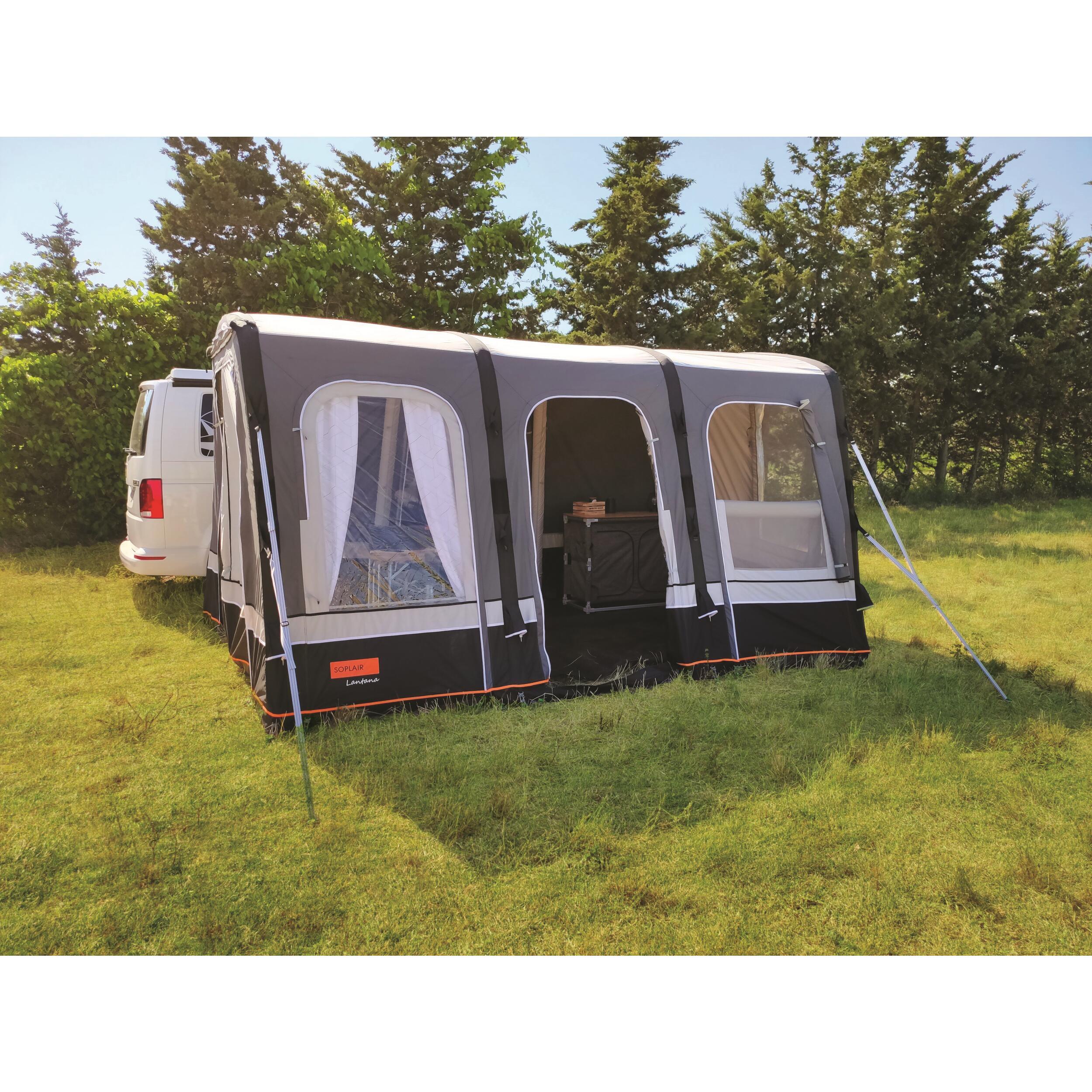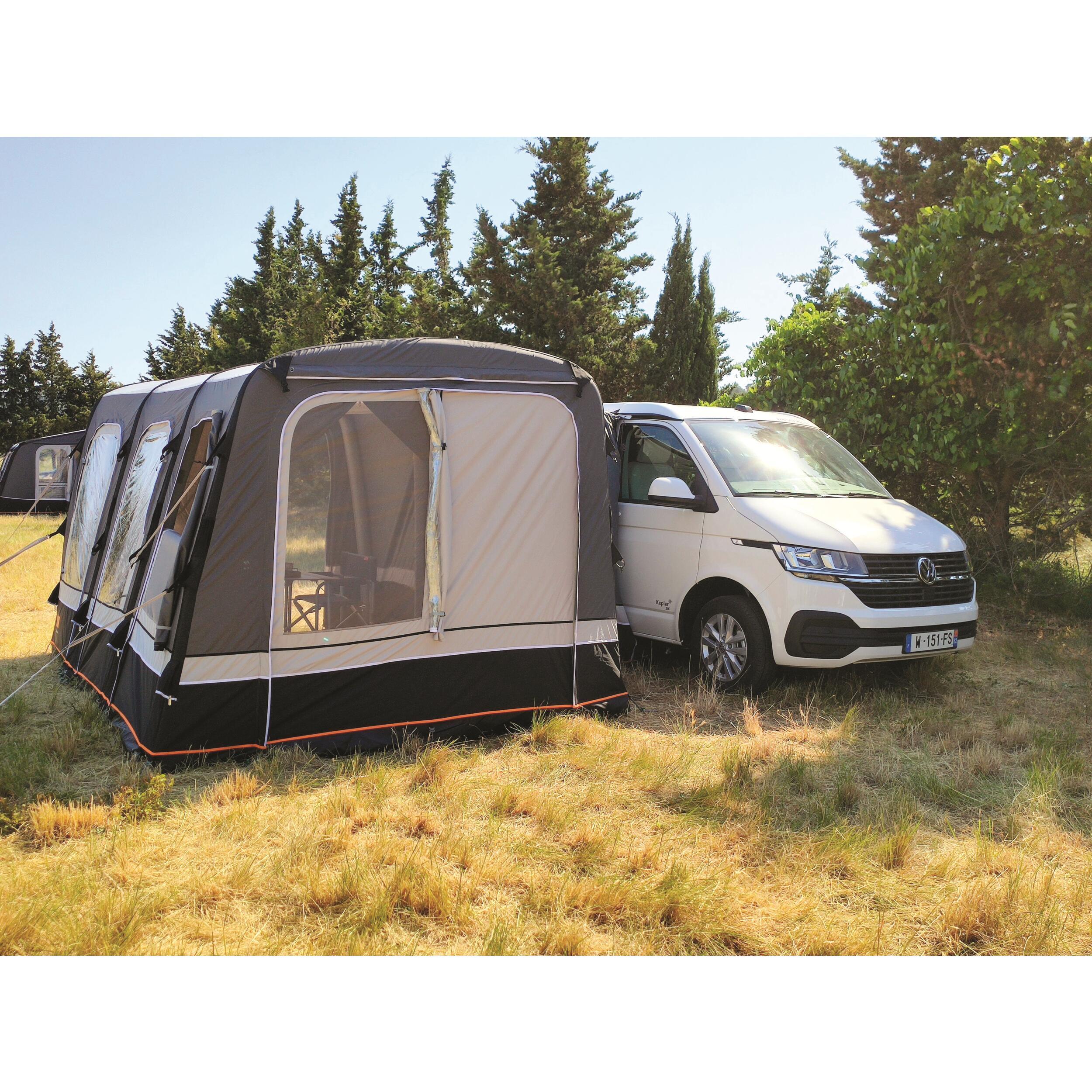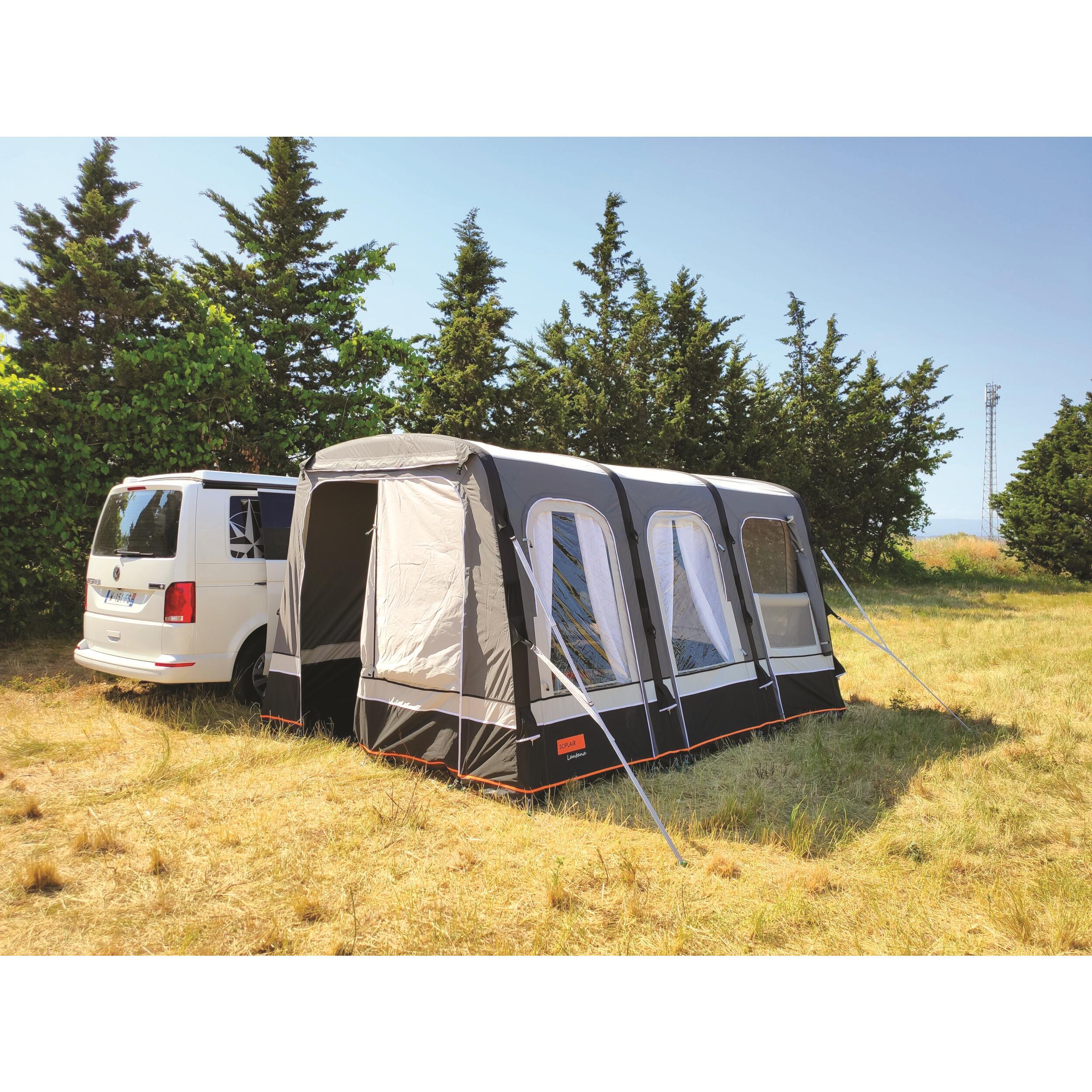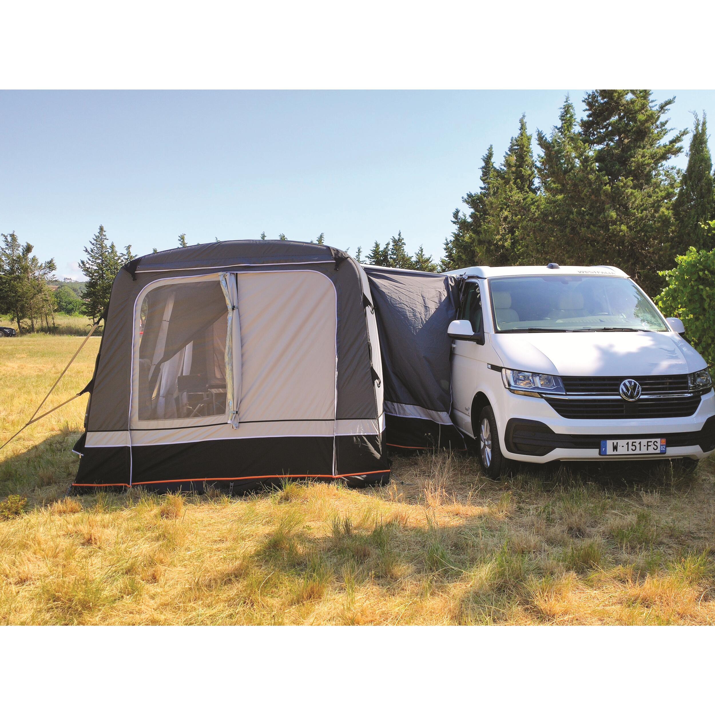 Auvent gonflable modulable pour fourgon et mini-van, conçu pour créer un espace de vie supplémentaire protégé, avec mur de séparation et système EasyAir.
