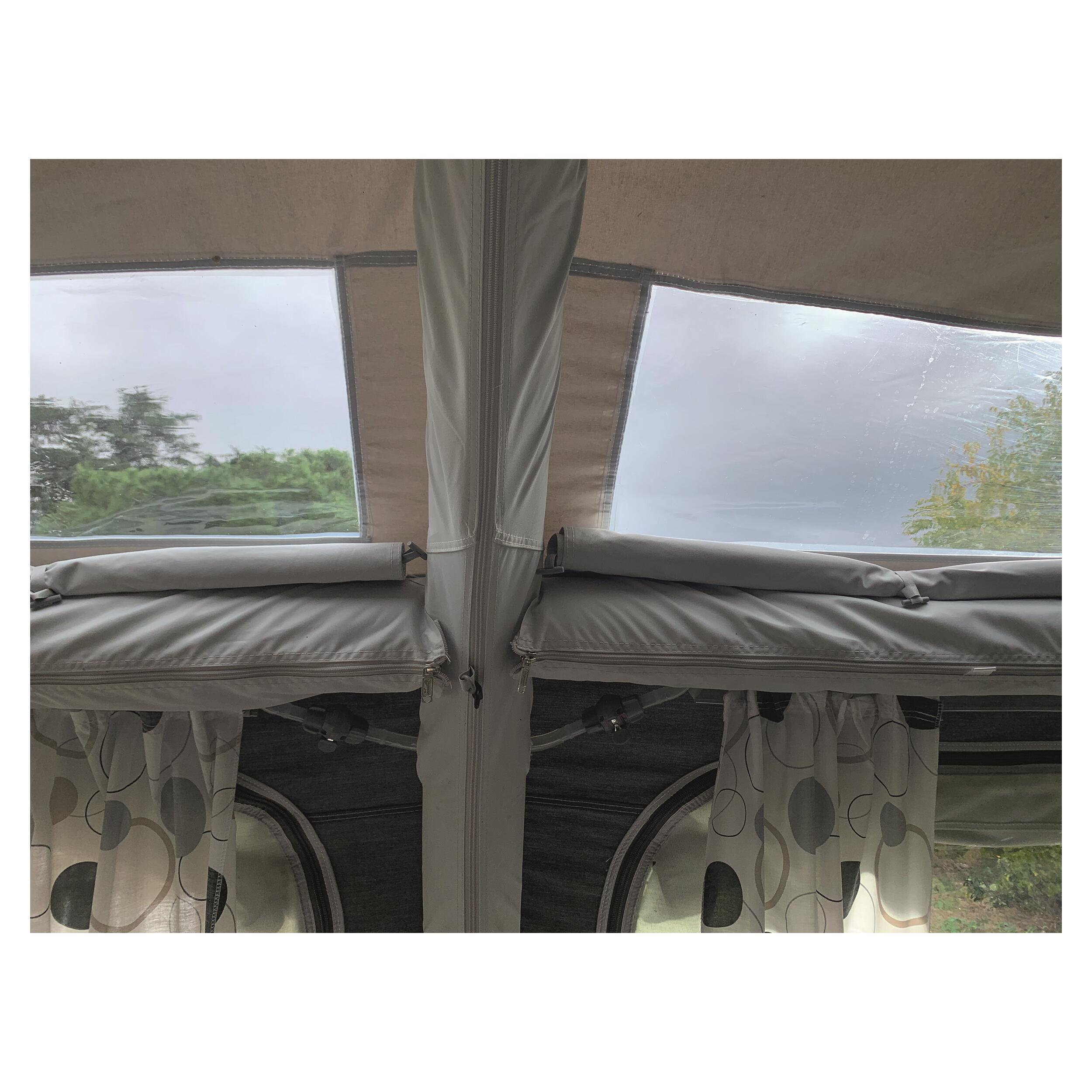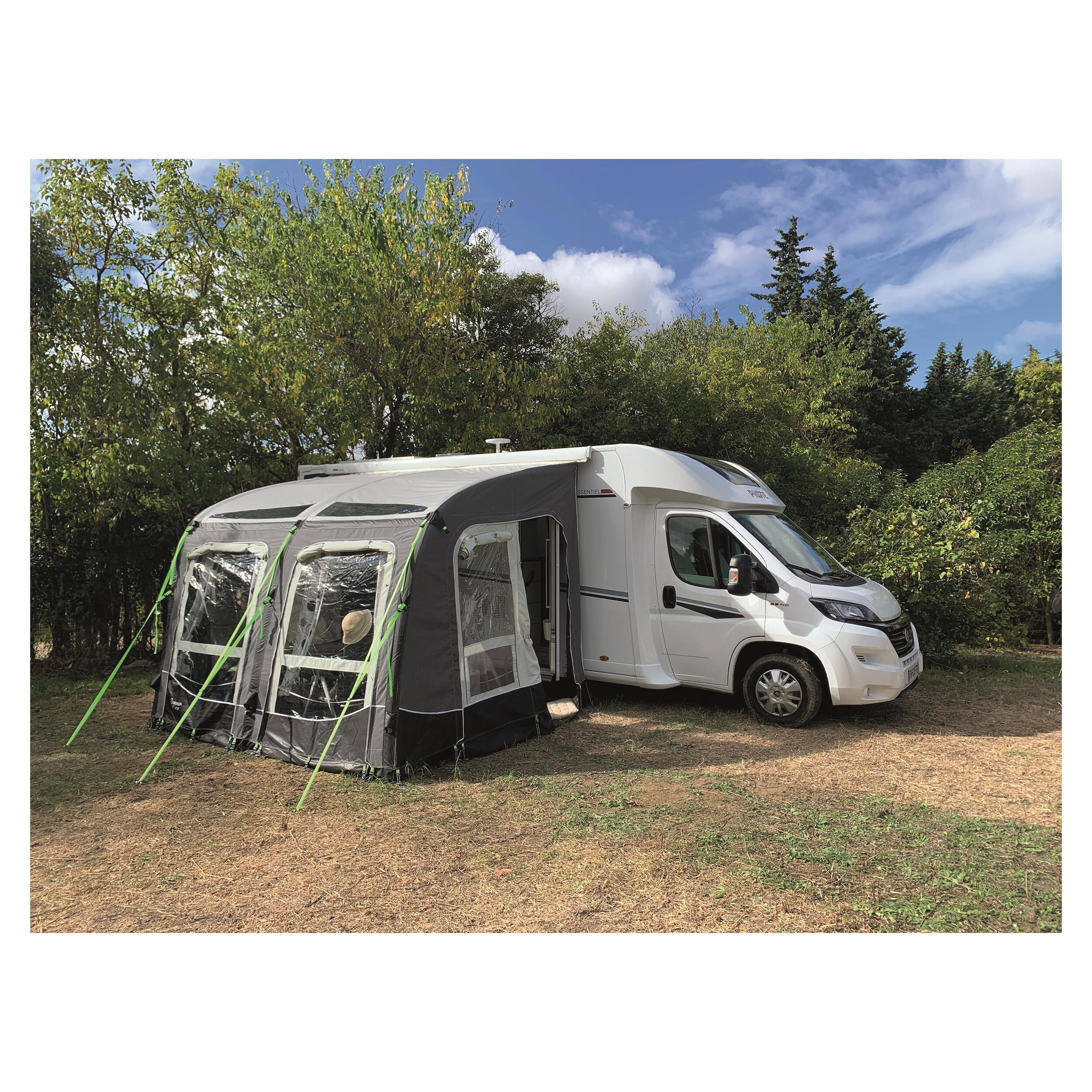 Auvent gonflable haut de gamme en 1 point pour caravane et camping-car, avec toile acrylique respirable, déperlante et installation rapide.