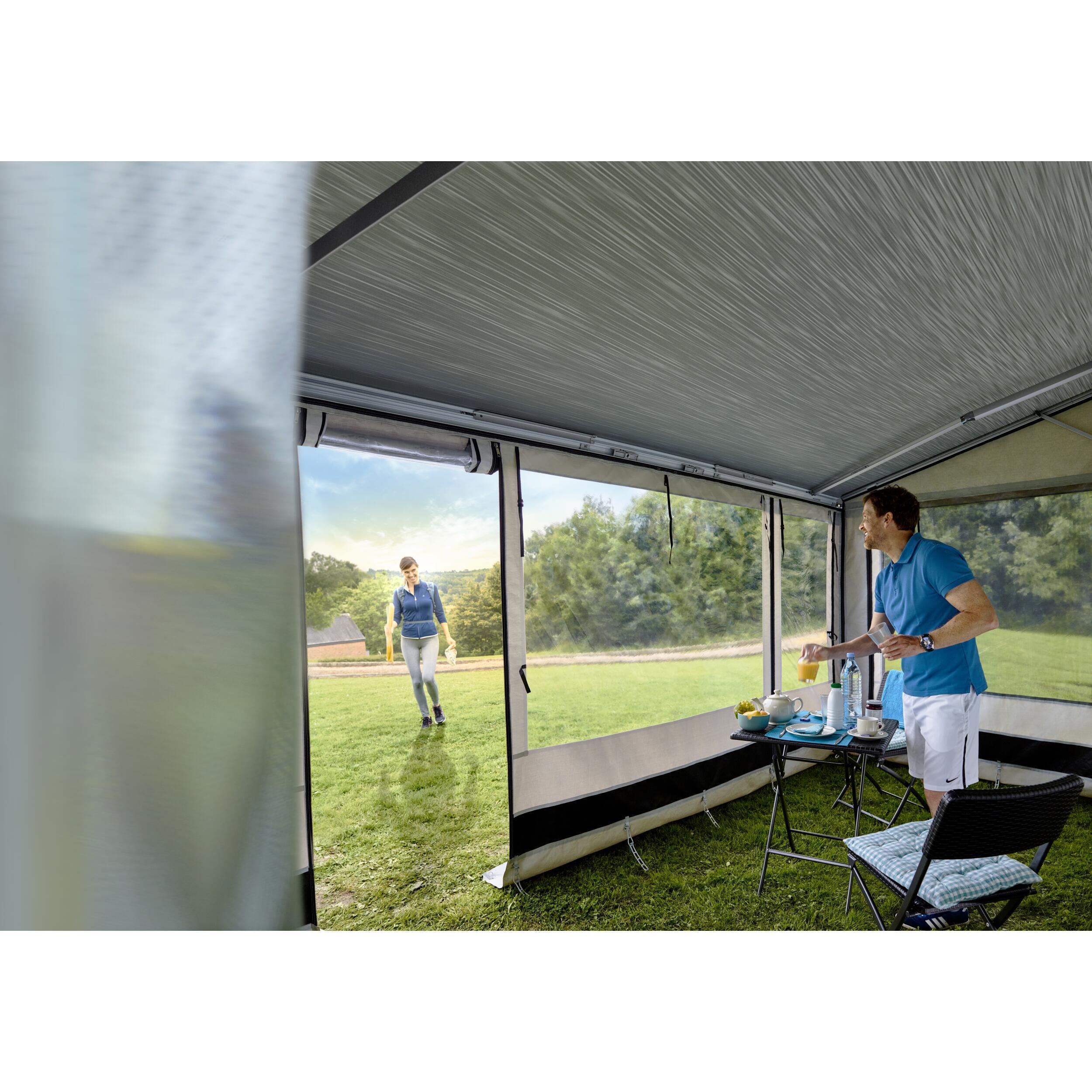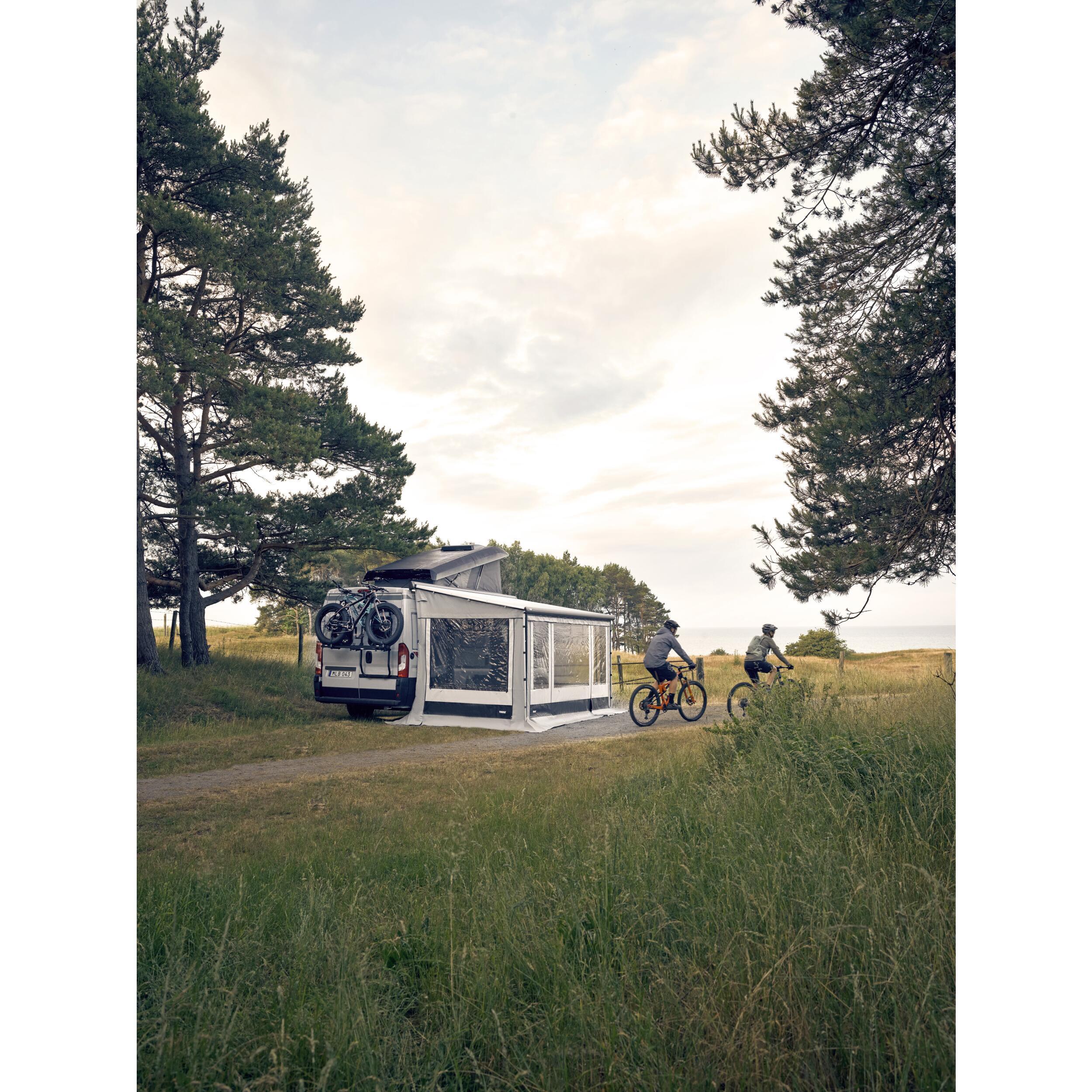 Vous possédez déjà un store Thule, et vous souhaitez le transformer en auvent pour obtenir un espace de vie supplémentaire ? Rien de plus simple ! Il suffit de compléter votre équipement avec la façade Residence G3 (côtés et rideaux à commander séparément).