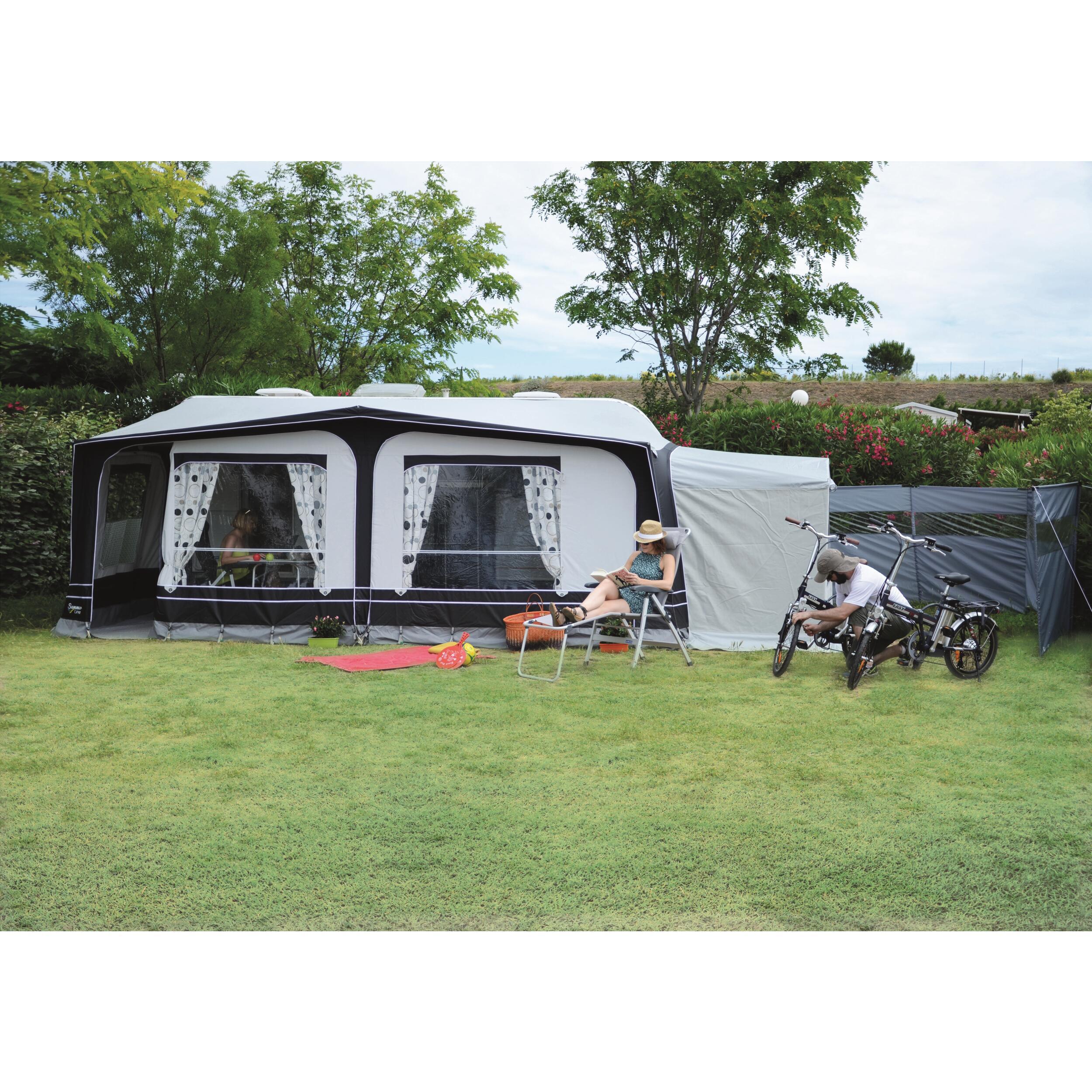 Divers : Fermeture à glissières double curseur. Jupe de bas de caisse et cache roue fournis de série. Accessoires de fixation au sol (tendeurs, piquets, sardines) inclus. Sacs de rangements individuels pour la toile, l'armature et les accessoires.