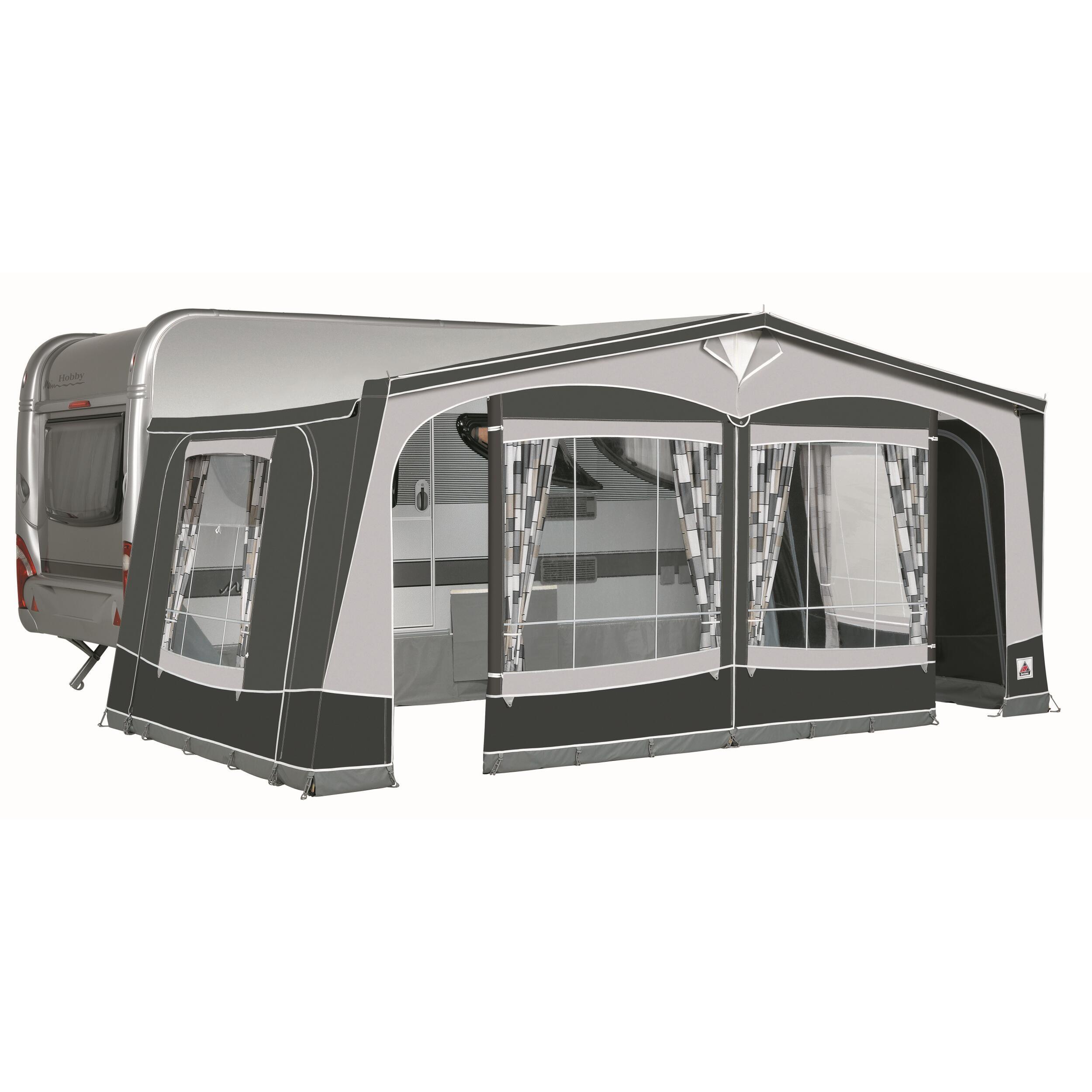 Murs détachables : 1 côté avec fenêtre en PVC cristal, 1 côté avec fenêtre cristal sur la partie inférieure et moustiquaire sur la partie supérieure.