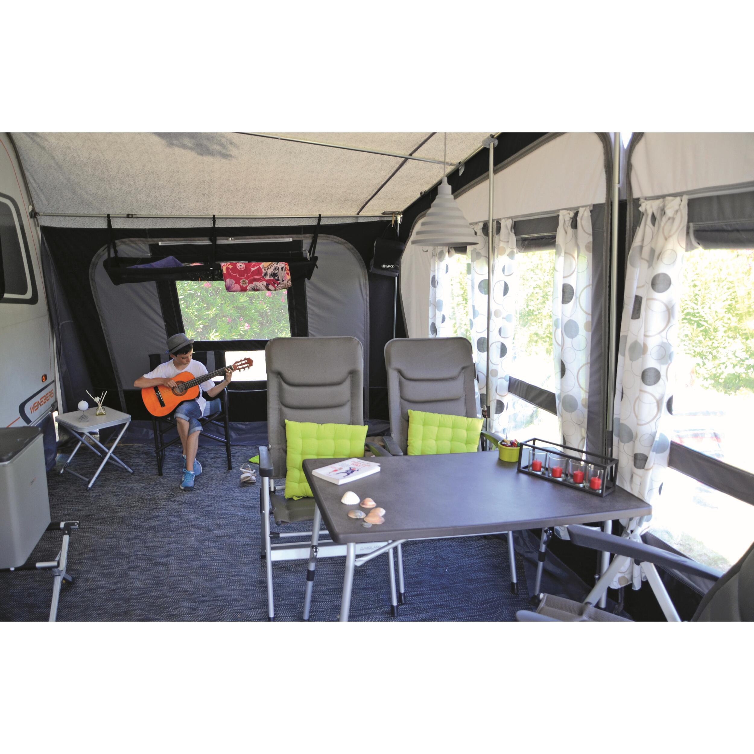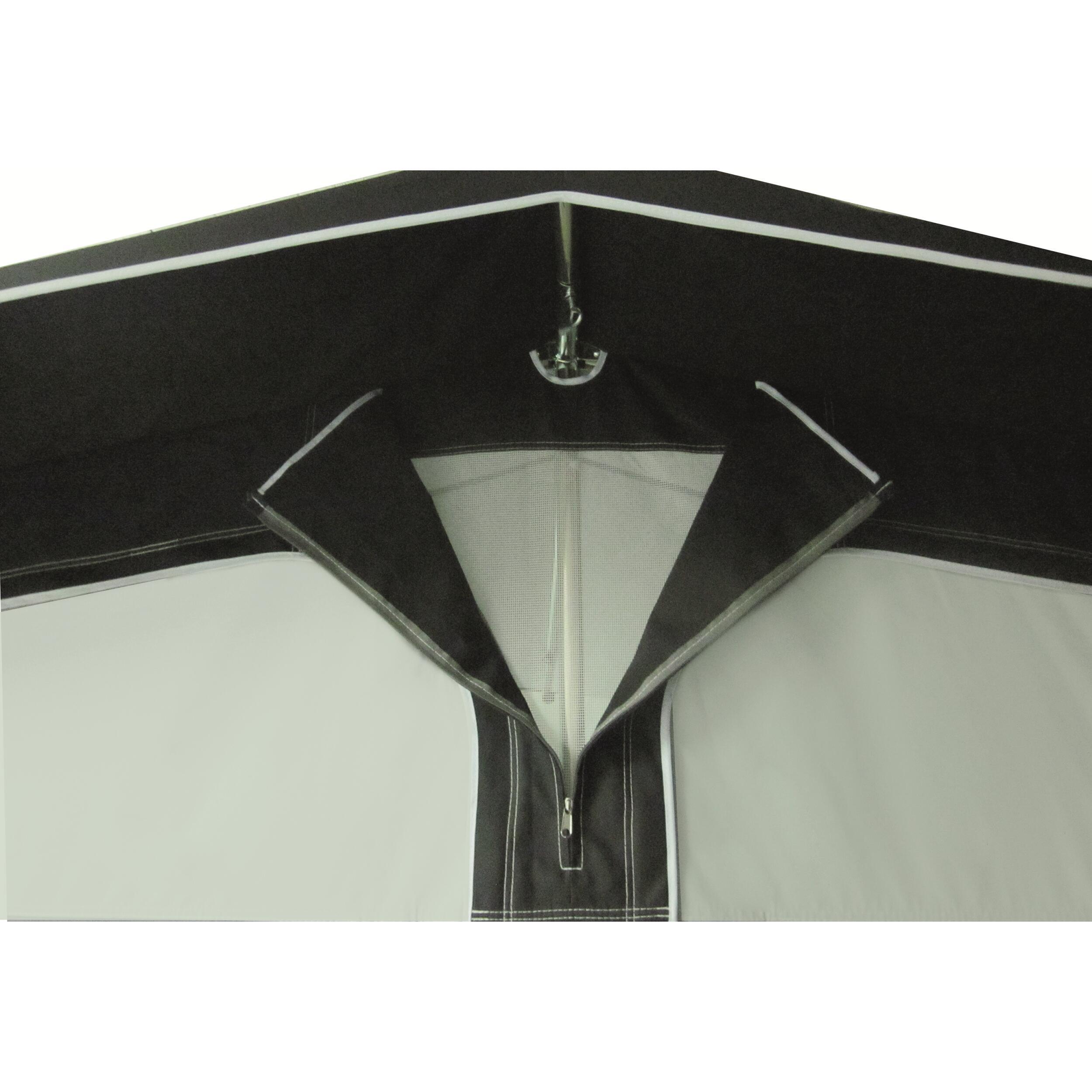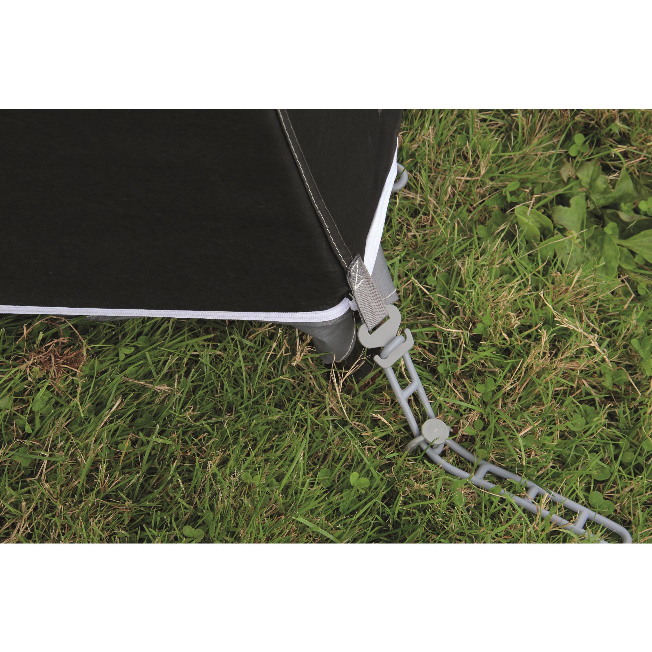 Fermeture à glissières double curseur. Jupe de bas de caisse et cache roue fournis de série. Accessoires de fixation au sol (tendeurs, piquets, sardines) inclus. Sacs de rangements individuels pour la toile, l'armature et les accessoires.