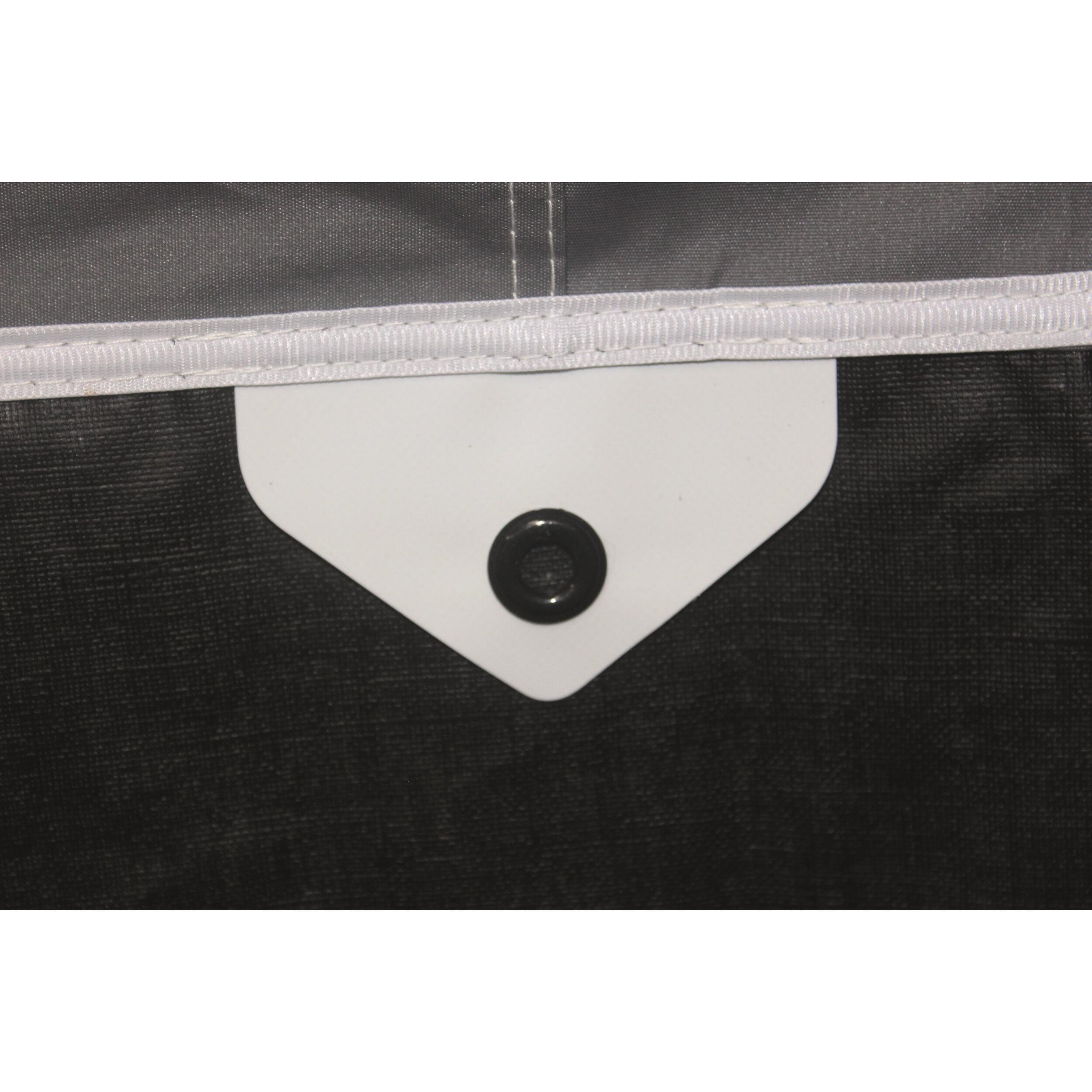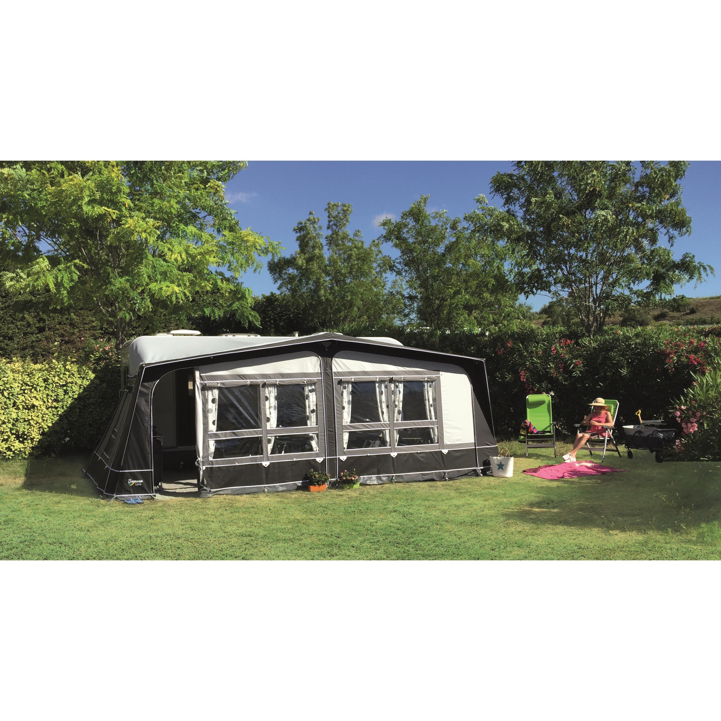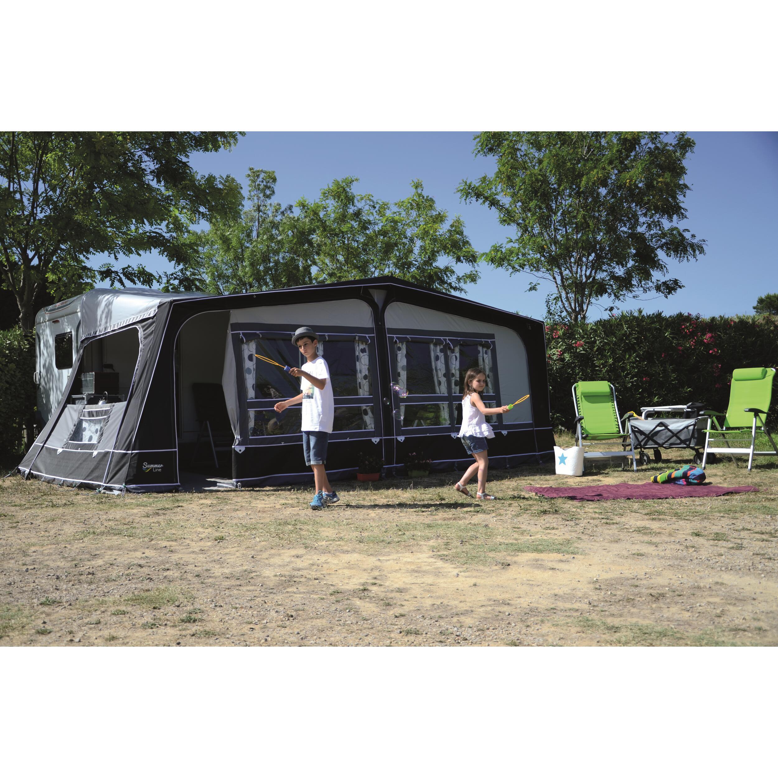 Fermeture à glissières double curseur. Jupe de bas de caisse et cache roue fournis de série. Accessoires de fixation au sol (tendeurs, piquets, sardines) inclus. Sacs de rangements individuels pour la toile, l'armature et les accessoires.