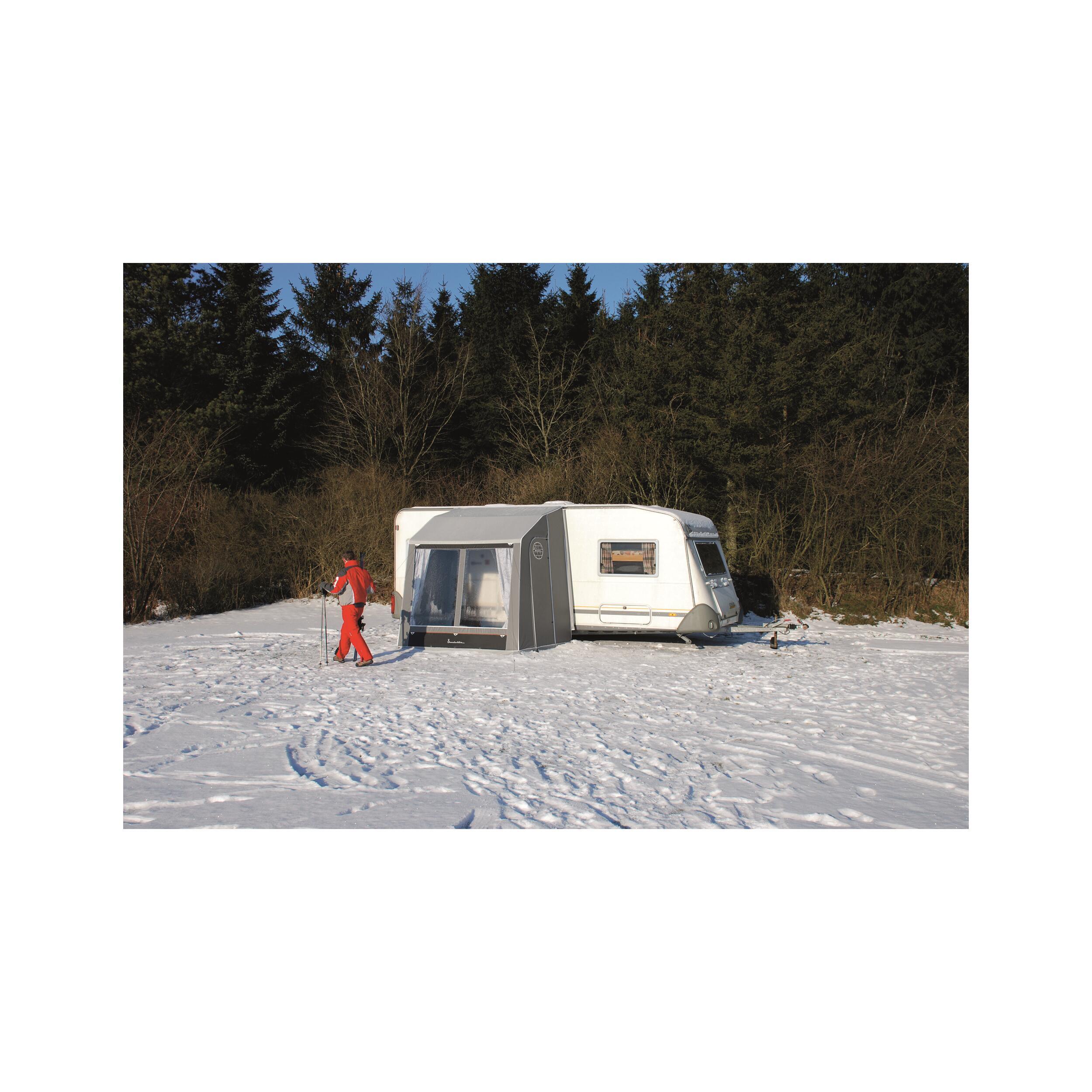 SAS conçu pour une utilisation à l’année : matériaux résistants, large bavette extérieure, toit double pente pour évacuer la neige. Ventilation ajustable. Pour caravanes dont la hauteur varie entre 235 et 250 cm.