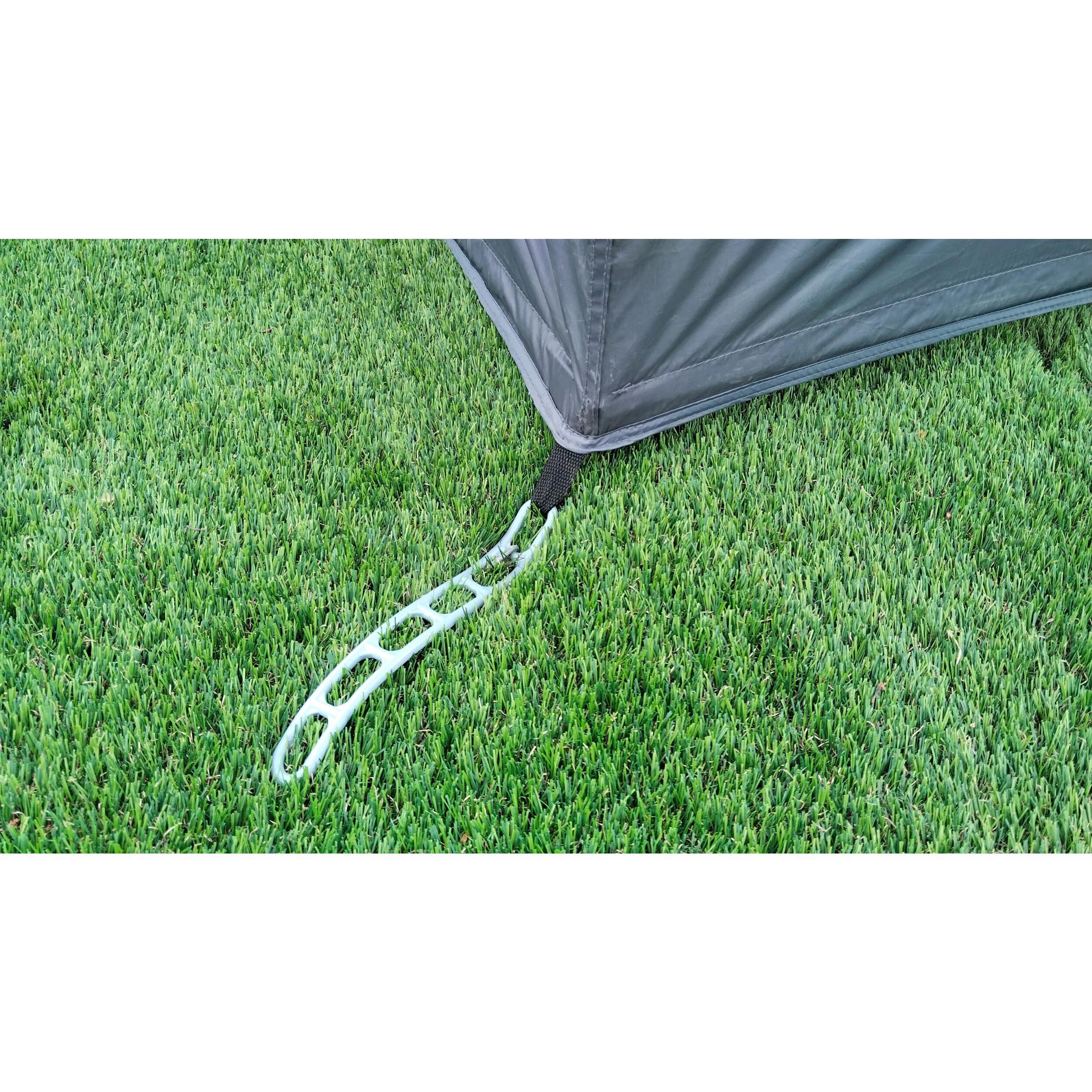 Les portes arrière assurent le maintien principal. Les tiges en fibre de verre conservent la forme de la cabine, même par temps venteux. Deux tiges placées dans le toit augmentent la hauteur intérieure, utiles pour ranger des objets encombrants ou suspendre une douche ou une lampe.