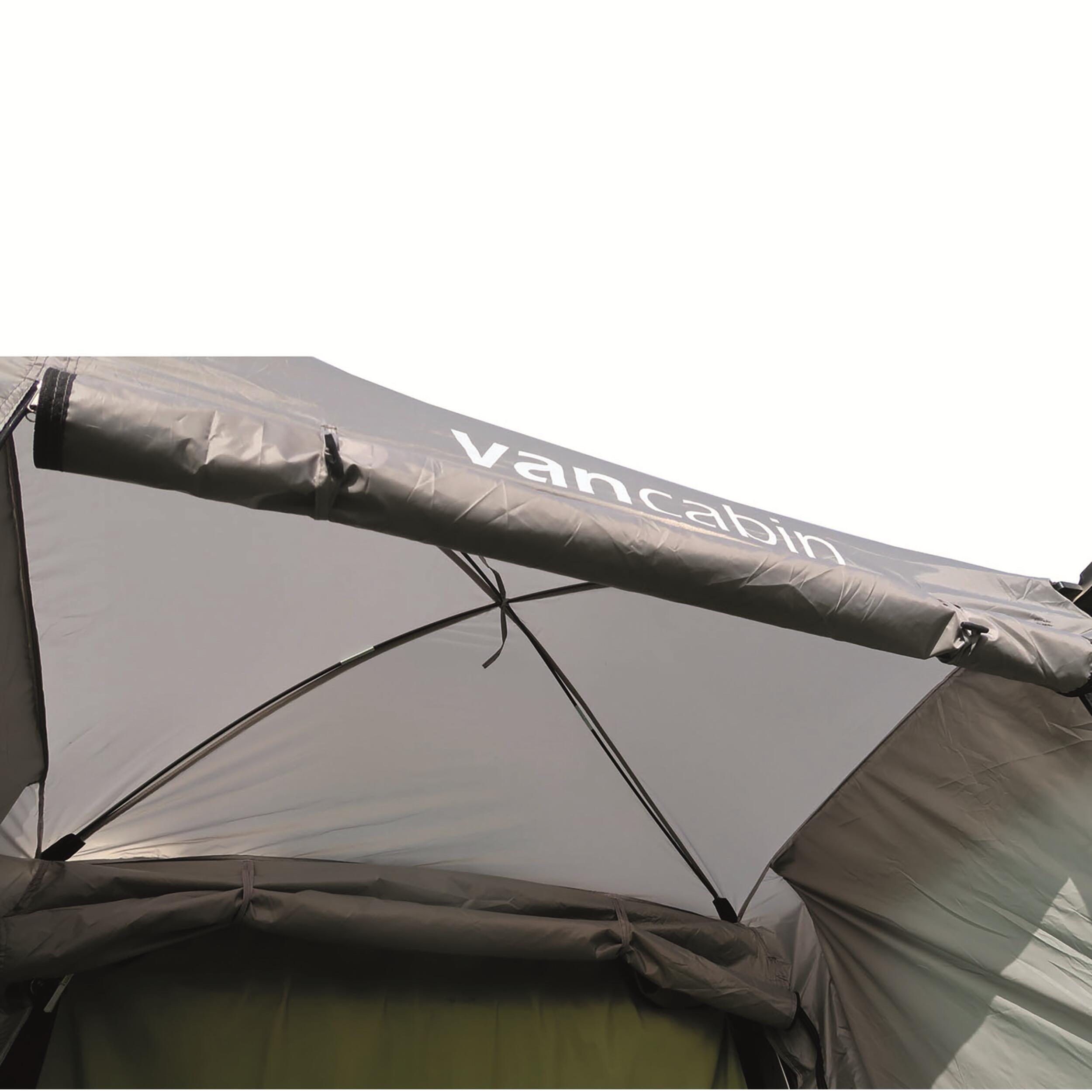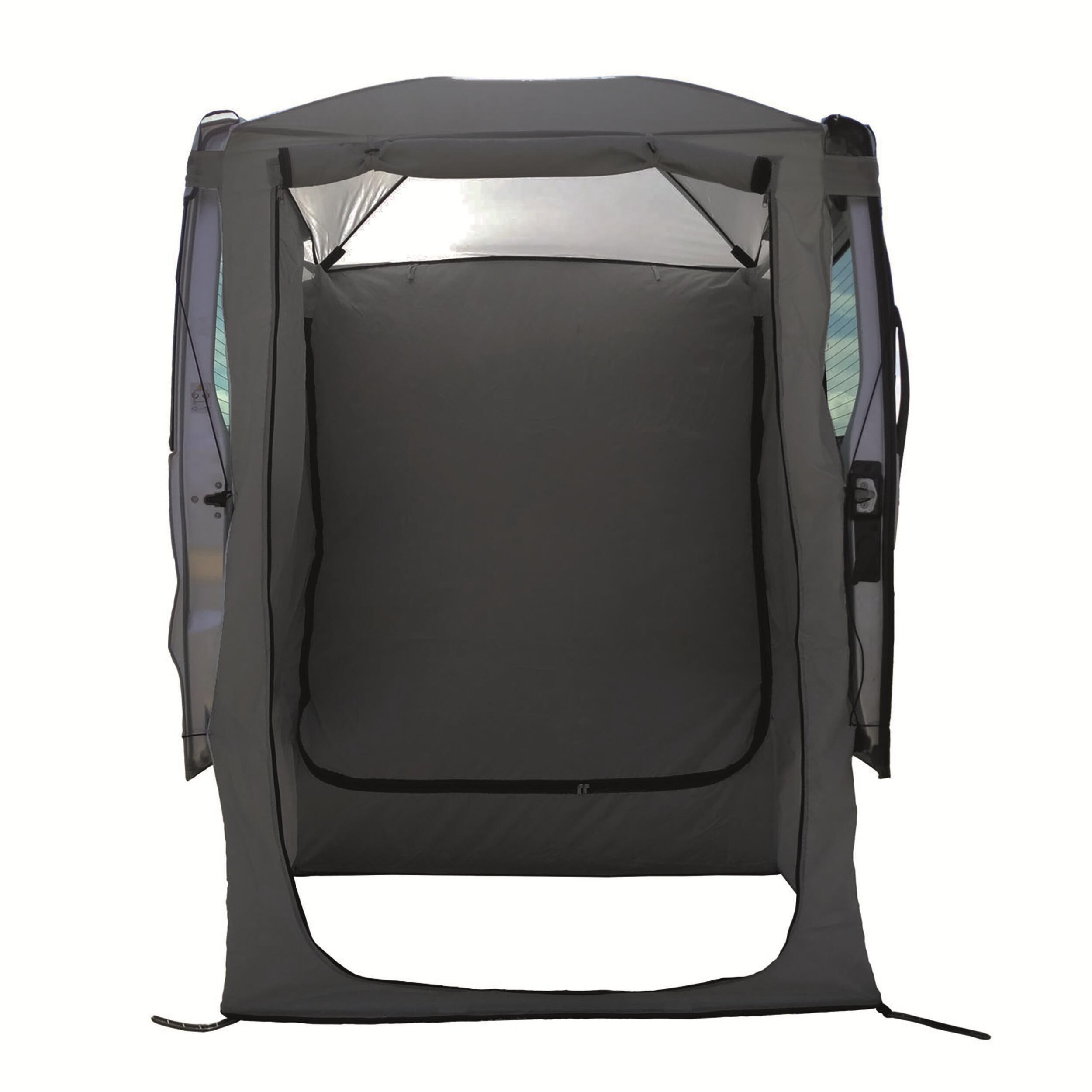 Ce sas arrière Vancabin utilise les portes du véhicule comme points de support. Cette conception évite les structures complexes et facilite un montage rapide, même sur un fourgon équipé d’un porte-vélos.