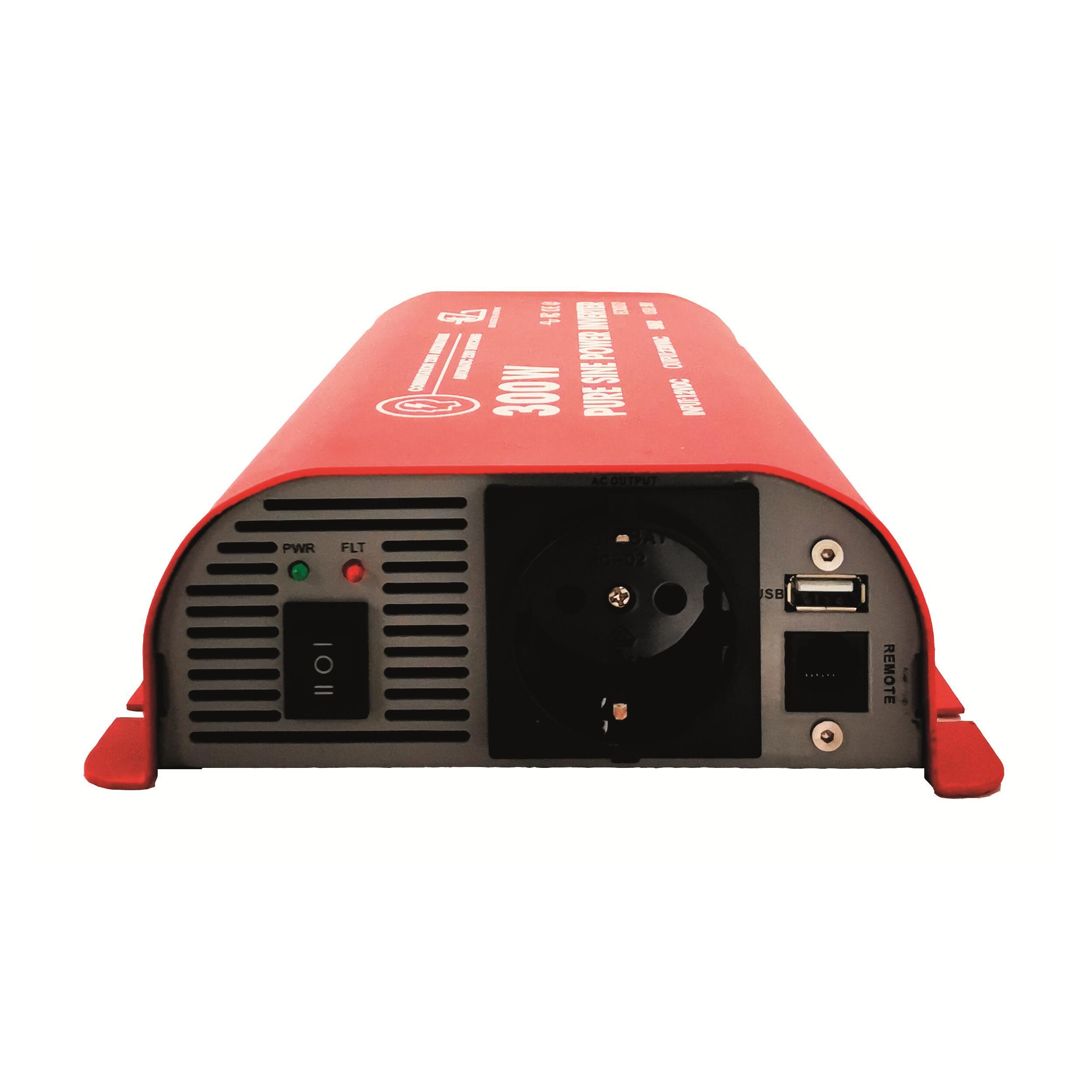 Puissance continue: 300W / Puissance de crête 600W / Onde sinusoïdale pure / Sortie USB : 1x 5V 2A / Alarme tension basse, protection surcharge, court-circuit, tension faible et surtension. Sans commande déportée.