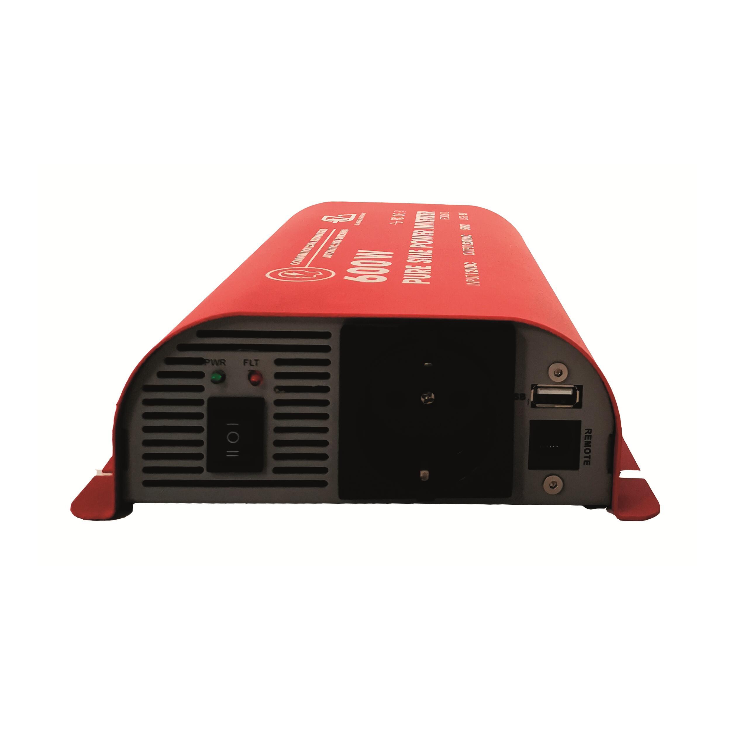 Puissance continue: 600W / Puissance de crête 1200W / Onde sinusoïdale pure / Sortie USB : 1x 5V 2A / Alarme tension basse, protection surcharge, court-circuit, tension faible et surtension. Sans commande déportée.