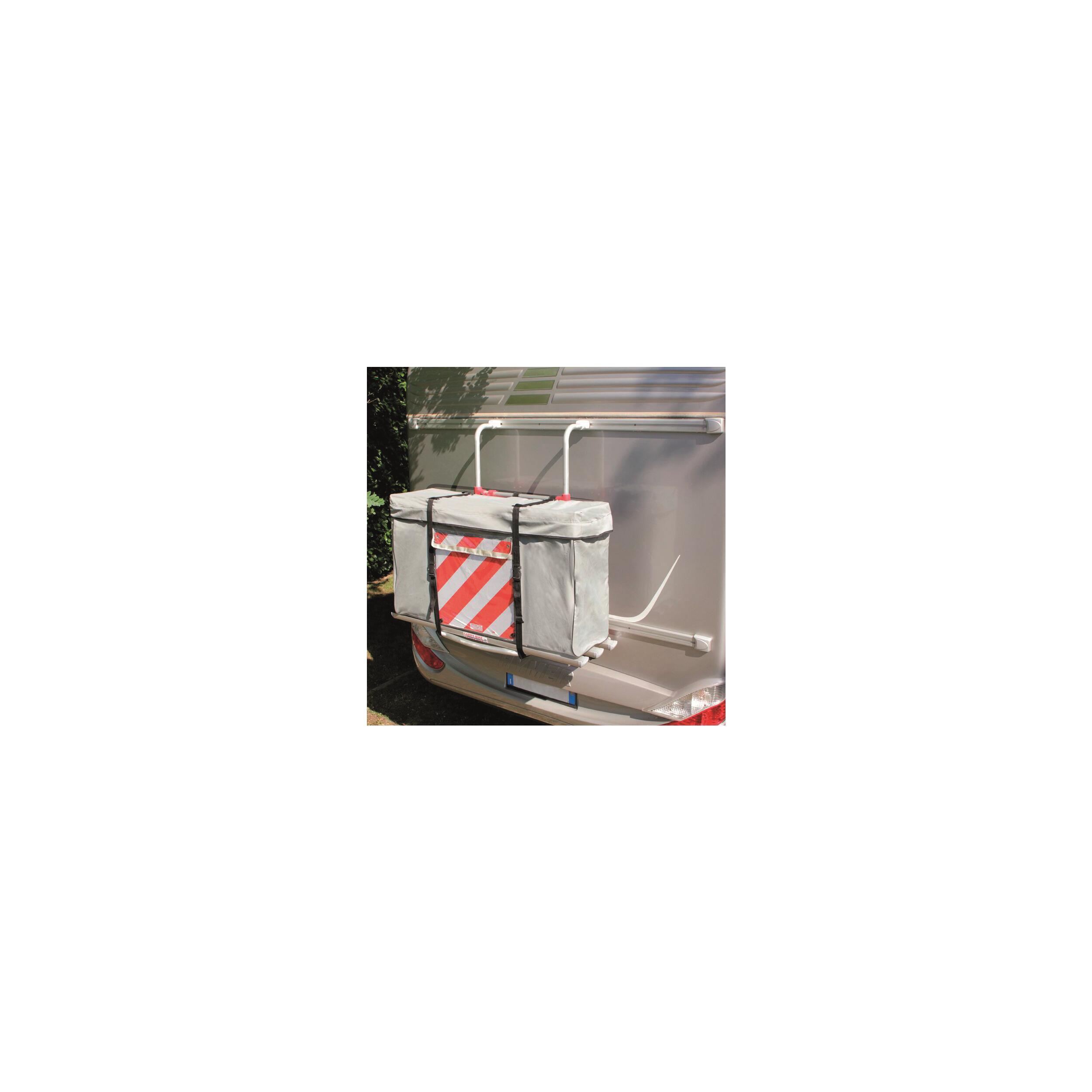 Coffre extérieur souple en polyester imperméable et anti-déchirure. Il se fixe sur les porte-vélos arrière grâce à un système de sangles renforcées. Il possède une pochette transparente de rangement du panneau de signalisation (panneau non fourni). Livré avec sangles de fixation.