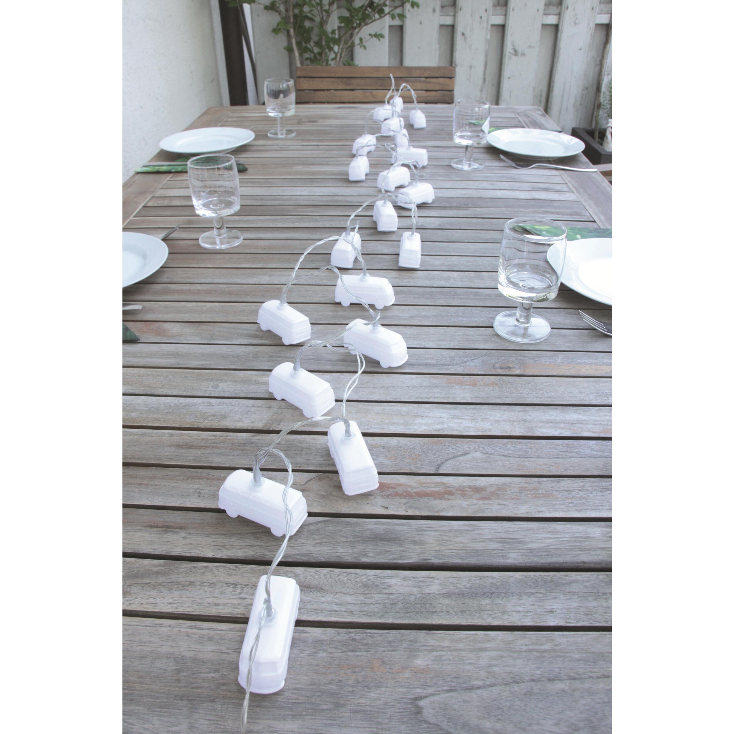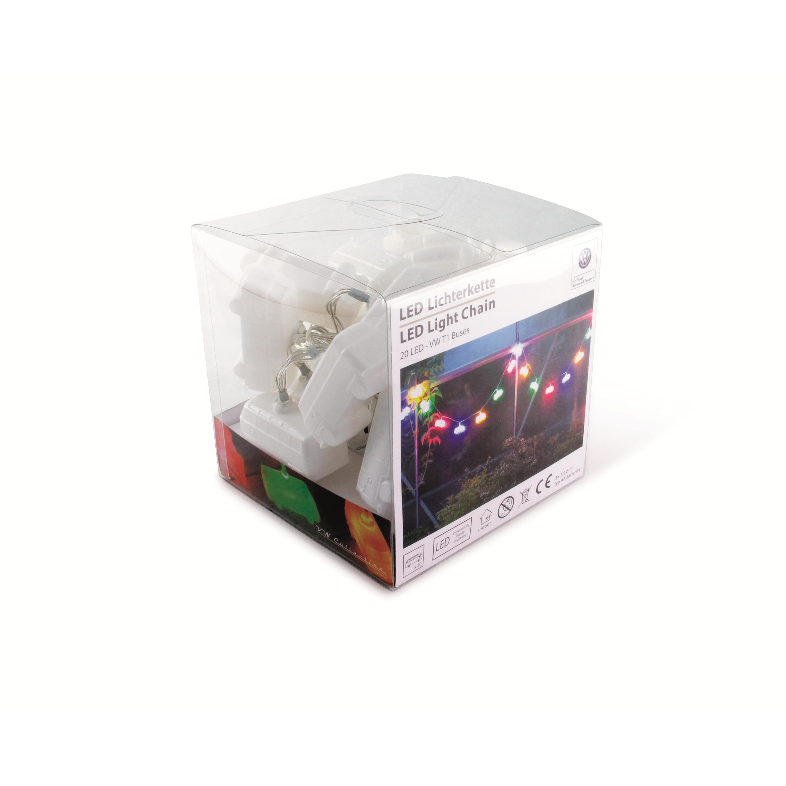 Que ce soit pour une fête barbecue en plein air, une excursion en camping ou un éclairage intérieur, ces guirlandes lumineuses à LED apporteront un peu de fun, d'originalité et d'illumination. Les 20 mini bus VW T1 sont fabriqués en matière synthétique blanche et s'illuminent en 4 couleurs vibrantes différentes : bleu, rouge, jaune et vert. Une pièce de décoration qui attire le regard, parfaite pour tout fan de VW ! Si vous utilisez les guirlandes lumineuses à l'extérieur, elles doivent être gardées au sec et protégées de la pluie et de l'humidité, car elles ne sont pas étanches.