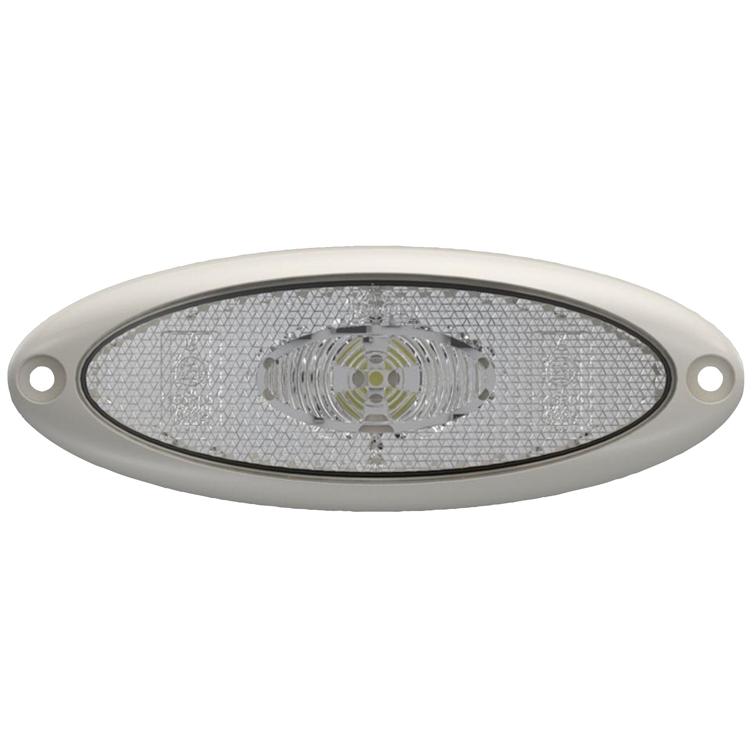 Feu de position latéral à LEDs Jokon PLR/SMLR, idéal pour les véhicules de loisirs. Compact, en applique, avec enjoliveur blanc élégant. Dimensions : 124 x 45 x 14 mm. Entraxe de fixation : 112 mm.