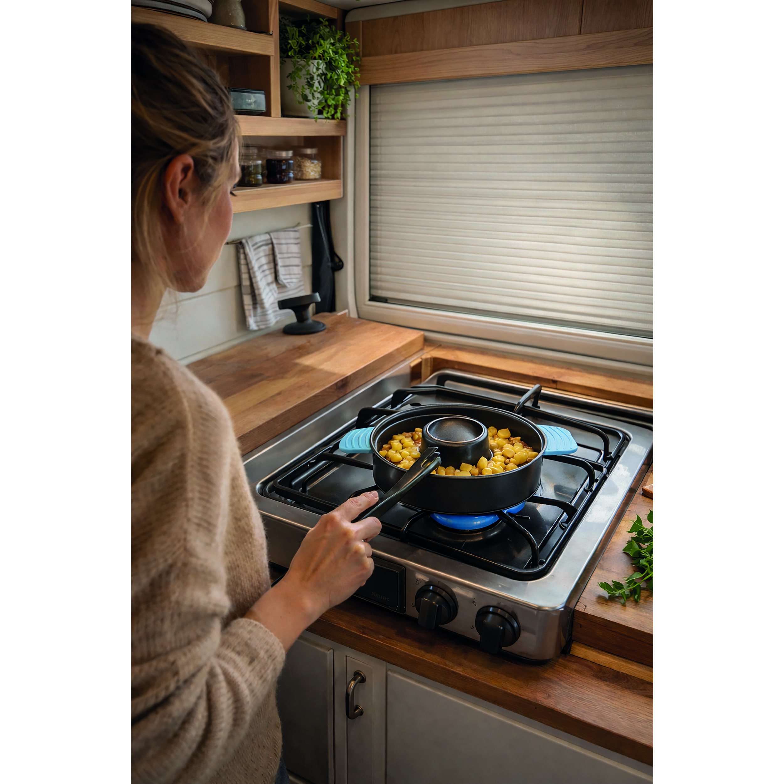 Avec le four nomade TANDOOR, vous pouvez enfin cuire, gratiner ou rôtir vos plats favoris, même loin de toute cuisine traditionnelle. Conçu pour fonctionner directement sur un réchaud à gaz, ce four ingénieux vous offre la possibilité de préparer gratins dorés, pains croustillants, gâteaux moelleux ou légumes rôtis, où que vous soyez. Il reproduit les effets de la cuisson au four classique grâce à sa structure circulaire et sa diffusion de chaleur optimale, permettant une cuisson homogène et maîtrisée. Que vous soyez en bivouac, sur une aire de camping ou à l’étape dans votre fourgon, le four TANDOOR vous accompagne avec fiabilité et efficacité.