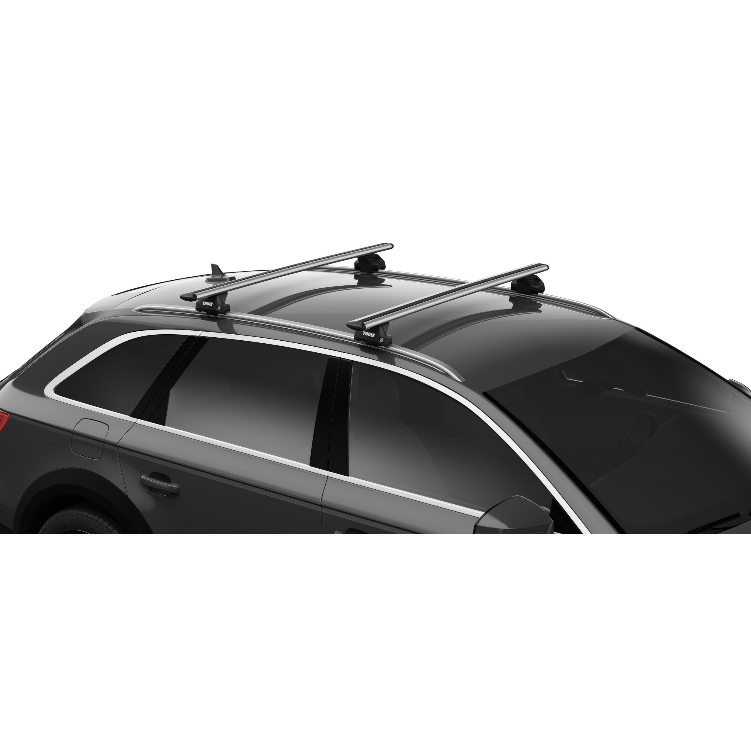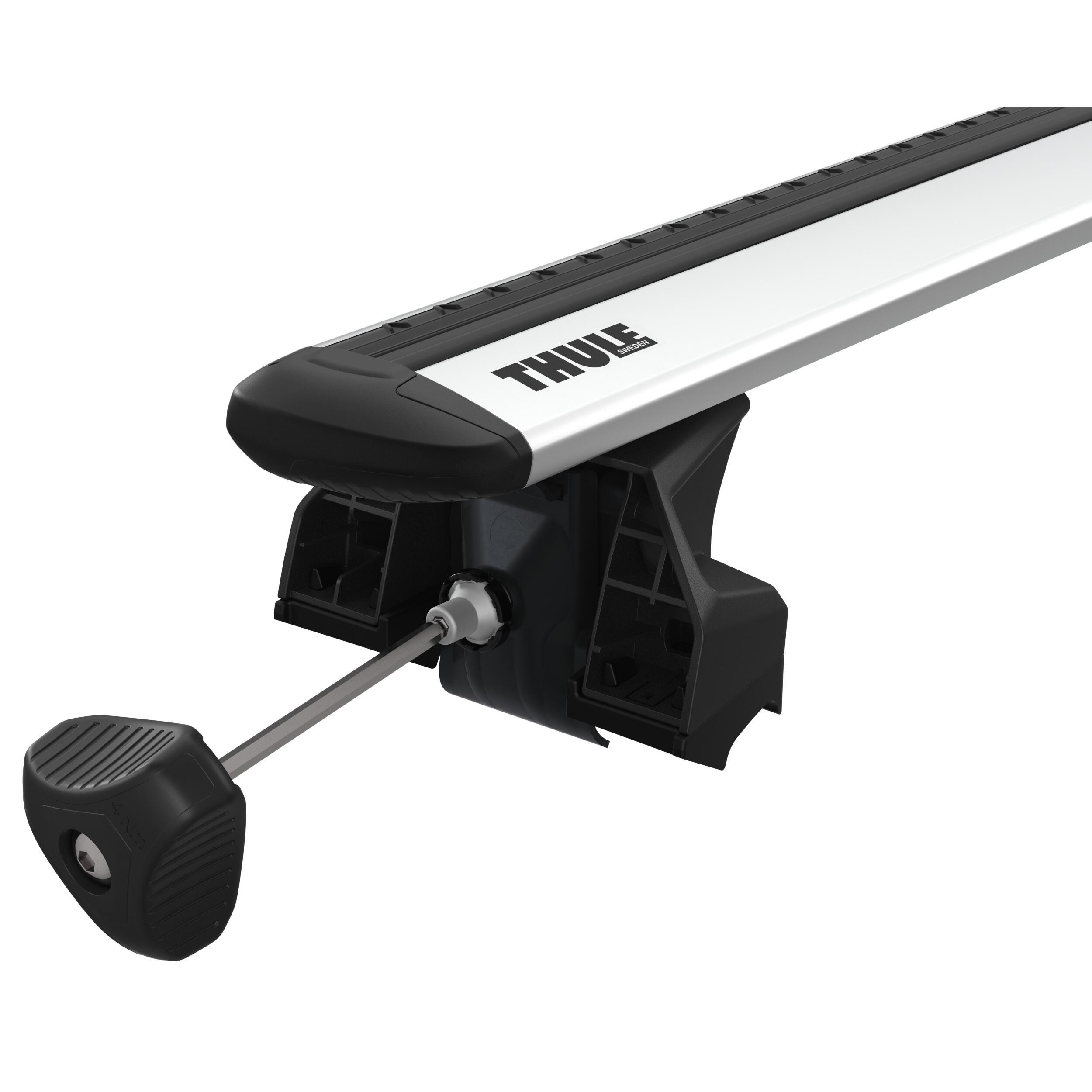 Pieds Thule Evo pour barre de toit : Installation facile sur rails longitudinaux, limiteur de couple de serrage et antivols Thule One-Key inclus.