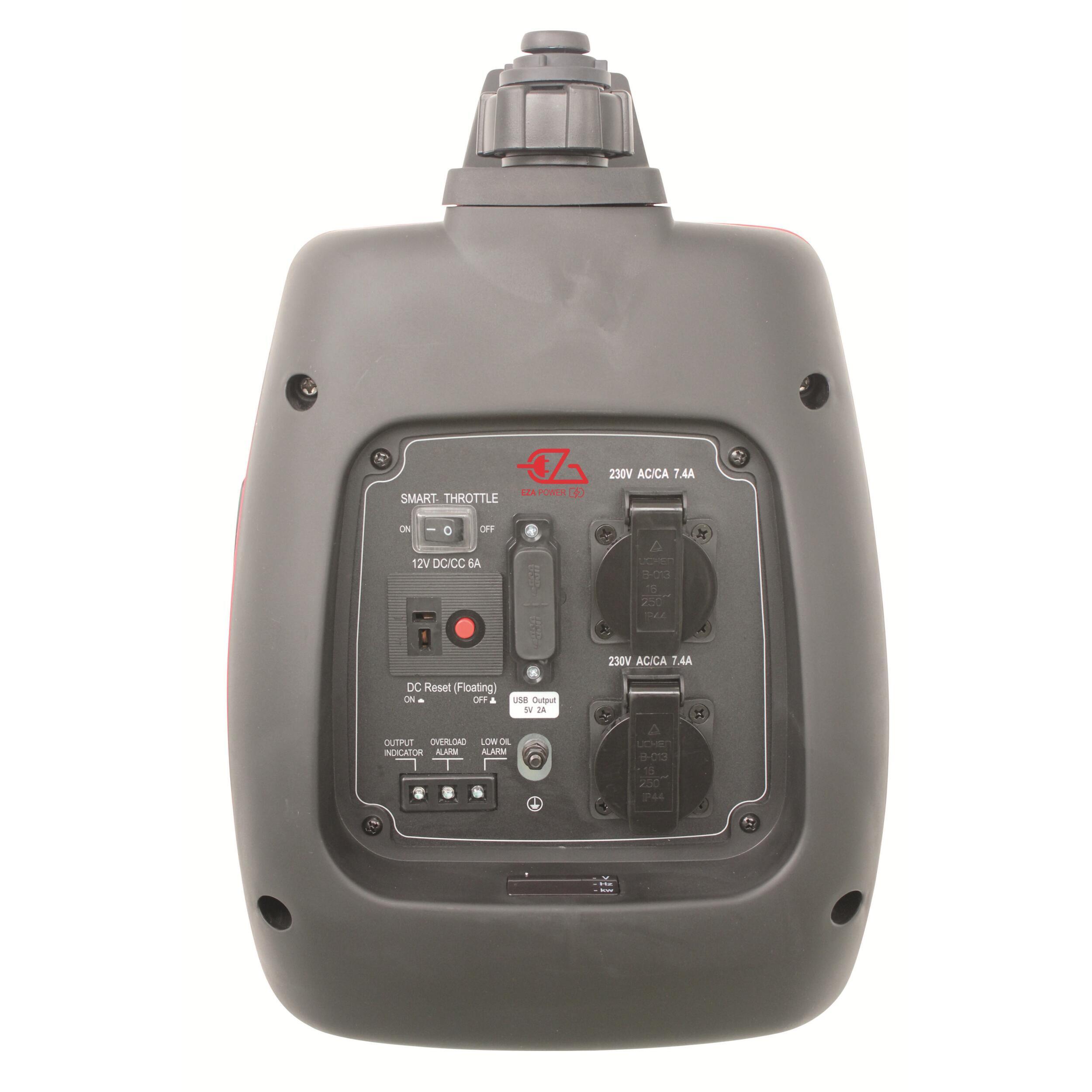 Groupe électrogène portable Eza avec technologie Inverter 50Hz, courant 220V sinusoïdal, mode économique, démarrage par pompe d’amorçage et ports USB intégrés.