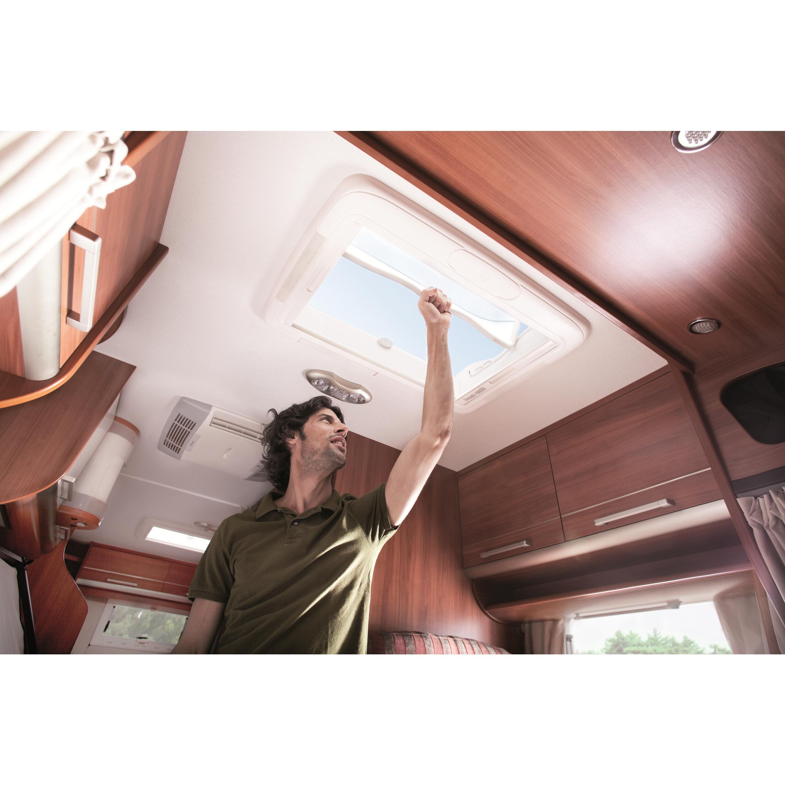 Le dôme en verre acrylique double vitrage assure une isolation thermique et phonique optimale. À l'intérieur, un contre-cadre en polyuréthane est équipé d'un store occultant et d'une moustiquaire ajustables individuellement, vous protégeant efficacement du soleil et des insectes.