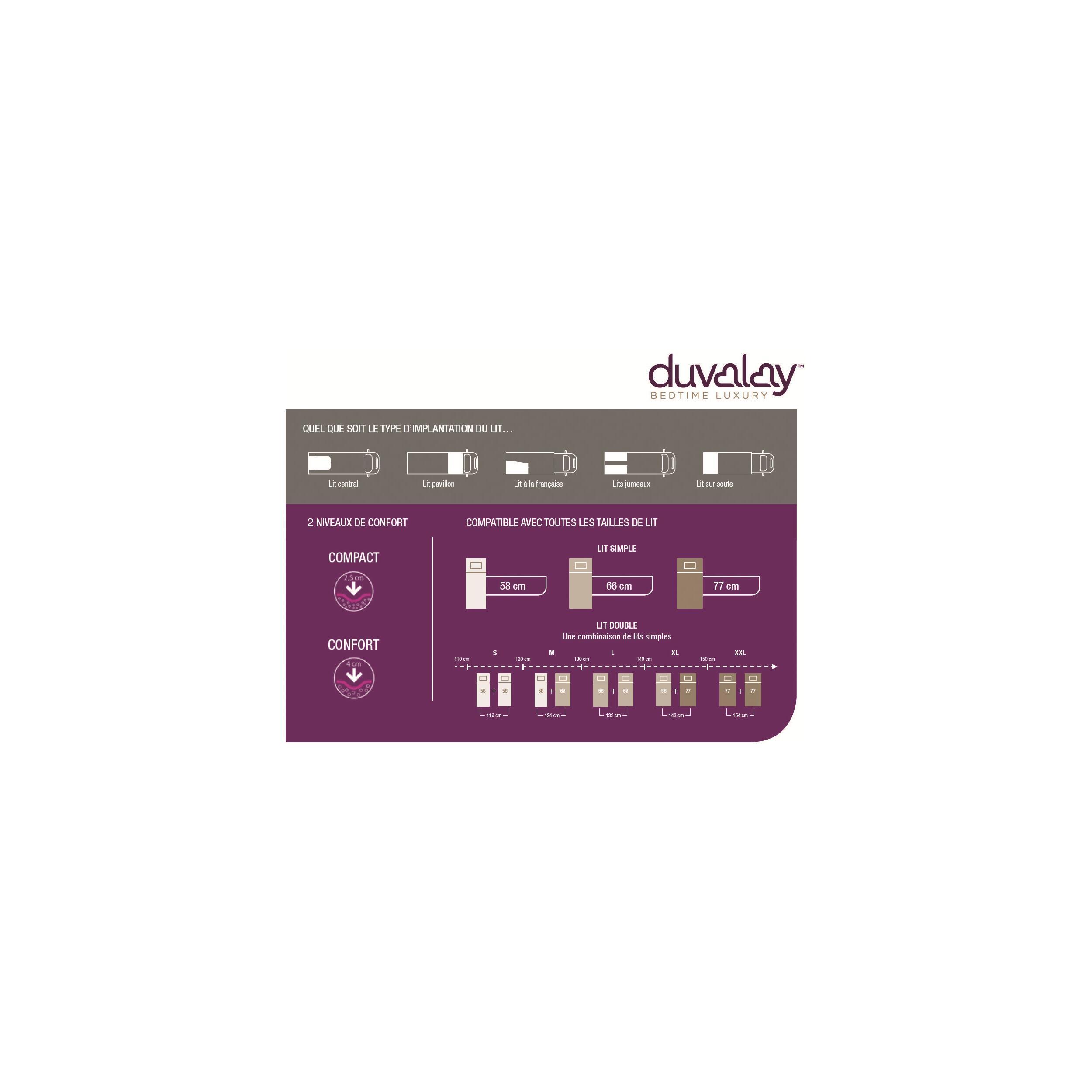 Le couchage grand confort Duvalay est conçu pour répondre aux besoins des voyageurs en quête de confort et de simplicité. Composé d’un sur-matelas à mémoire de forme de 2,5 ou 4 cm, il améliore instantanément le confort des couchages souvent rudimentaires des camping-cars, vans ou caravanes. Associé à une couette toute saison, il vous garantit des nuits douillettes quelle que soit la température extérieure.