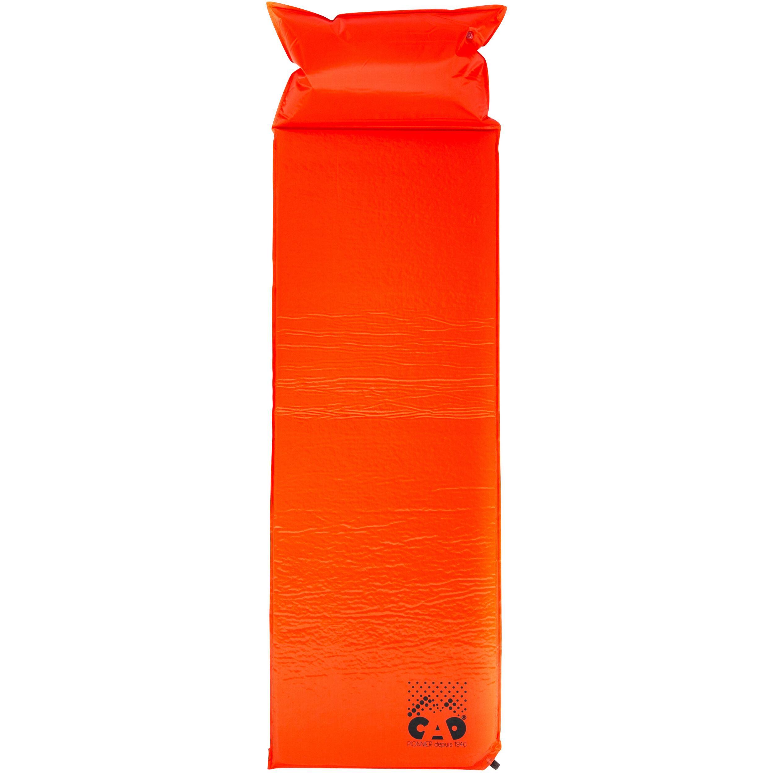 Matelas pneumatique autogonflant avec un oreiller intégré et une housse de transport avec sangles de serrage.