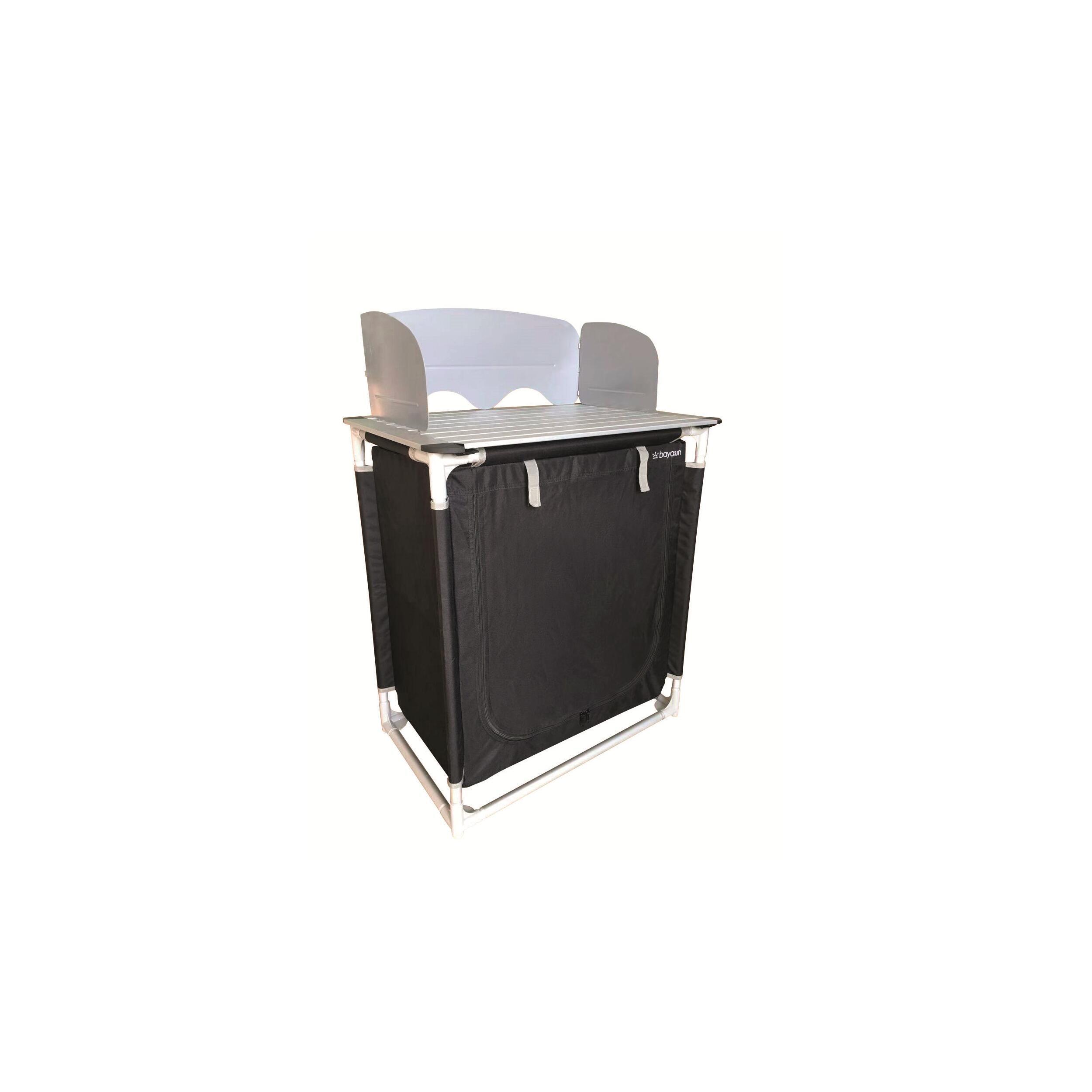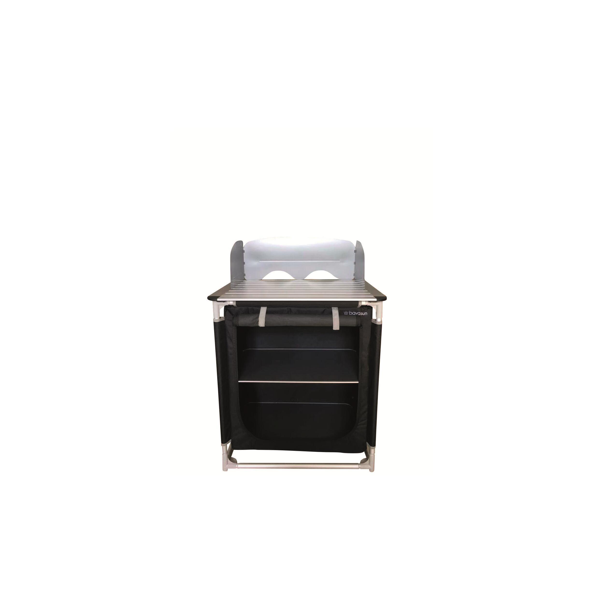 Meuble cuisine avec un plan de travail avec pare-flamme et 2 étagères. Simple et rapide à installer. Rangement compact dans son sac (fourni).