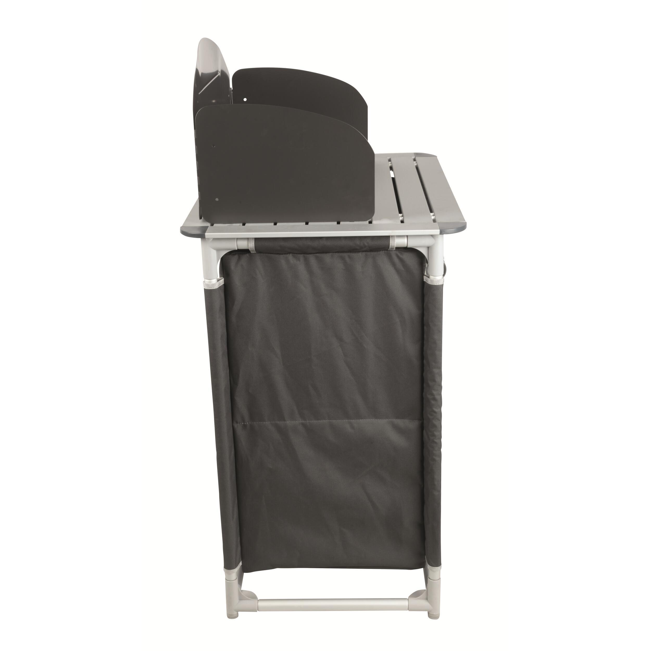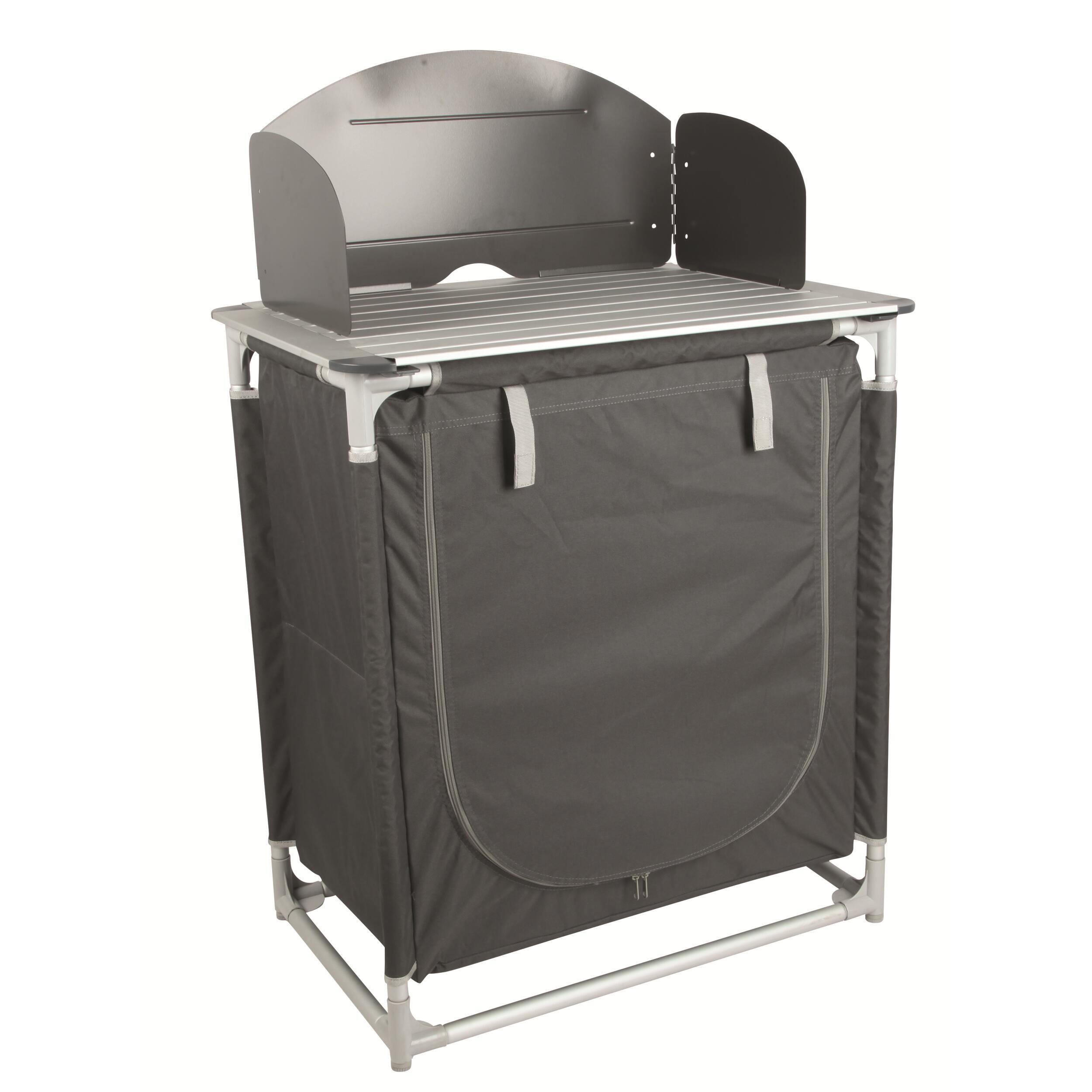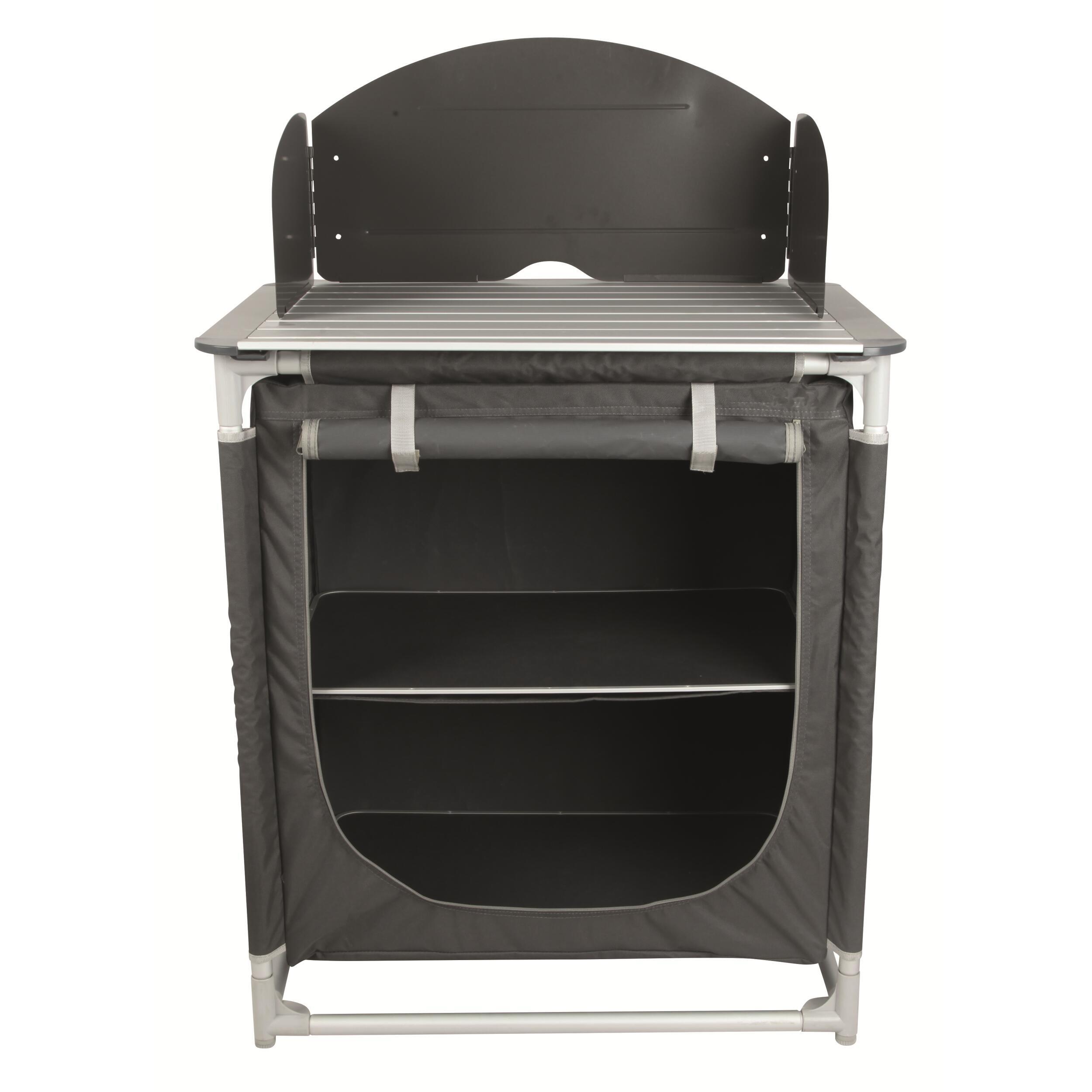 Meuble de cuisine compact, stable et rapide à monter, avec structure en aluminium, toile 600D et plateau vissé. Idéal pour les campeurs qui veulent cuisiner confortablement.
