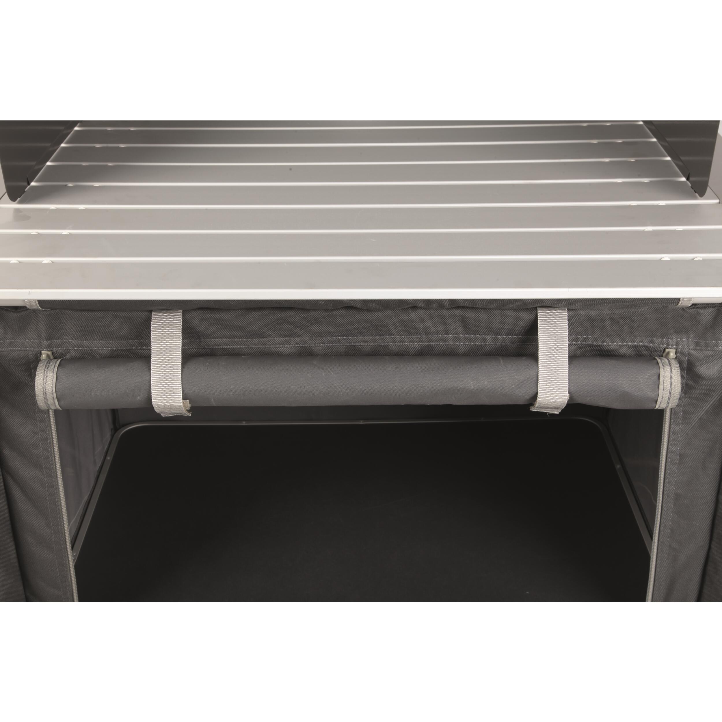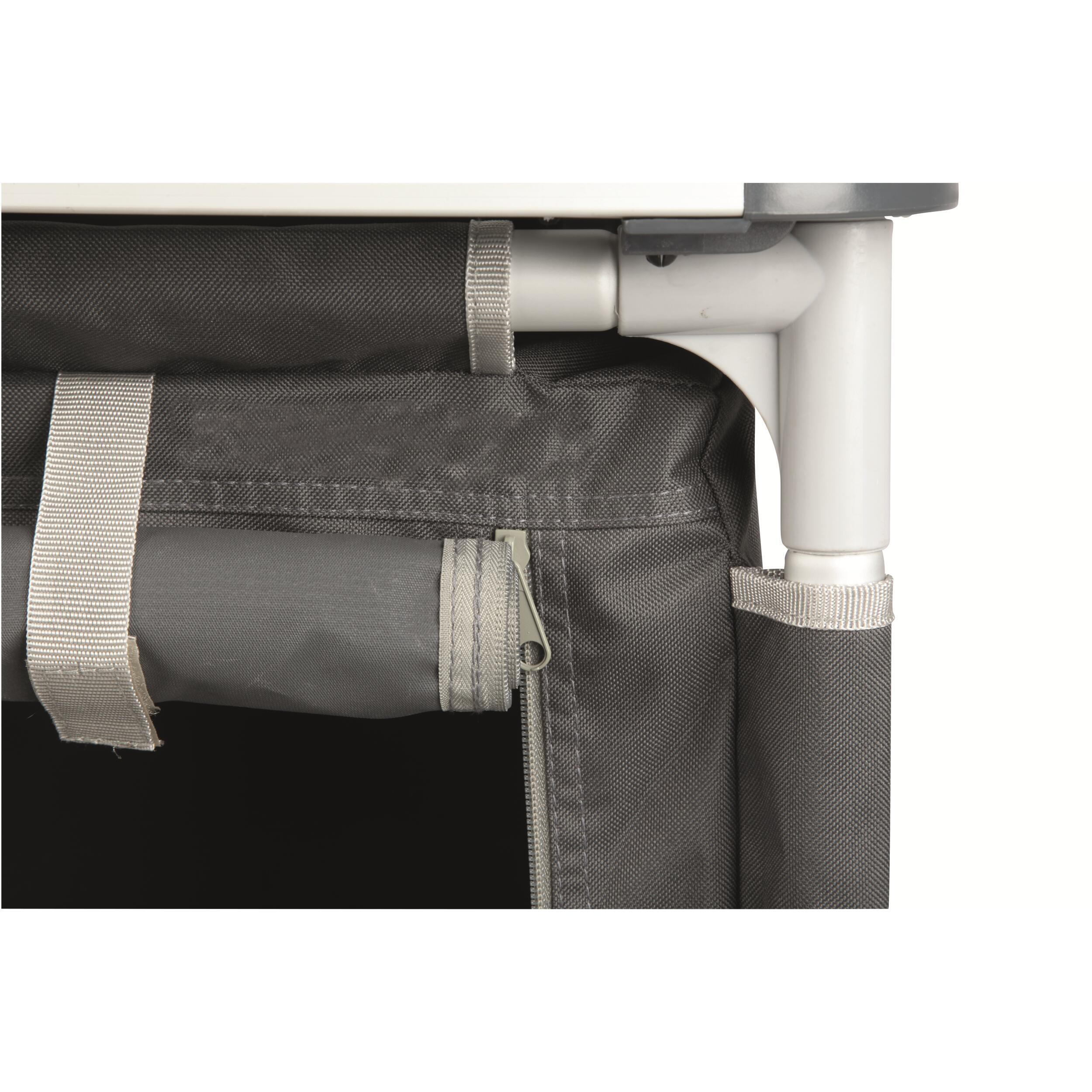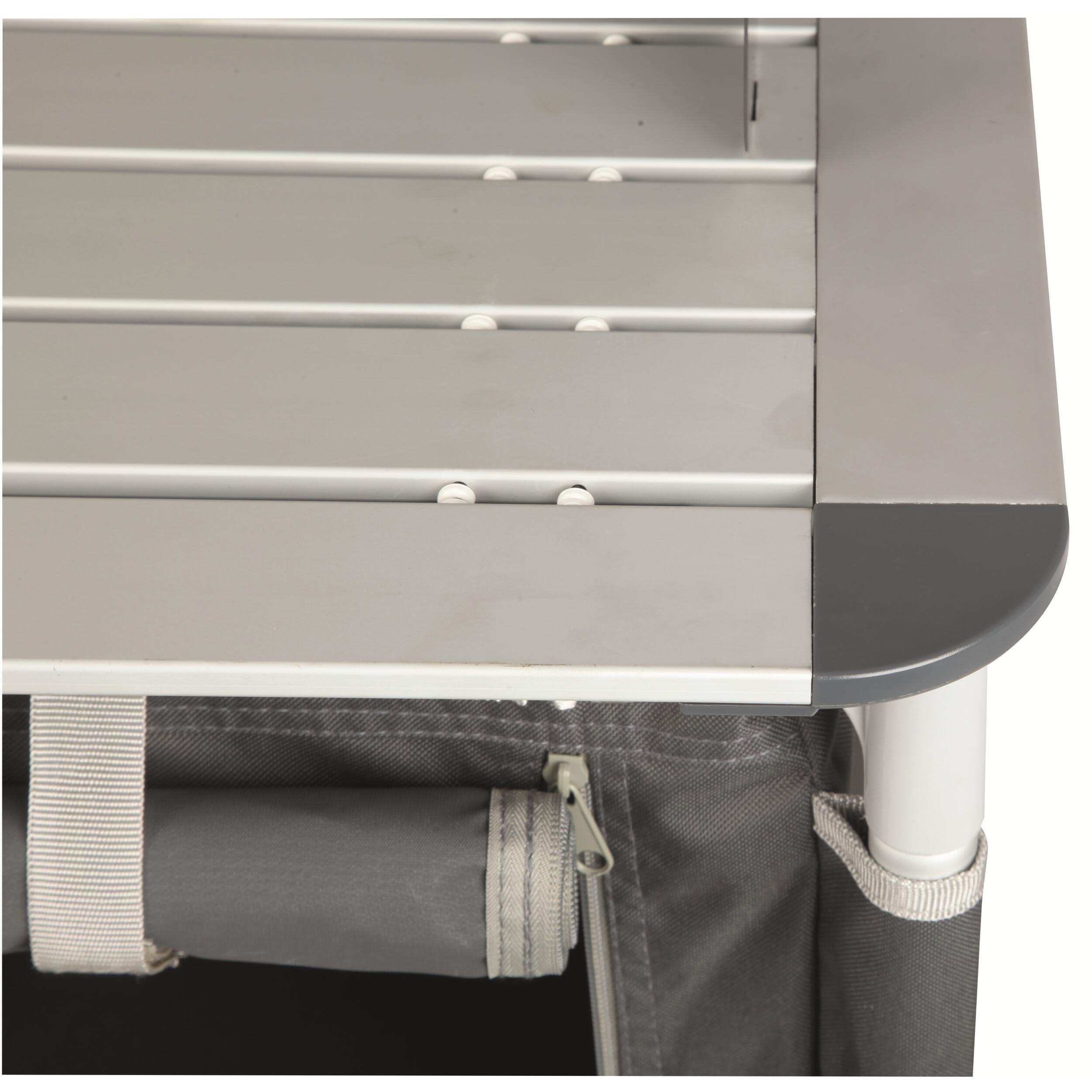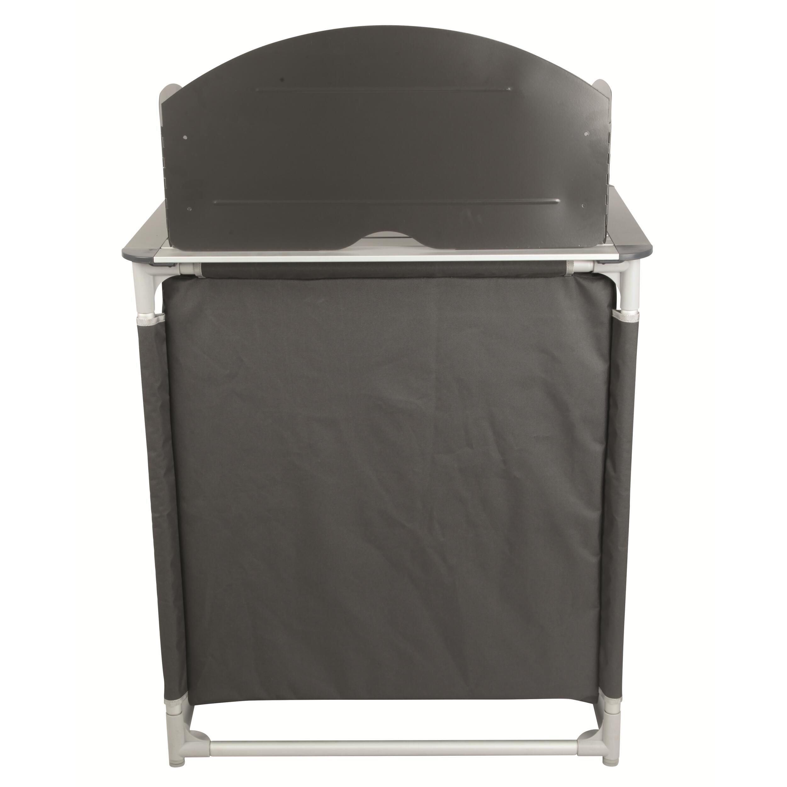 Meuble de cuisine compact, stable et rapide à monter, avec structure en aluminium, toile 600D et plateau vissé. Idéal pour les campeurs qui veulent cuisiner confortablement.