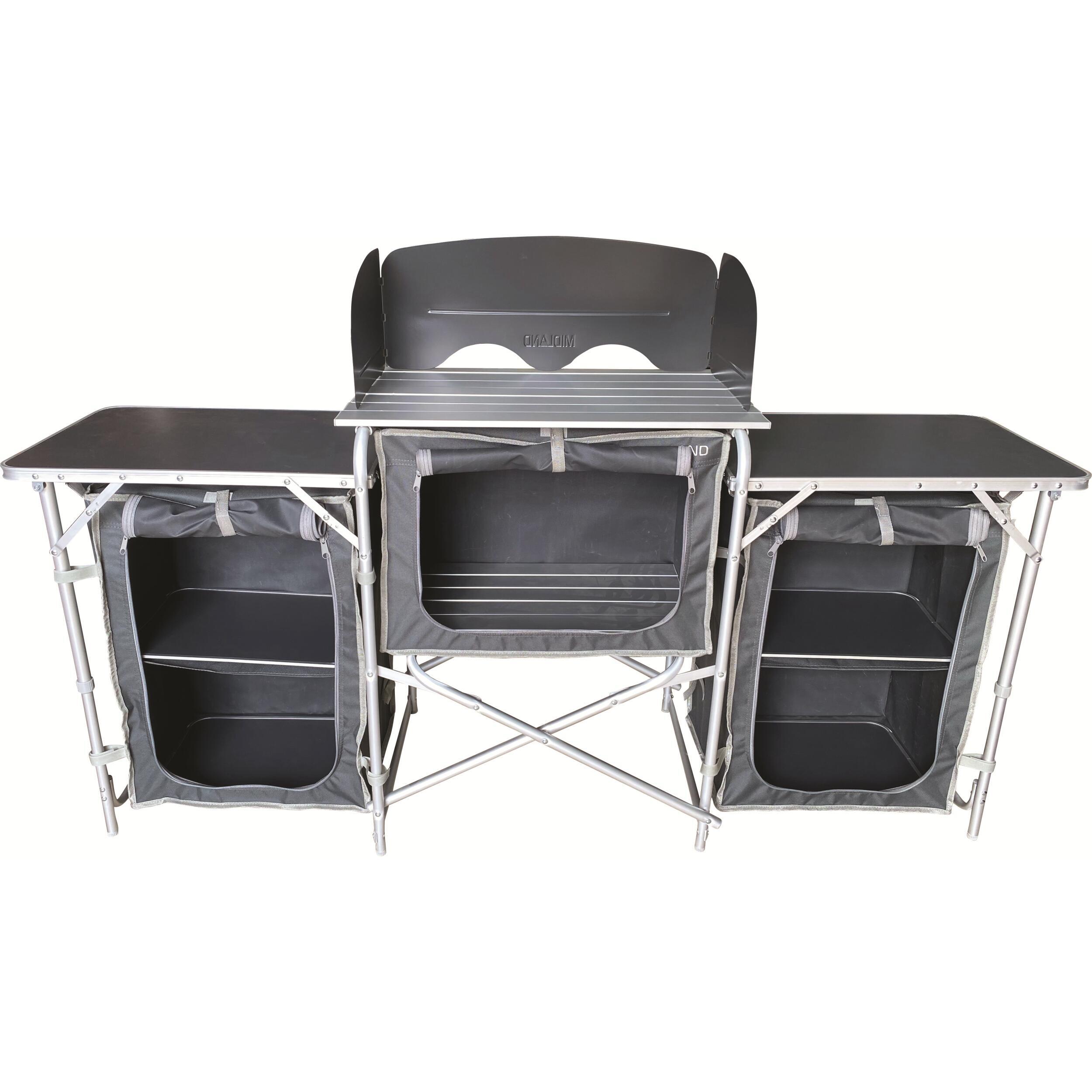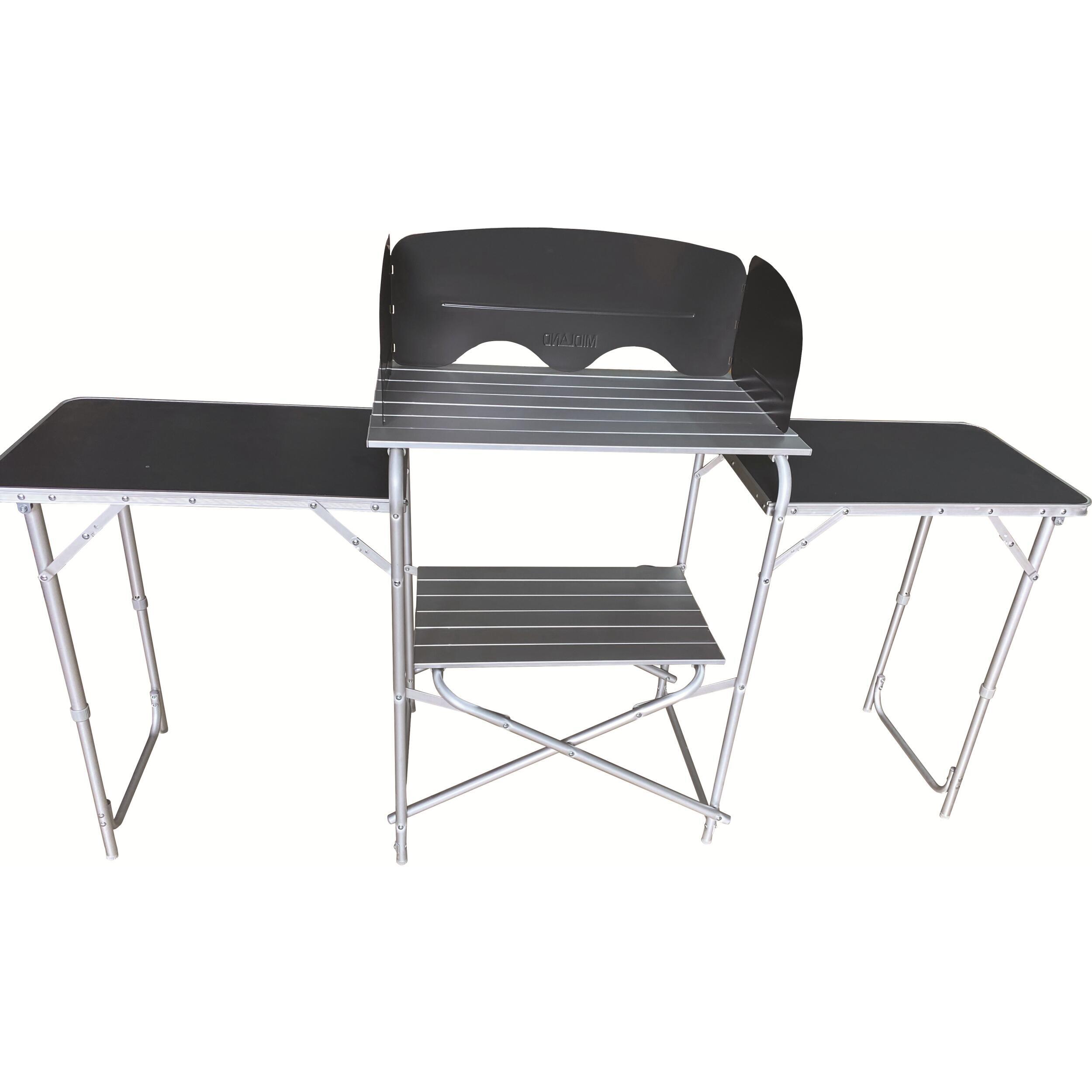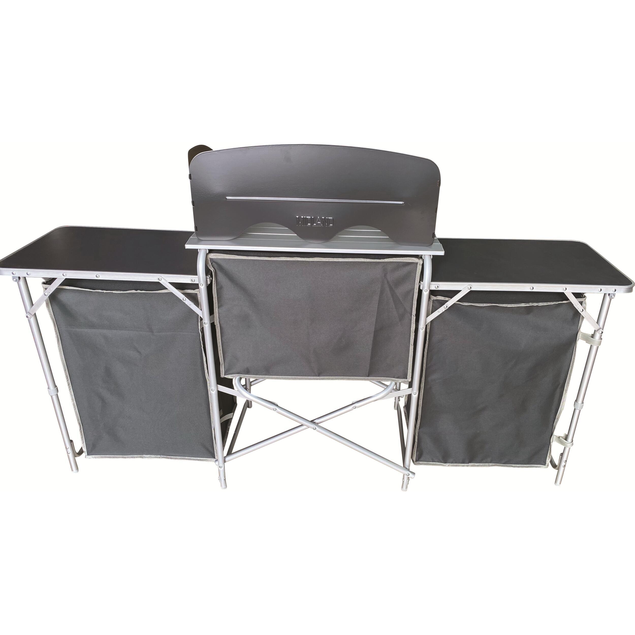 Meuble de cuisine très pratique composé de 3 plans de travail et de 5 étagères. Emplacement pour réchaud avec pare-flamme. Rapide à monter et à ranger. Très compact une fois plié.