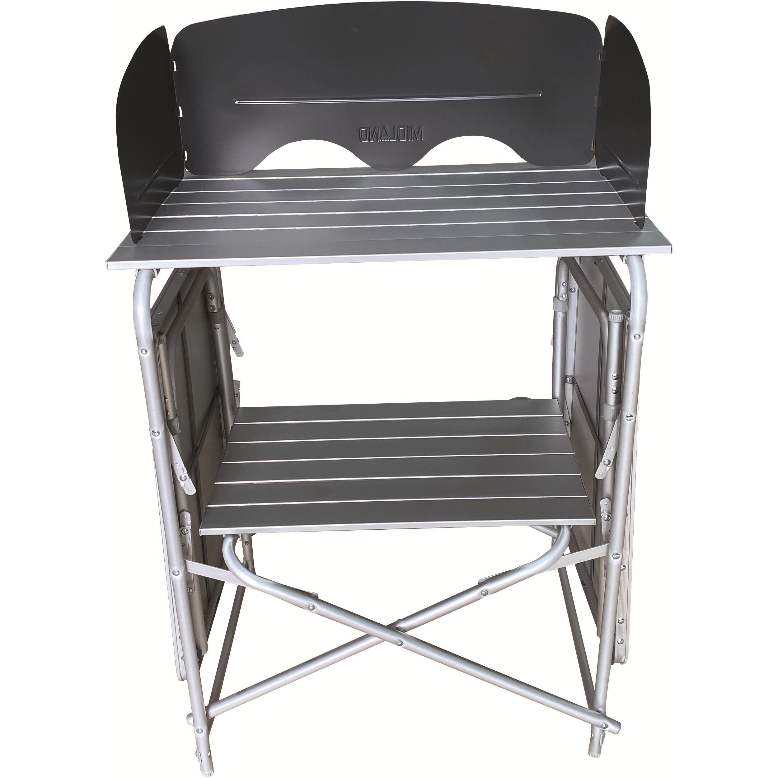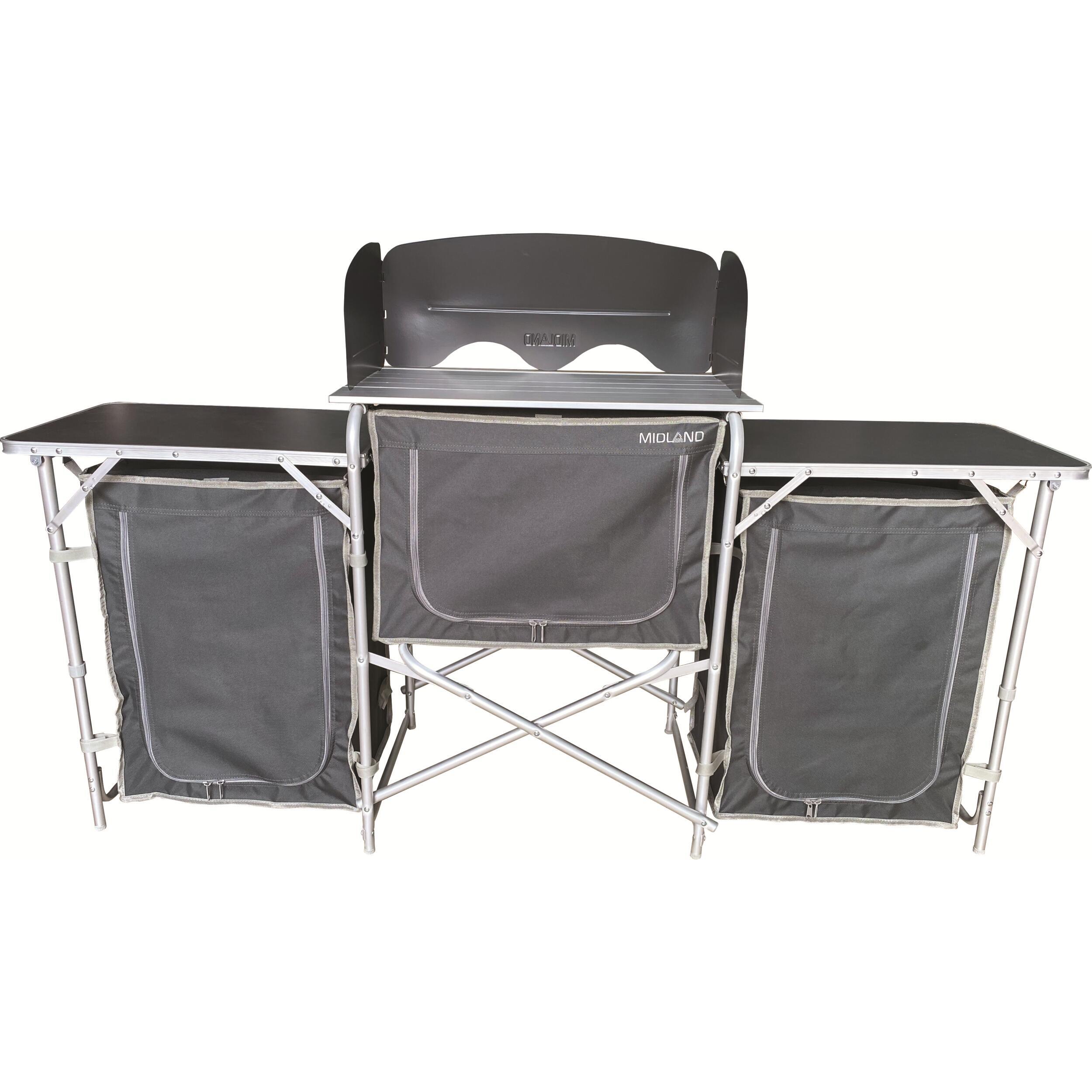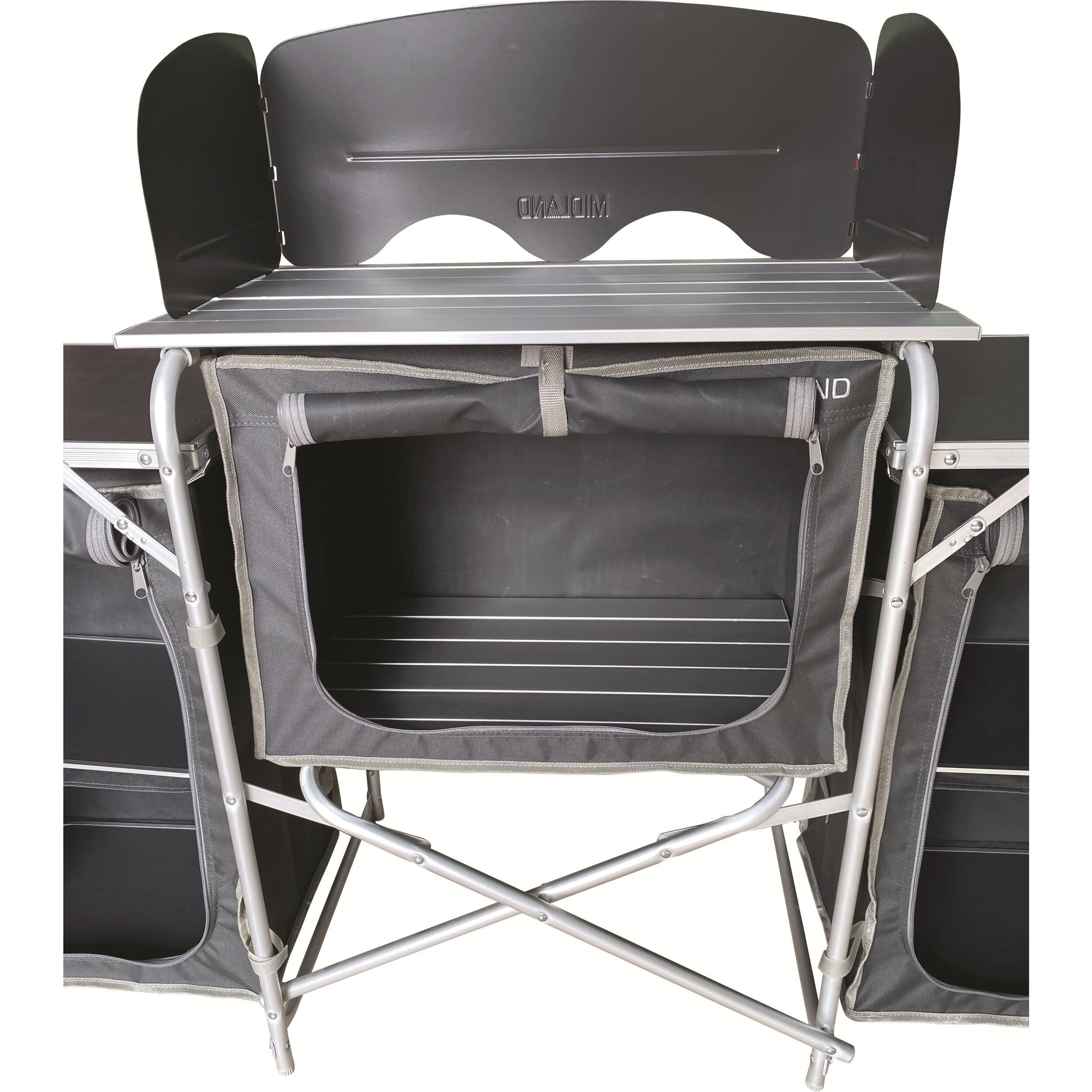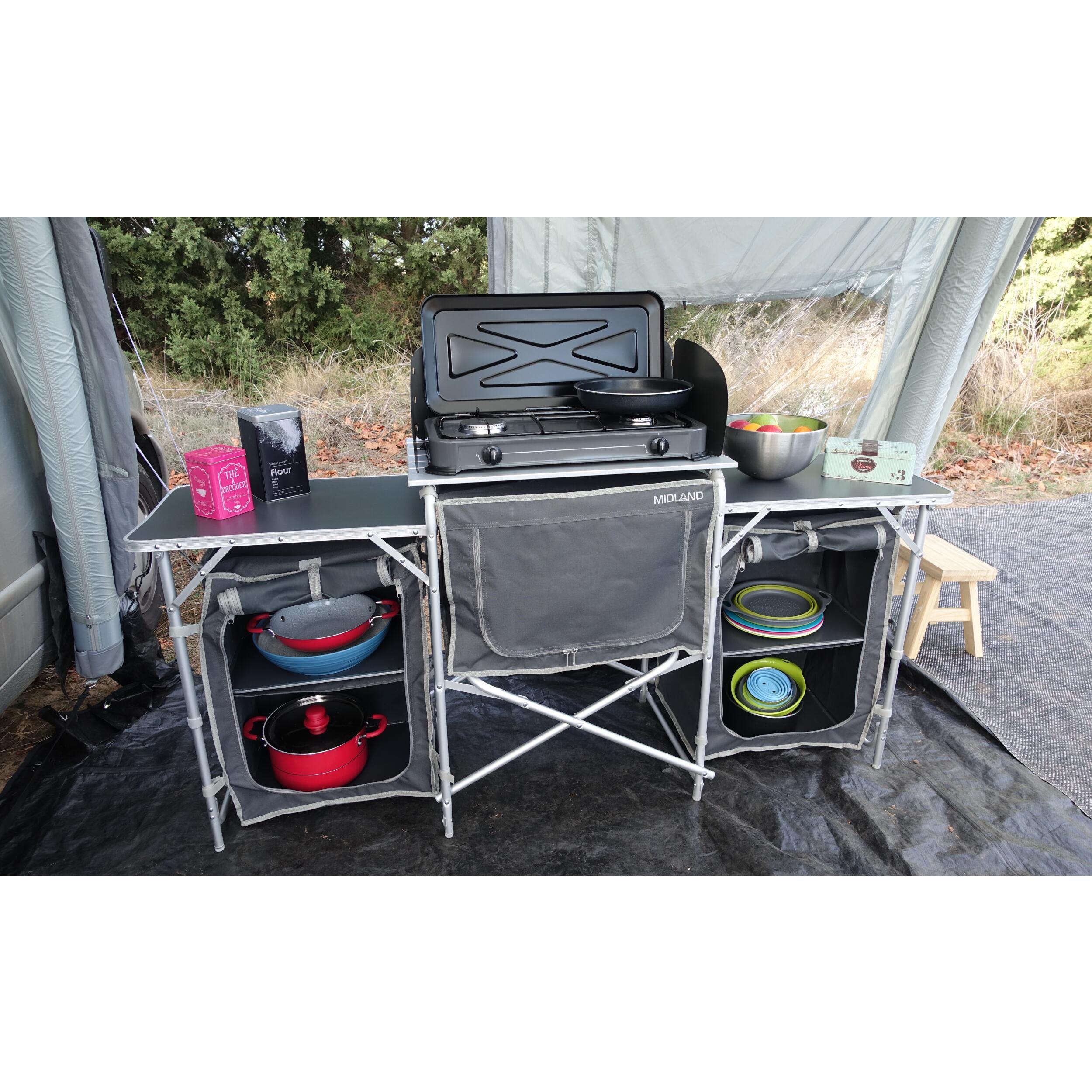 Meuble de cuisine très pratique composé de 3 plans de travail et de 5 étagères. Emplacement pour réchaud avec pare-flamme. Rapide à monter et à ranger. Très compact une fois plié.