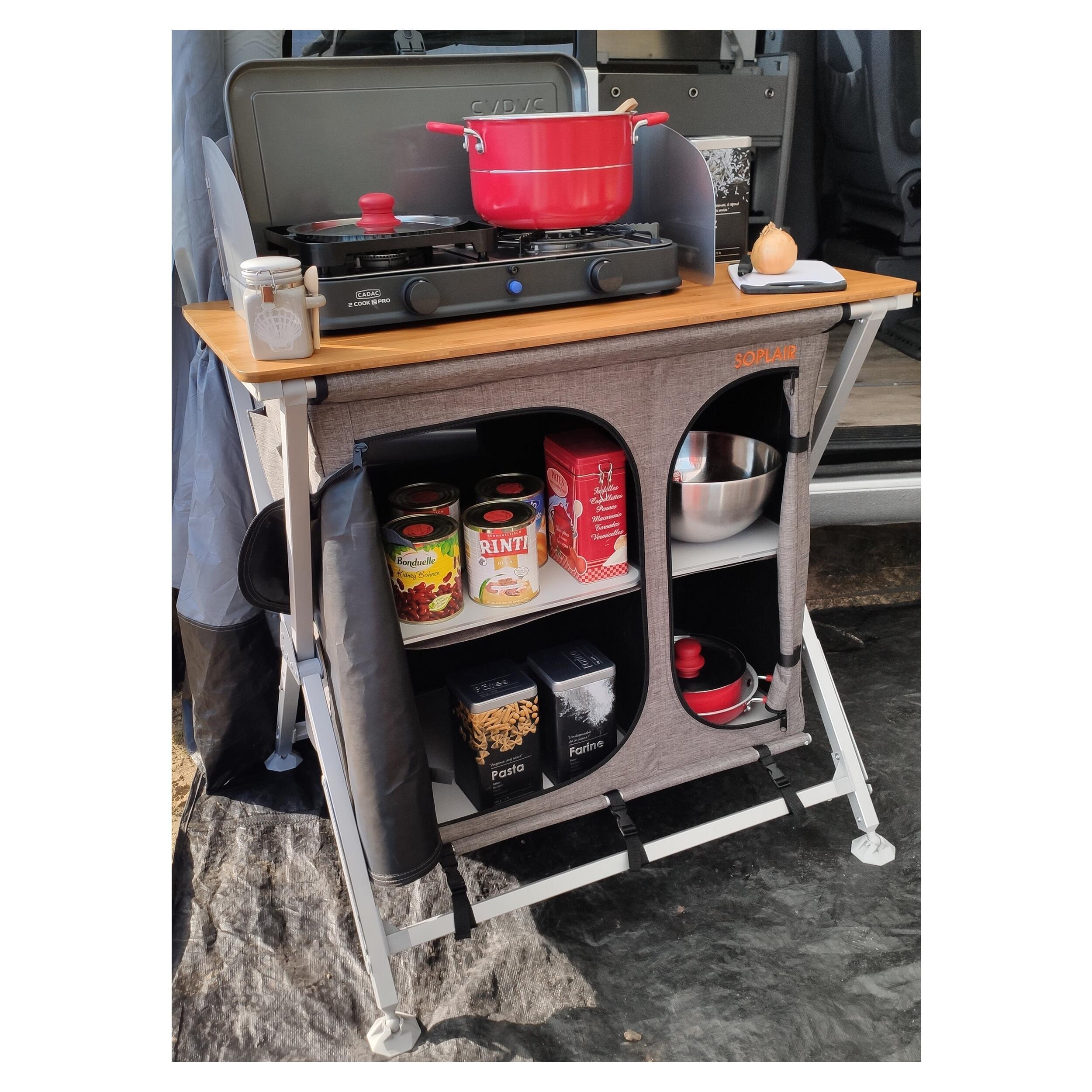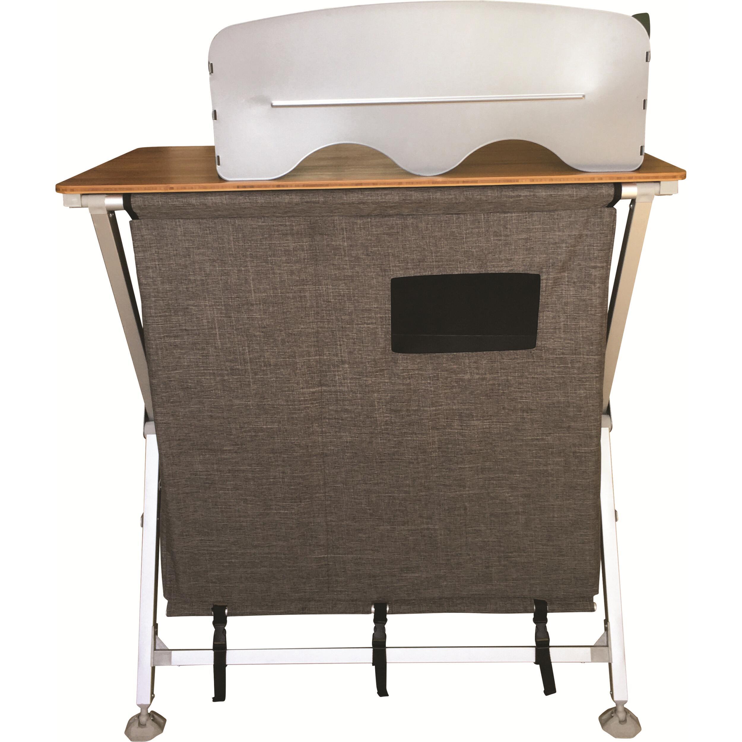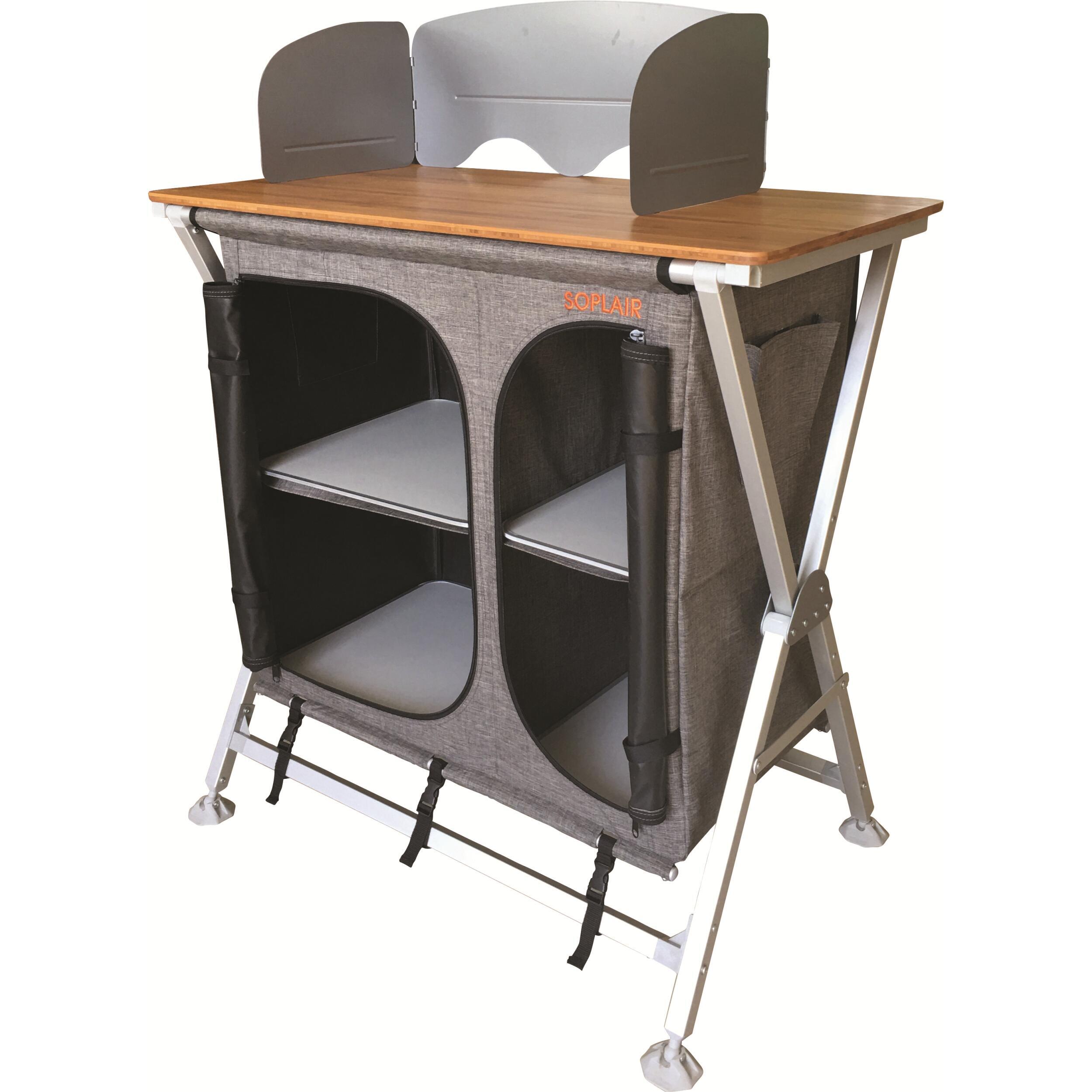 Meuble de cuisine avec plan de travail en bambou naturel et armature pliante en aluminium. Equipé de quatre espaces confortables de rangement et d’une poche de chaque côté. Un pare-flamme en aluminium vient se positionner sur son magnifique plateau en bambou. Sa toile en polyester enduit PVC possède des aérations afin d’éviter les odeurs de renfermé. Ses pieds à tête rotative vous permettent d’ajuster le meuble aux variations des sols.